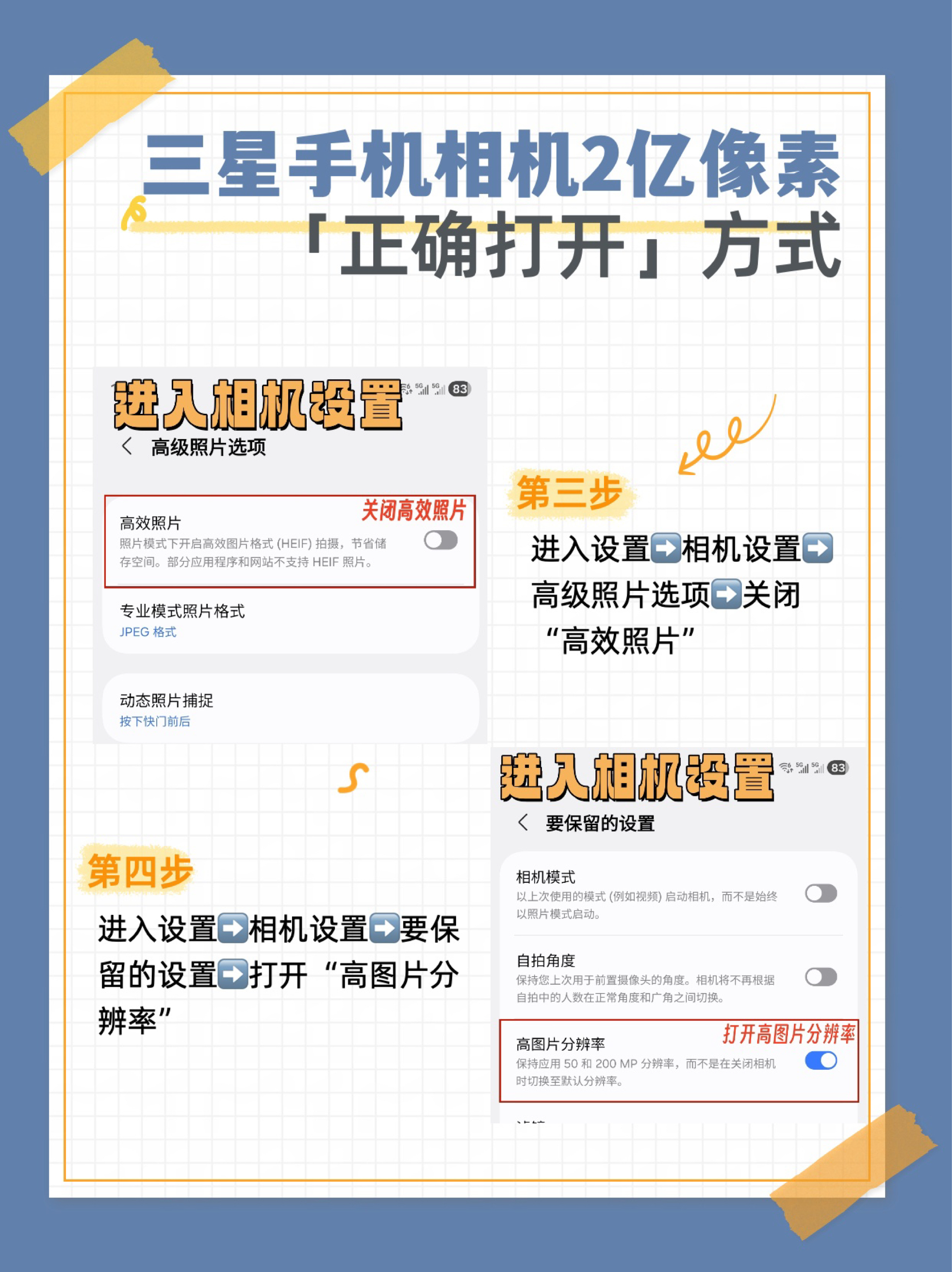 三星手机的2亿像素不是随便用的 1,需要手动调整到2亿选项 2,需要设置 3:4照片比例 3,需要关闭高效照片 想要保持这个设置,还需要打开保留设置中的「高图片分辨率」 这才是三星手机2亿像素的满血发挥。