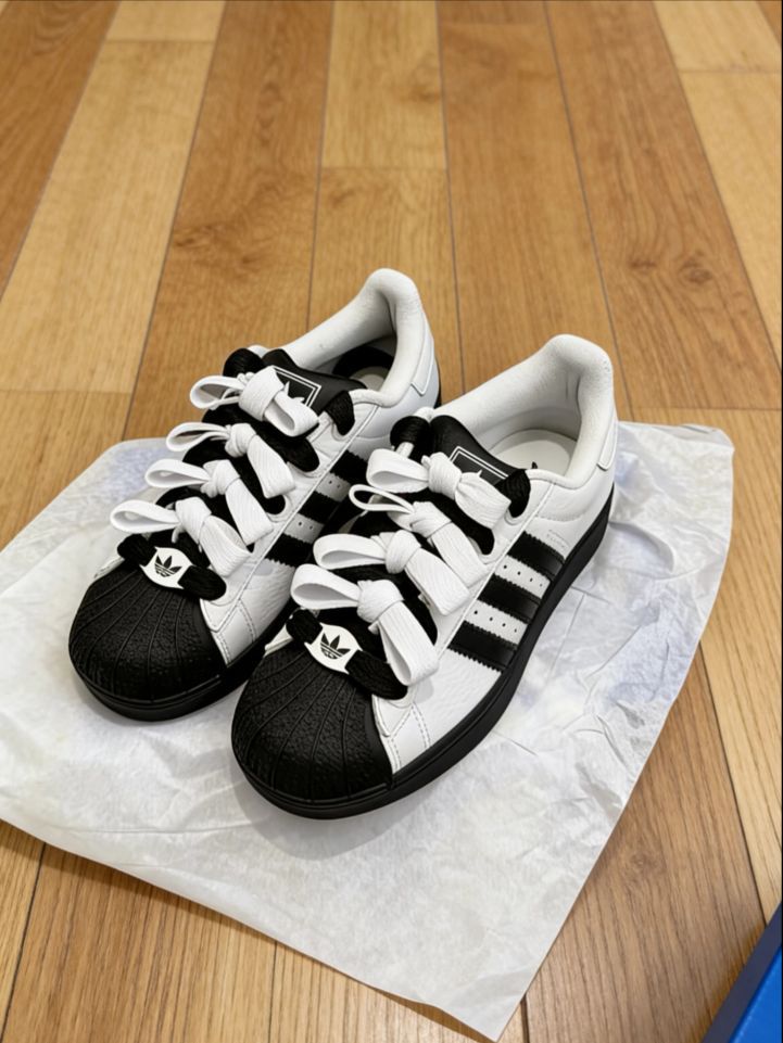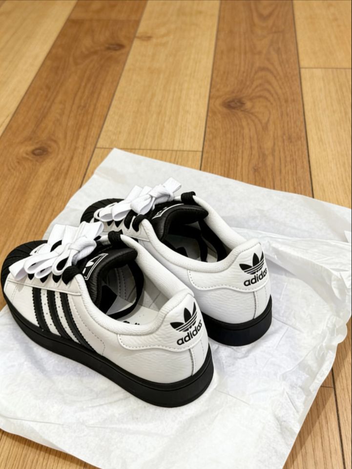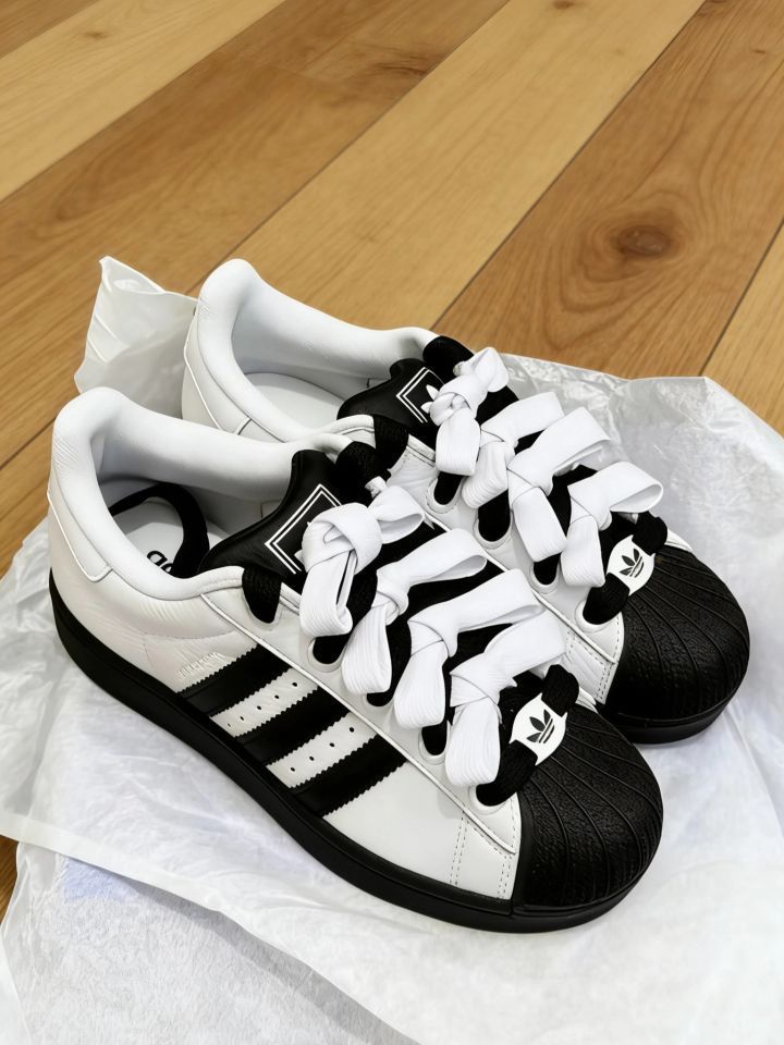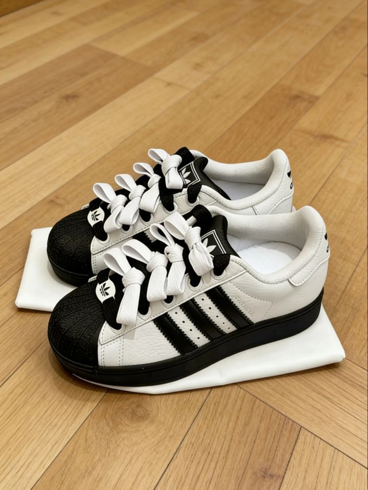 这双阿迪达斯Superstar真的太绝了!纯白鞋身配黑贝壳头,经典黑白撞色永远不会过时。光滑皮革质感超棒,摸起来细腻又有光泽。最爱的就是那个蝴蝶结鞋带设计,瞬间让运动鞋变得甜美起来~ 侧面三条黑纹辨识度超高,三叶草logo低调有型。穿牛仔裤、短裙都超百搭,日常逛街、上学、拍照都能hold住。鞋底厚实走路很舒服,复古中带着点小俏皮,真的太好搭了!😍