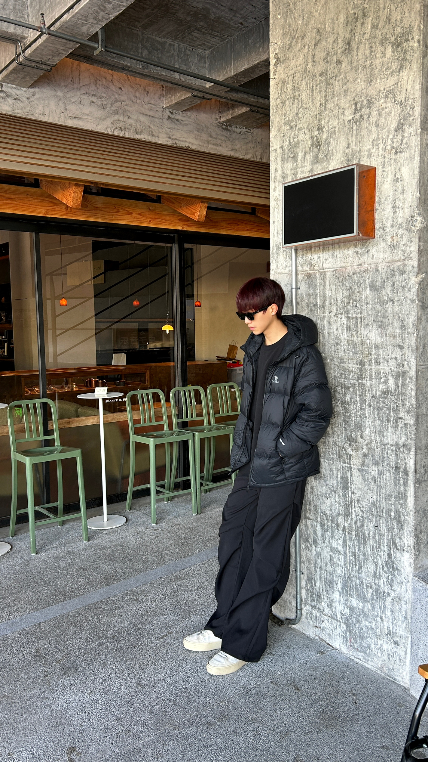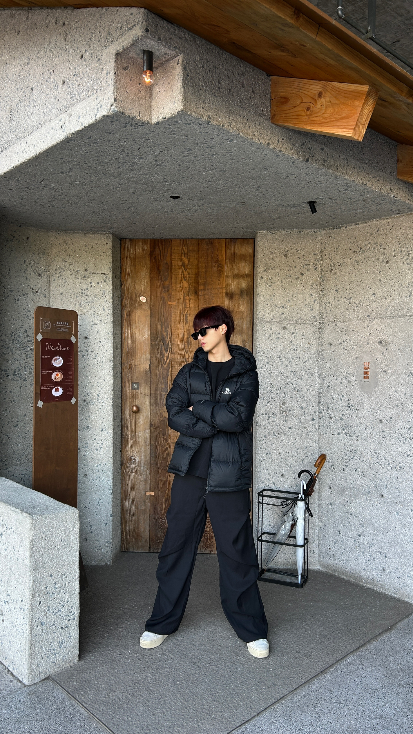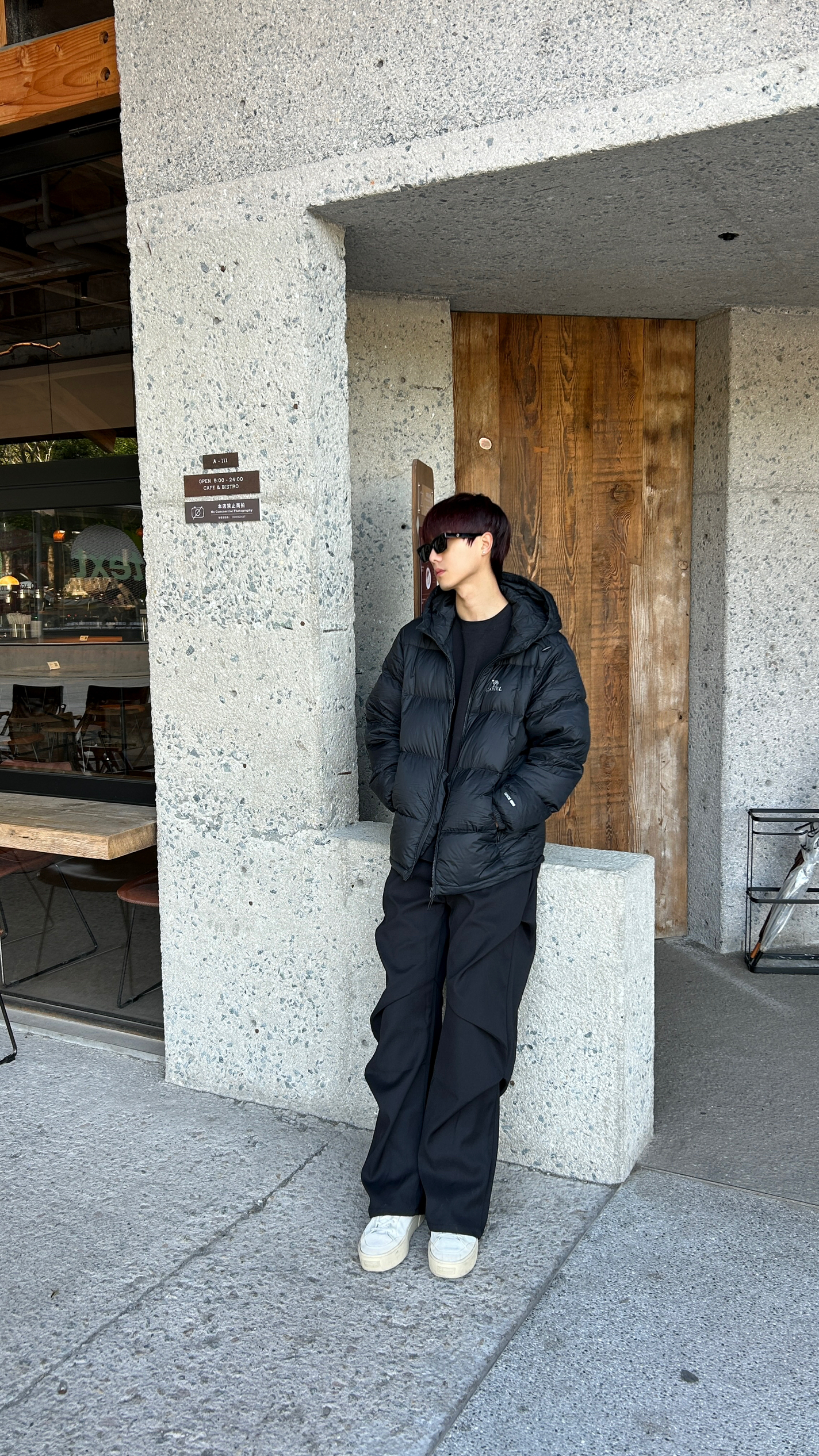 早早出门去喝咖啡 不想费力搭配穿搭一身黑准没错 今天的look即使是同色系也很有层次感 一件蓬蓬穿着很暖的羽绒服 再搭配一条垂直感很不错的西裤 裤子就是我今天穿搭的点睛之笔 褶皱设计就很有层次感 宽松的版型穿起来更挺括更舒服 简单又有效的All black你学会了嘛