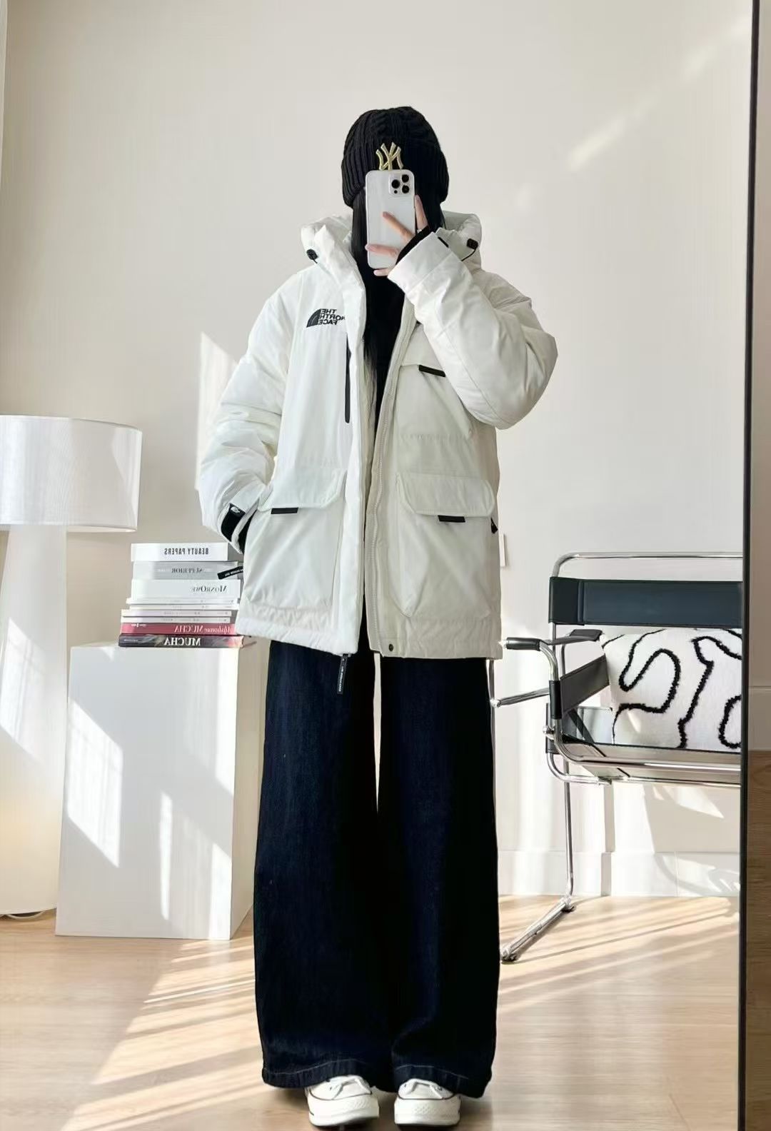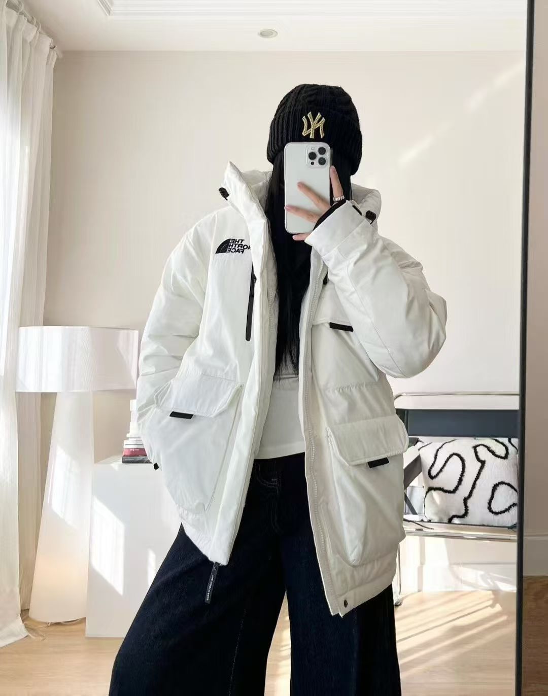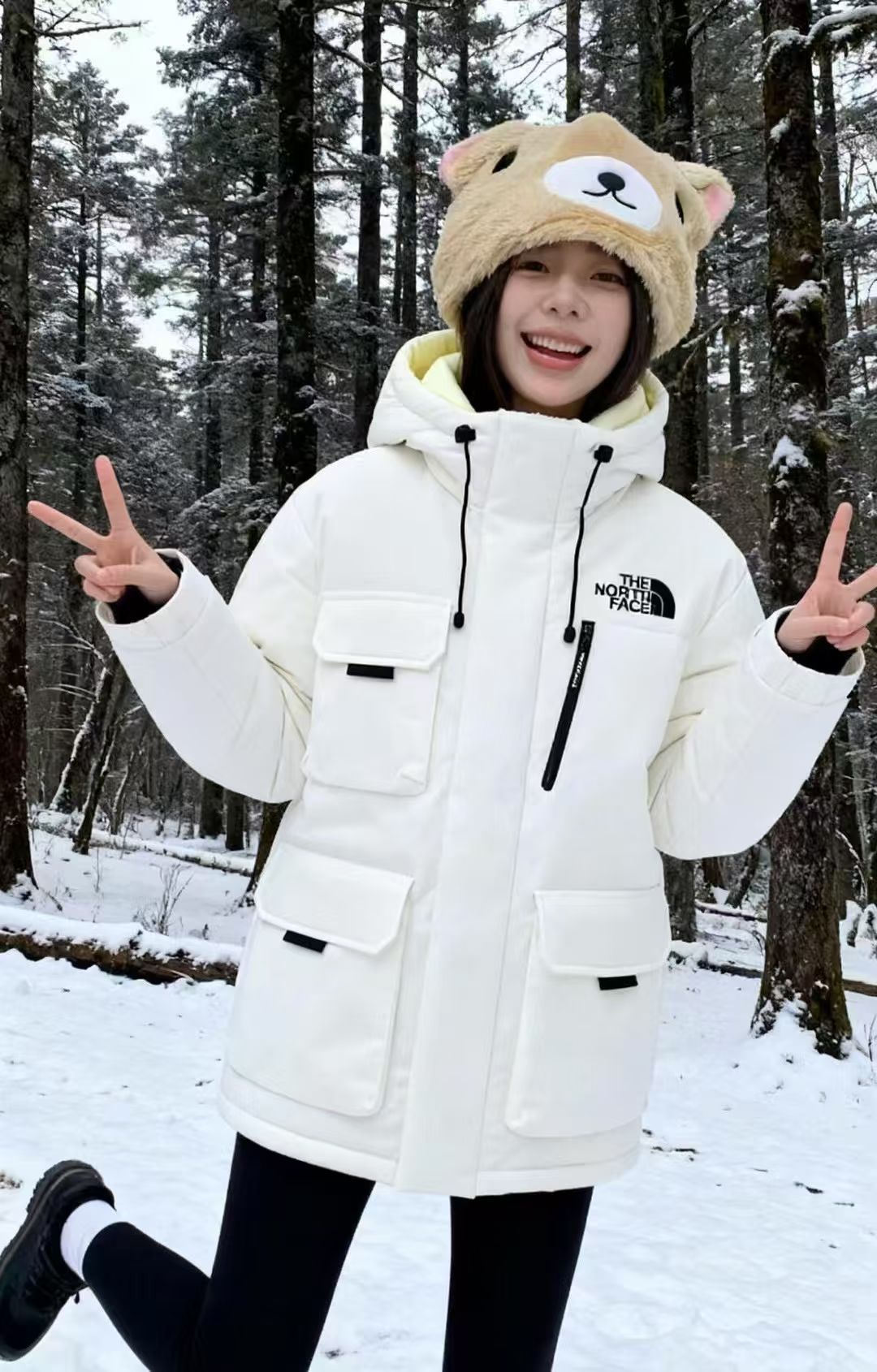 北面这款白色羽绒服太会了! 连帽+多口袋设计 工装感拉满! 内里加绒+厚实填充,雪地里跑跳都暖乎乎🔥