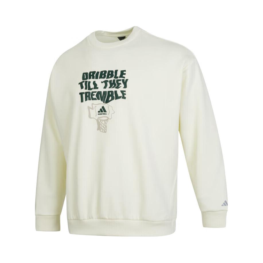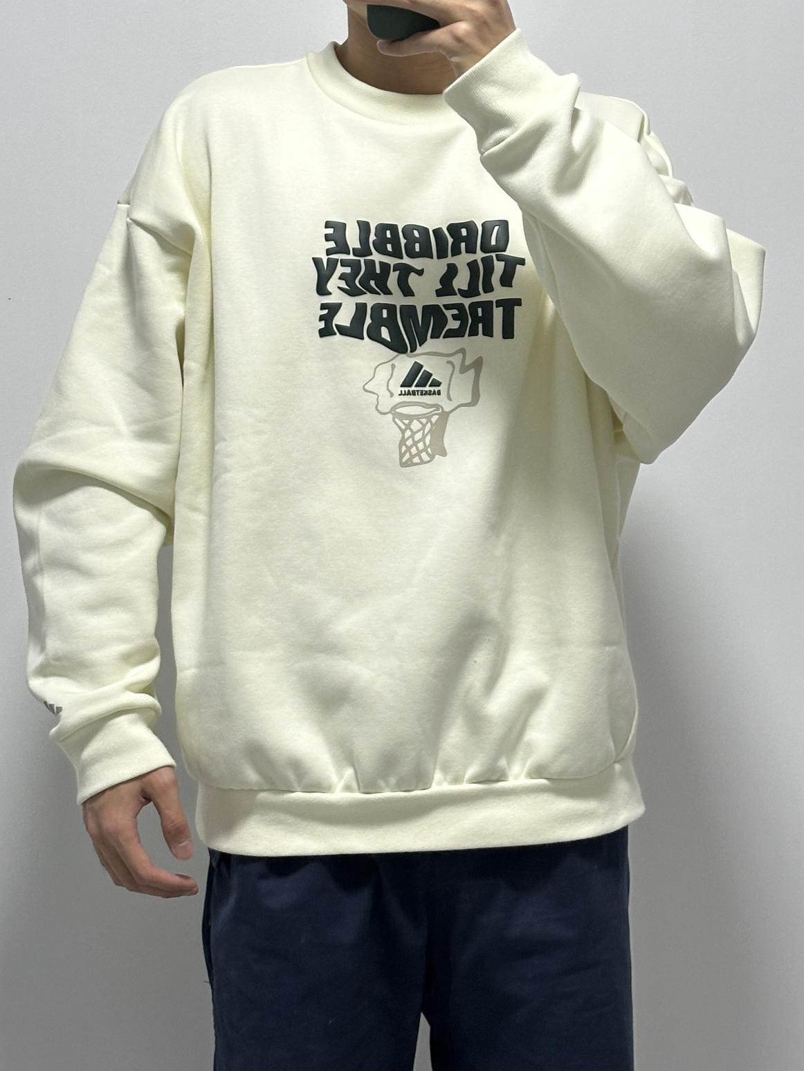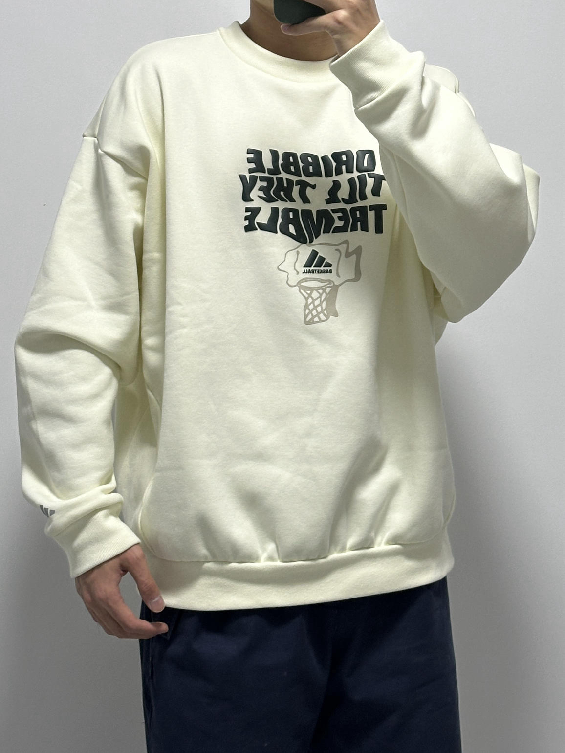 阿迪篮球风卫衣也太戳我了!米白底色搭配黑色印花,视觉上就很干净舒服,字母和篮球图案的设计还带点街头感🏀版型是宽松的落肩款,对身材的包容度超赞,随便搭条藏青色束脚裤,慵懒又随性的日常感直接拉满,男生这么穿真的很有少年气