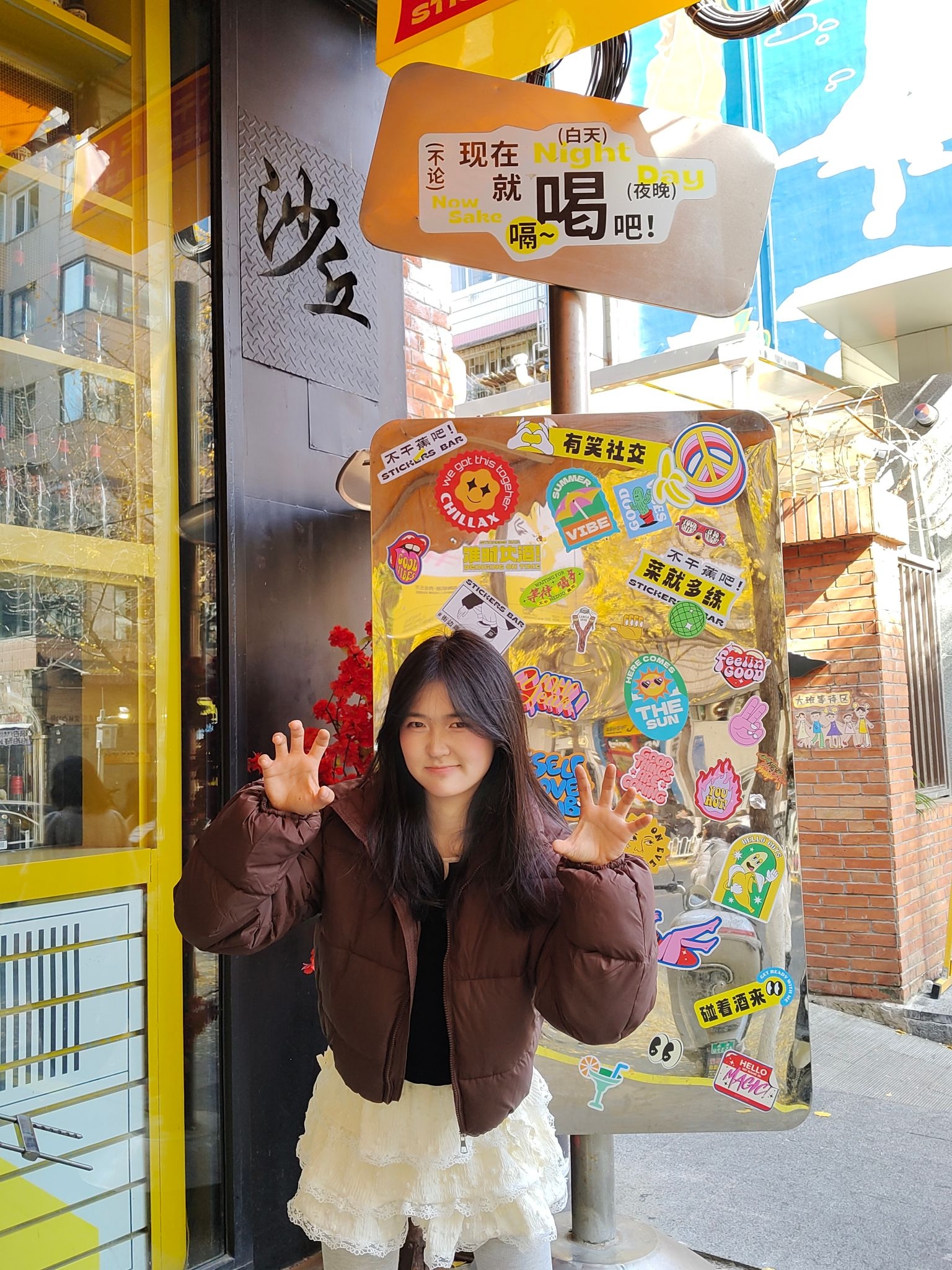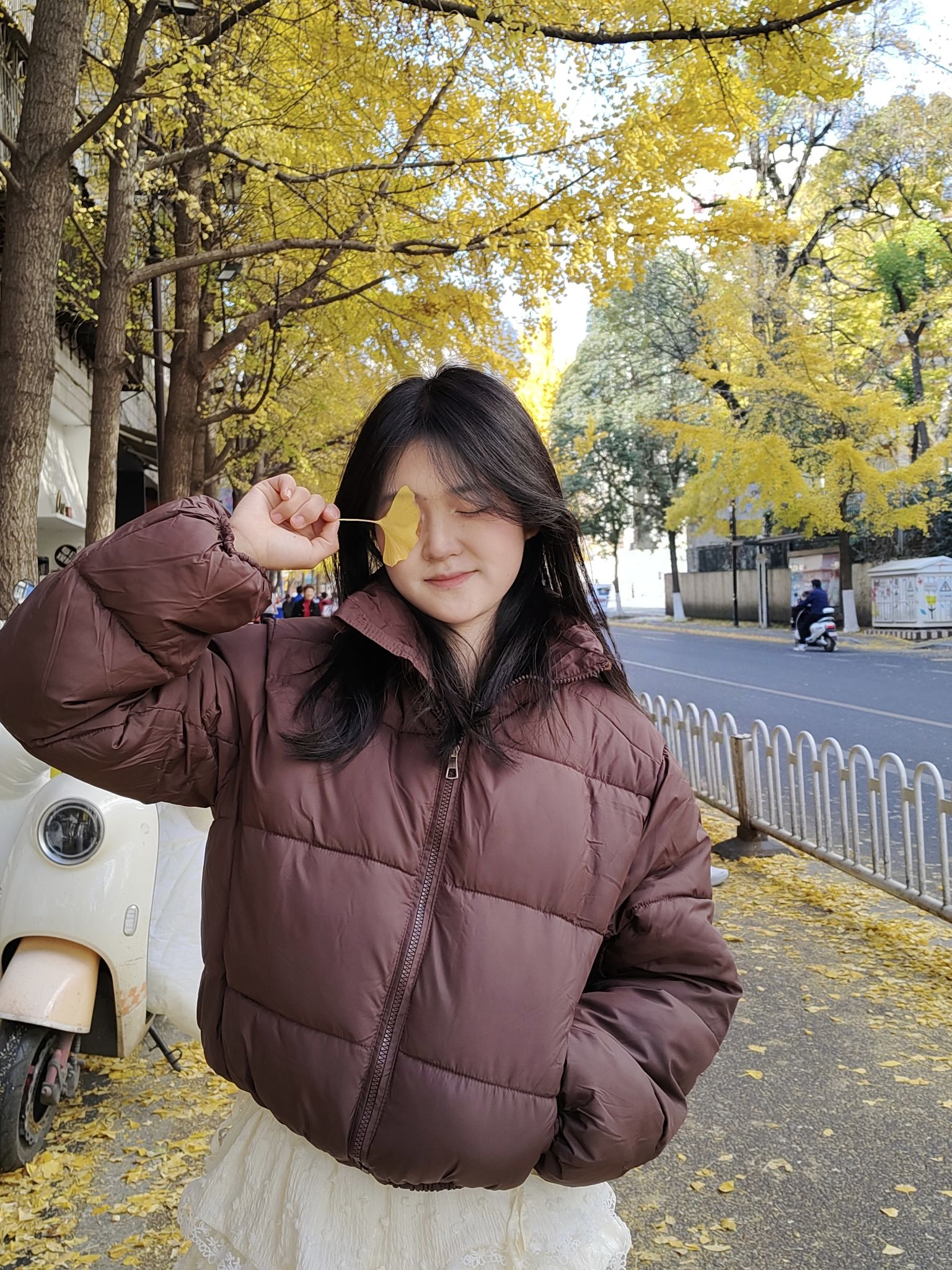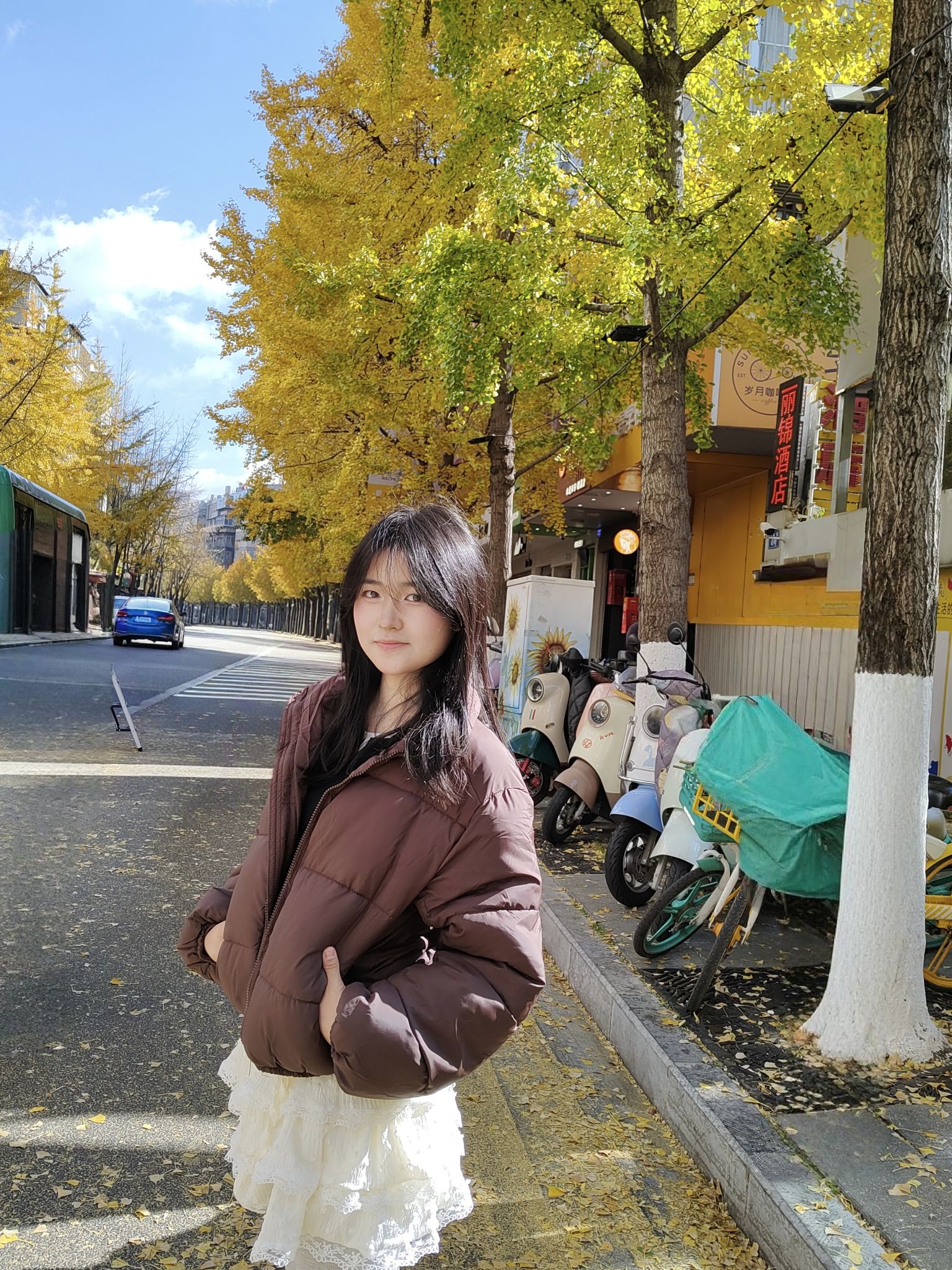 - 上衣:棕红色短款面包服,蓬松的版型自带慵懒感,棕红色调和秋日银杏的暖黄色调适配度超高,既保暖又衬肤色; - 下装:米白色蕾丝蛋糕裙+浅灰色打底袜,柔美的蕾丝裙摆中和了面包服的厚重感,甜妹感拉满,打底袜则兼顾了秋冬的温度; - 鞋子:搭配白色袜靴,和裙子颜色呼应,整体色调和谐又清爽。 这套穿搭的亮点是“冷暖平衡”:厚重保暖的面包服负责“实用”,轻盈柔美的裙子负责“颜值”,棕红+米白的配色温柔...