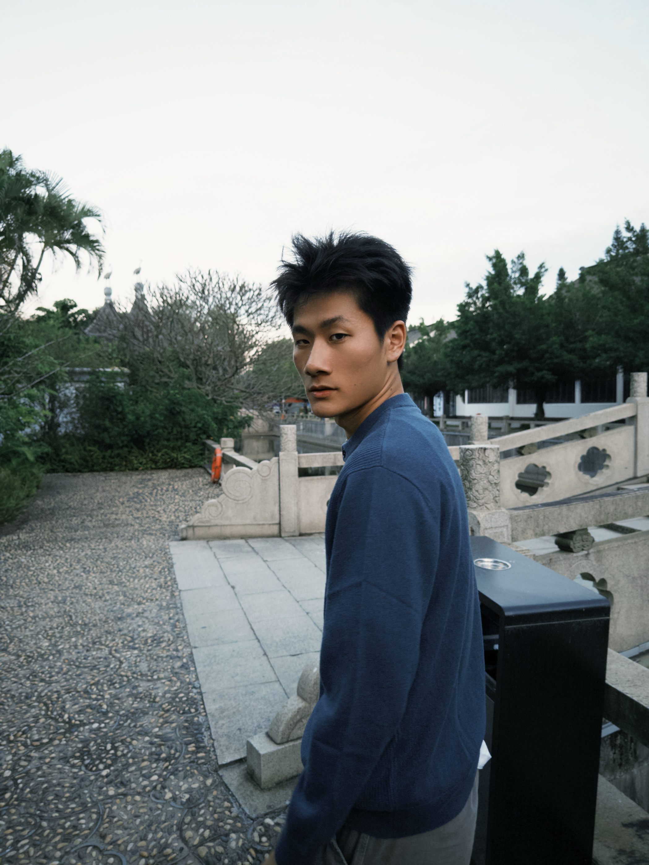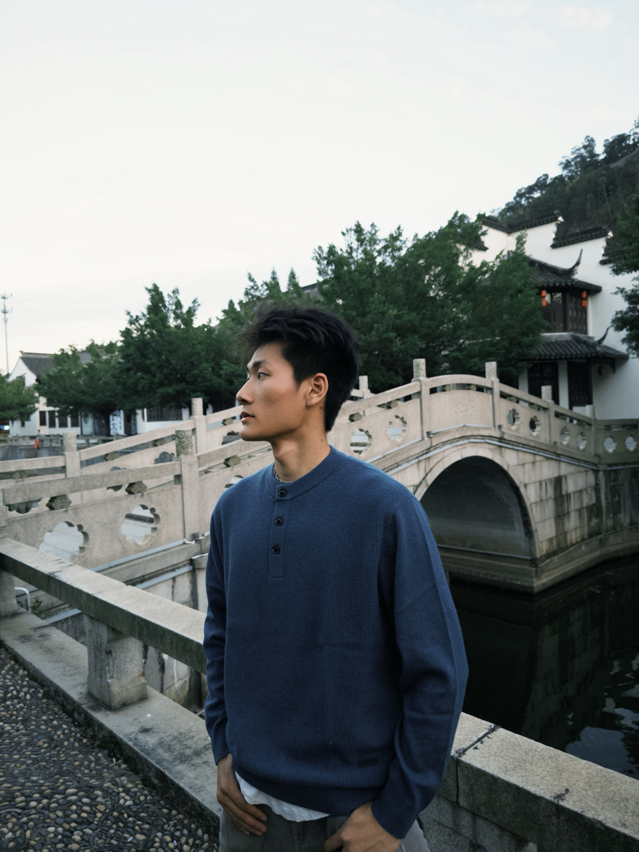 “这鄂尔多斯亨利领毛衣是我秋冬的‘质感款’——中兰色调和古镇建筑超搭,羊毛羊绒混纺摸着软乎不扎身,竖坑条纹理显利落不臃肿。单穿逛古镇、内搭通勤都合适,温度刚好时穿它,舒适和高级感都能兼顾,属于‘低调但有质感’的款。”
