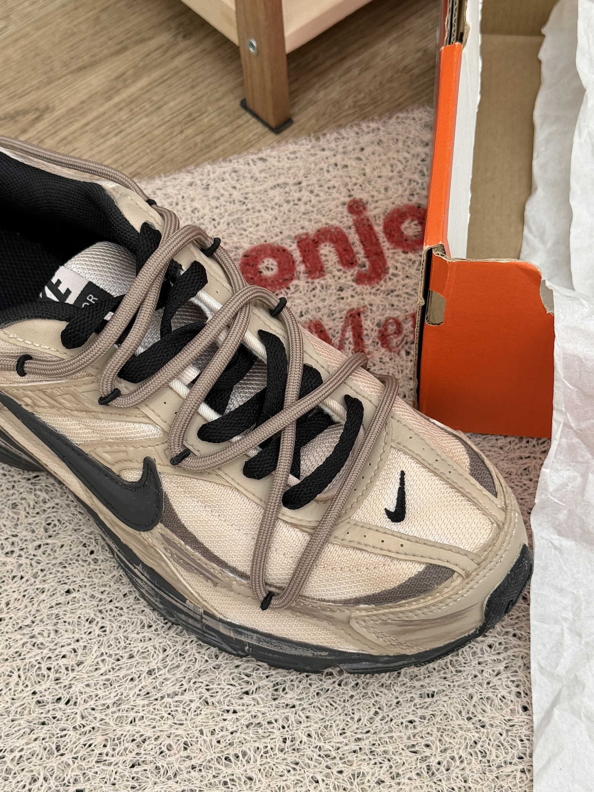 外观以浅卡其+黑灰的做旧拼接,非常有复古氛围,采用双鞋带设计,个性十足噢个人最喜欢鞋头小勾+侧标大Swoosh的双Logo设计,给鞋子带来了识别度与酷炫的感觉这点小细节戳到我心头了💗💗 织物+合成革拼接的鞋面材质,透气性好,鞋面也软,穿上去不会挤脚趾头,鞋底则是橡胶大底纹路,抓地力够稳,适合通勤,与运动量小的活动方式 个人认为耐脏是这个鞋的突出优点,而且增高效果也明显,缺点是鞋舌略...