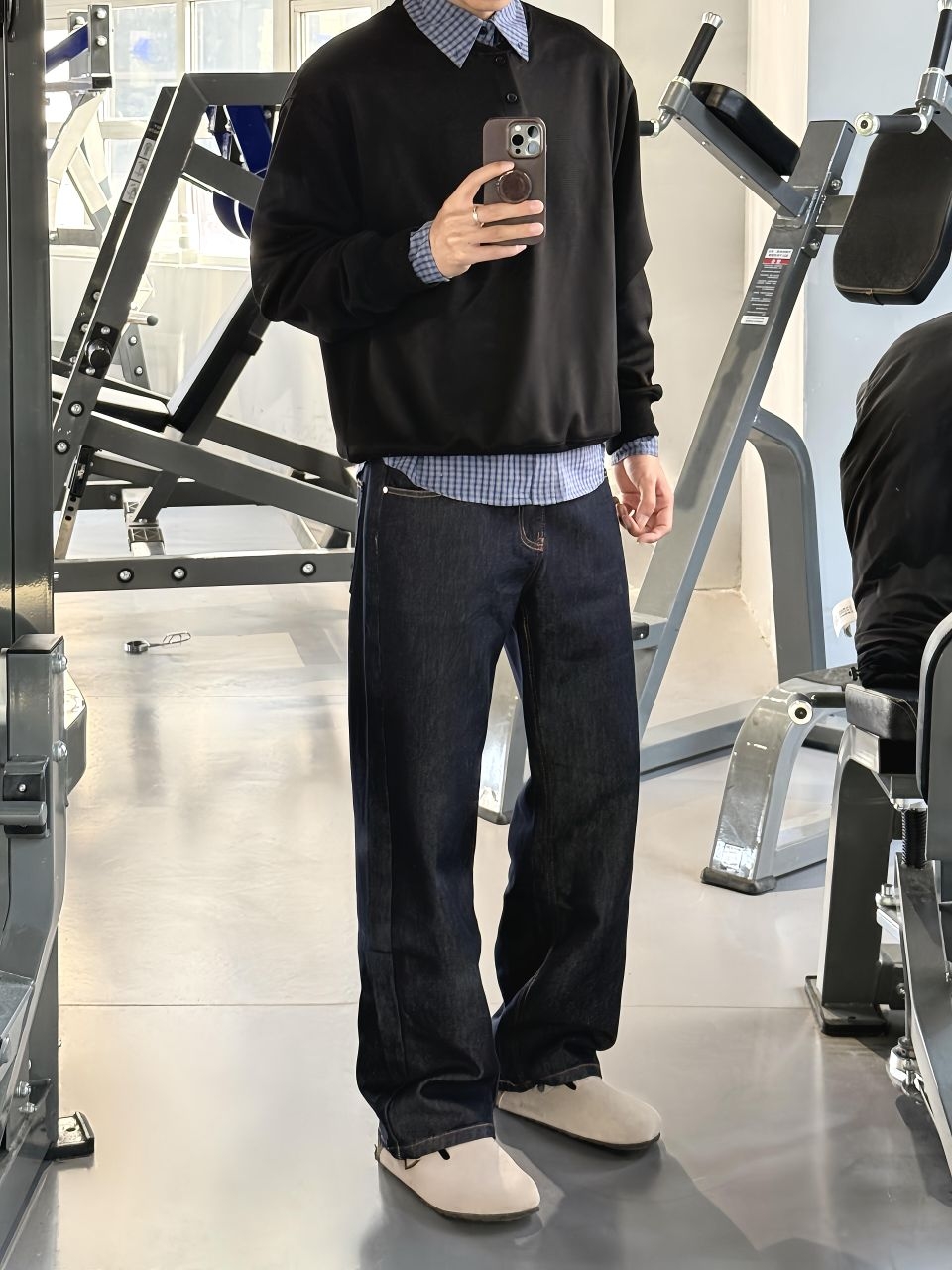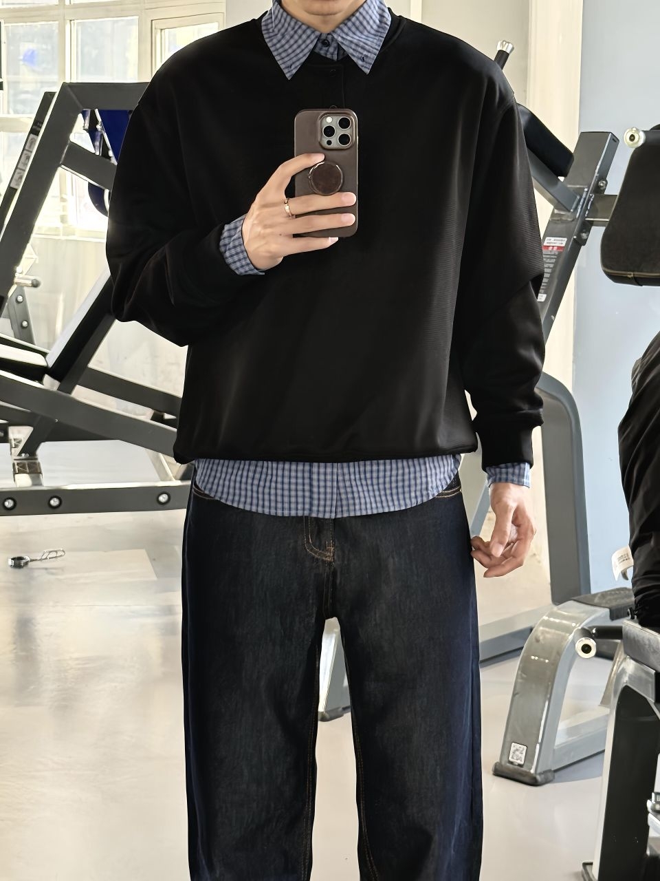 不凹造型,是高级感的基本修养。 黑色卫衣叠穿格纹领,细节处拉开层次——看似随意,实则拿捏。 深蓝牛仔与棕色手机撞出复古味,在器械背景里反而更显干净。 适合通勤转健身房,或周末想帅得毫不费力的你。 衣服不抢戏,人才是主角。 低调穿搭 #男士ootd #轻运动风 #日常高级感