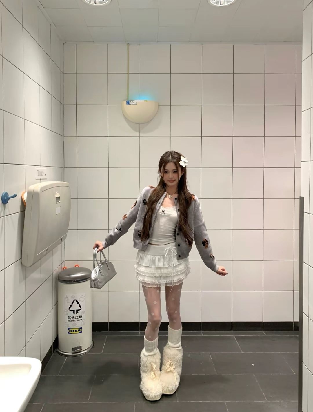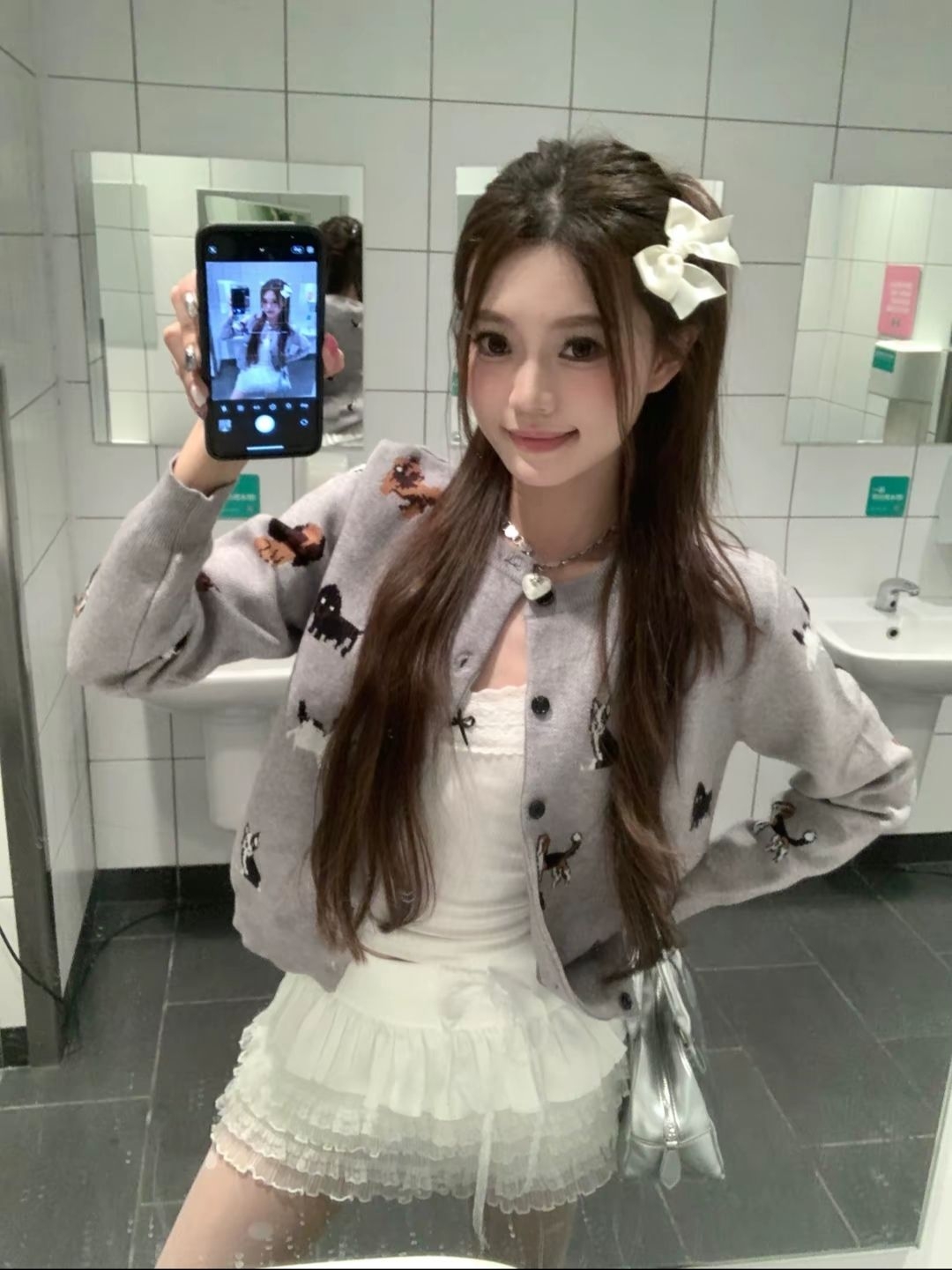 灰底小狗开衫是刺绣款,摸着有纹理不硌皮肤,短款刚好盖腰,显比例还不压个子。白蕾丝裙层层叠叠的,裙摆软乎乎不扎腿,走动起来灵动得很。波点袜薄透不闷,短筒毛绒靴鞋口软乎乎,上脚不压脚。 整套甜度刚刚好,清爽又元气,日常穿温柔又减龄,行动起来还轻便~