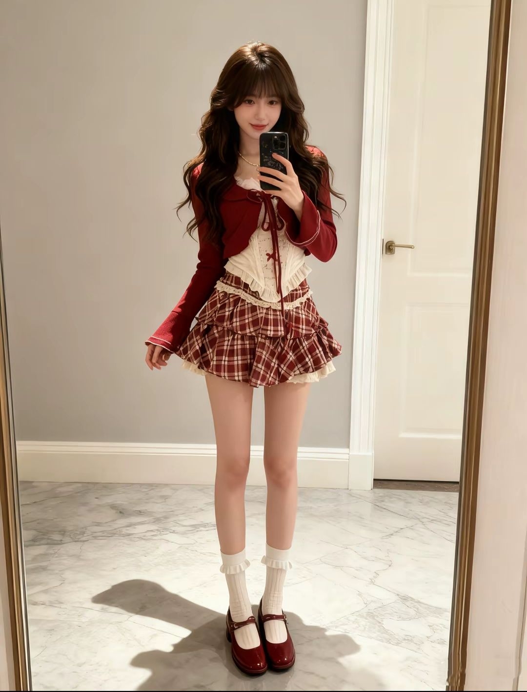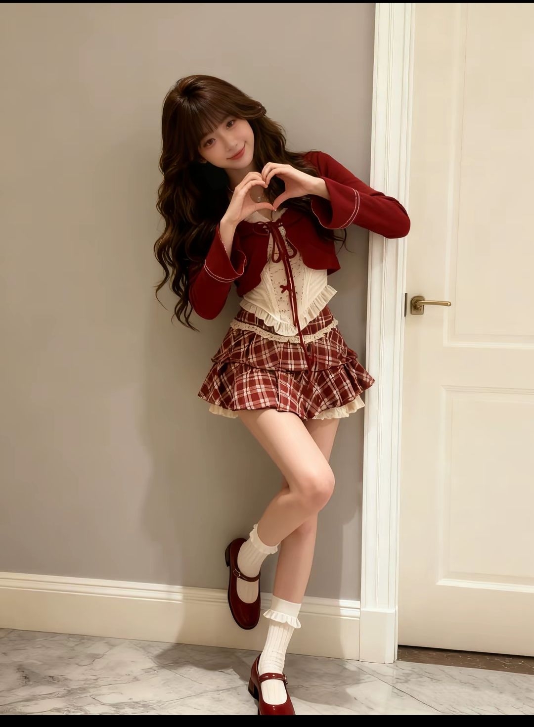 酒红针织开衫裹着暖融融的节日感,蕾丝内搭是藏在甜里的小精致;格纹蛋糕裙一摆,少女感直接拉满,酒红玛丽珍鞋踩出复古嗲气,白袜的花边又添了几分软萌~像一颗裹了糖霜的红莓,甜得鲜活又灵动🎄