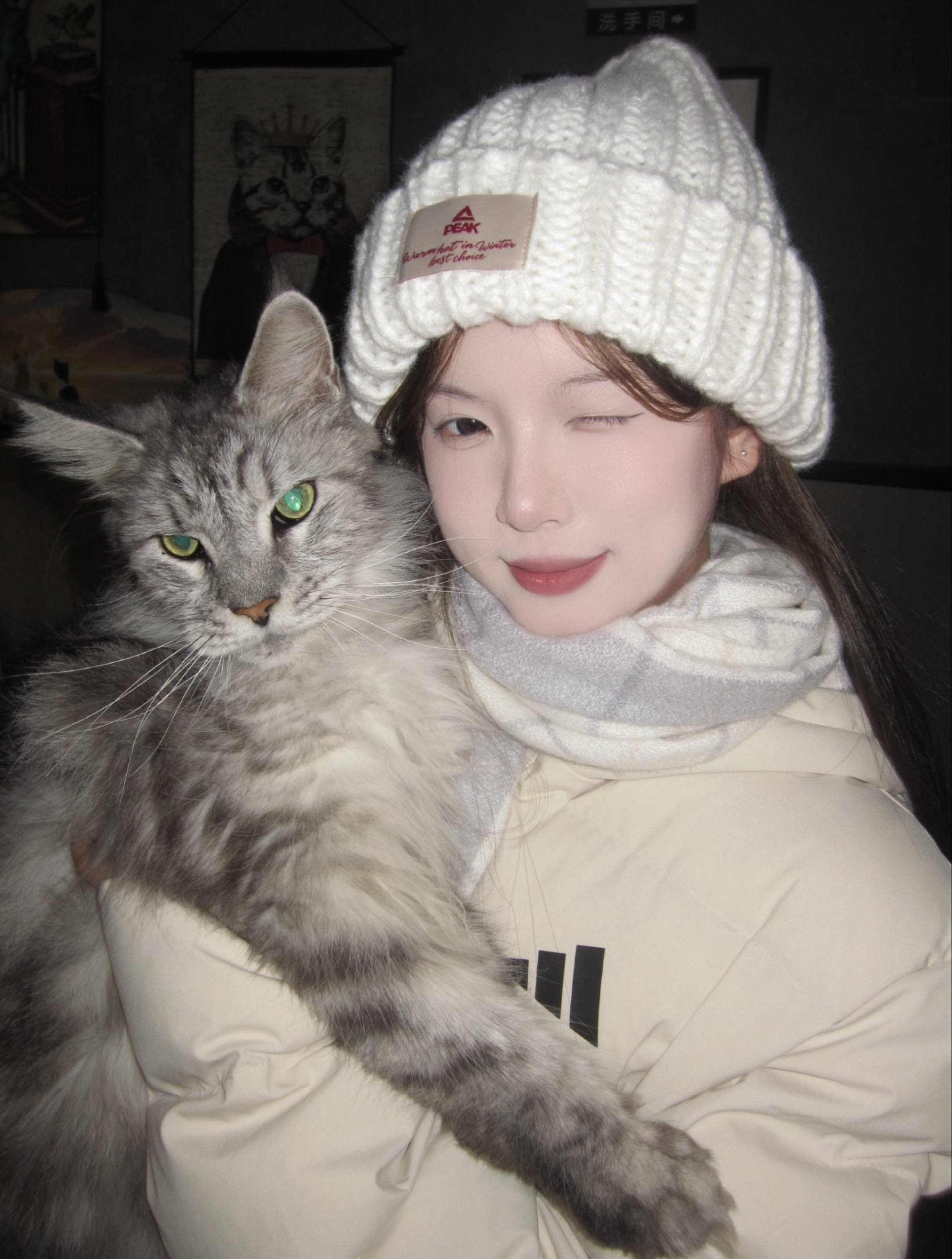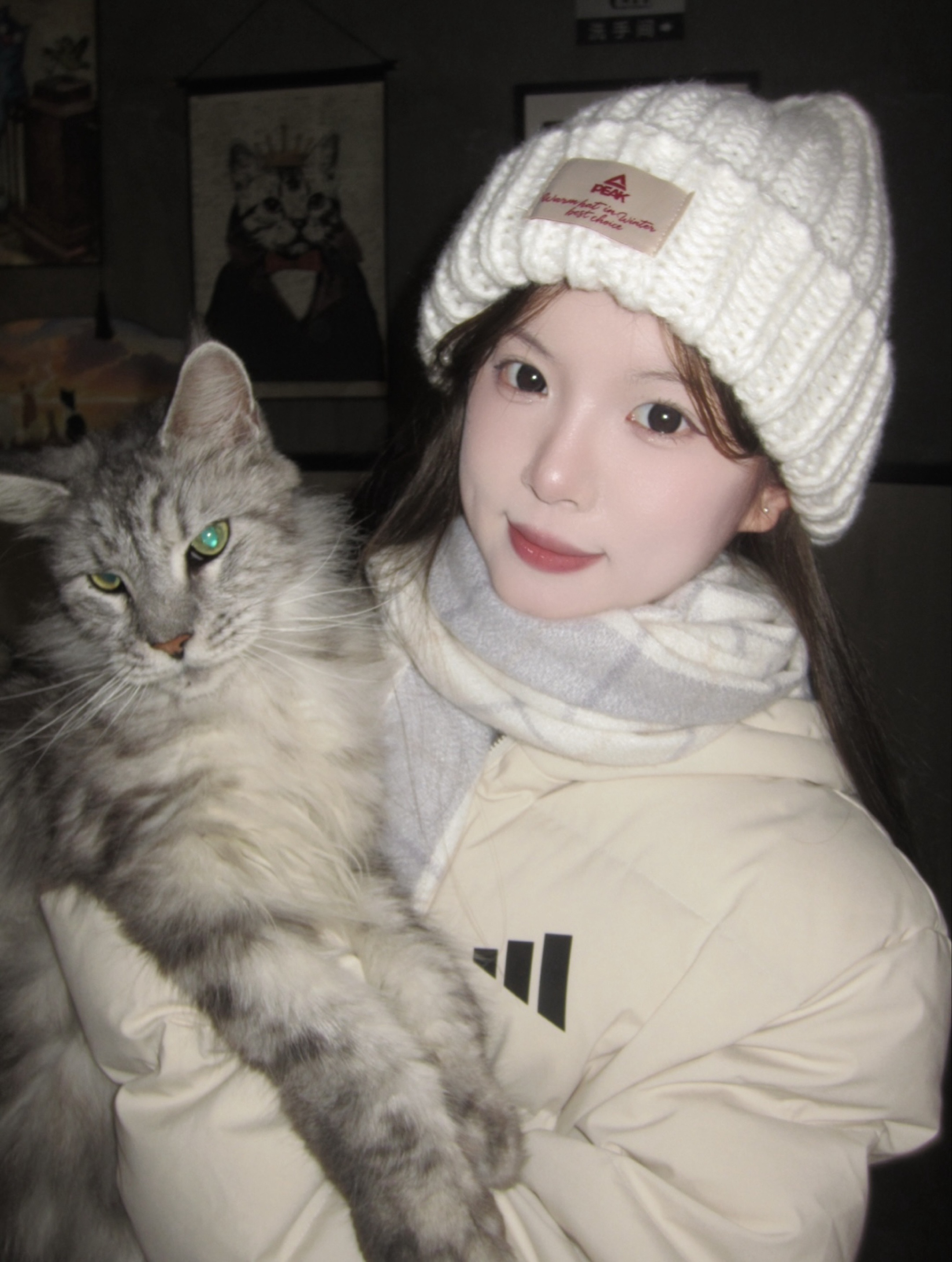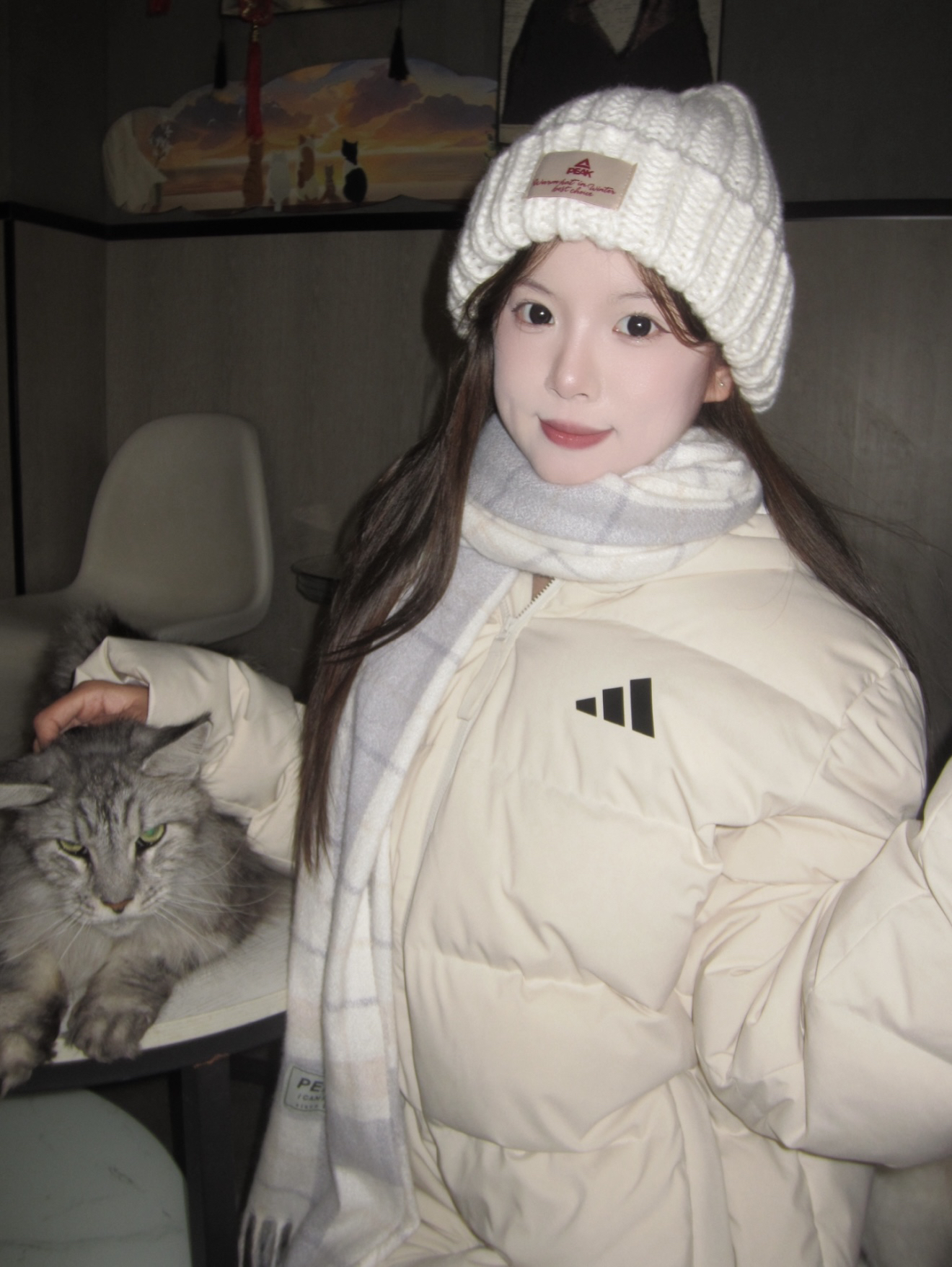 谁能拒绝冬日里的“奶白棉花糖”?软乎乎的米白羽绒服裹满暖意,Adidas黑标低调戳中运动感,配上格纹围巾直接把温柔焊在身上~ 针织帽上的小标点缀细节,伸手rua猫的瞬间,连空气都裹着软fufu的甜! ✅色系适配度MAX:米白+浅灰格纹,不挑肤色还自带“显白滤镜” ✅保暖&颜值双在线:蓬松羽绒服锁温,版型宽松藏肉不臃肿 ✅细节控狂喜:帽子贴标+品牌标,简约不单调,日常/出街都适配