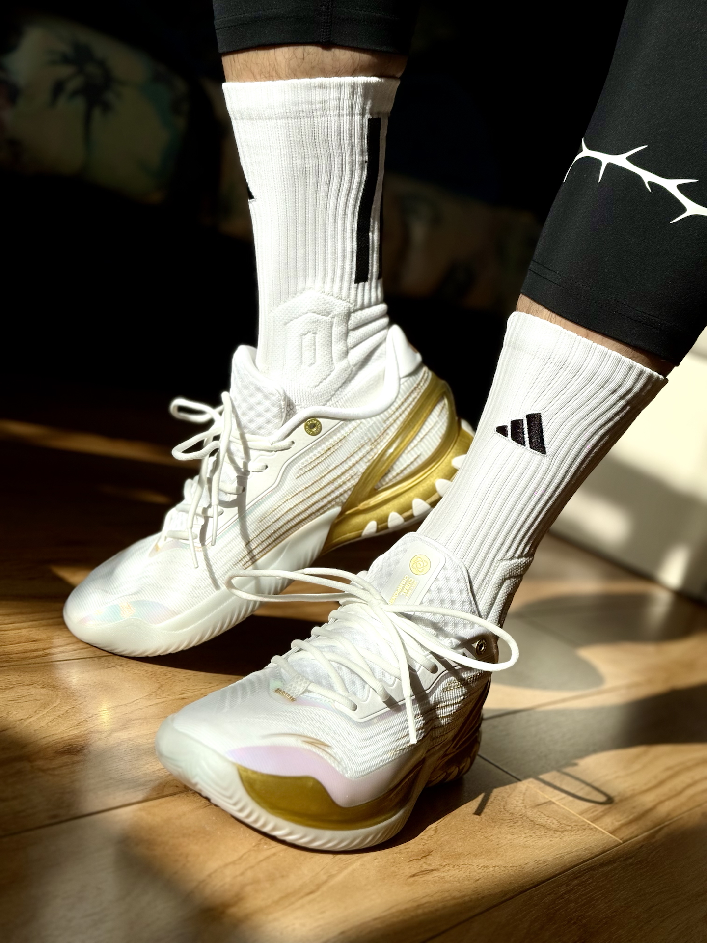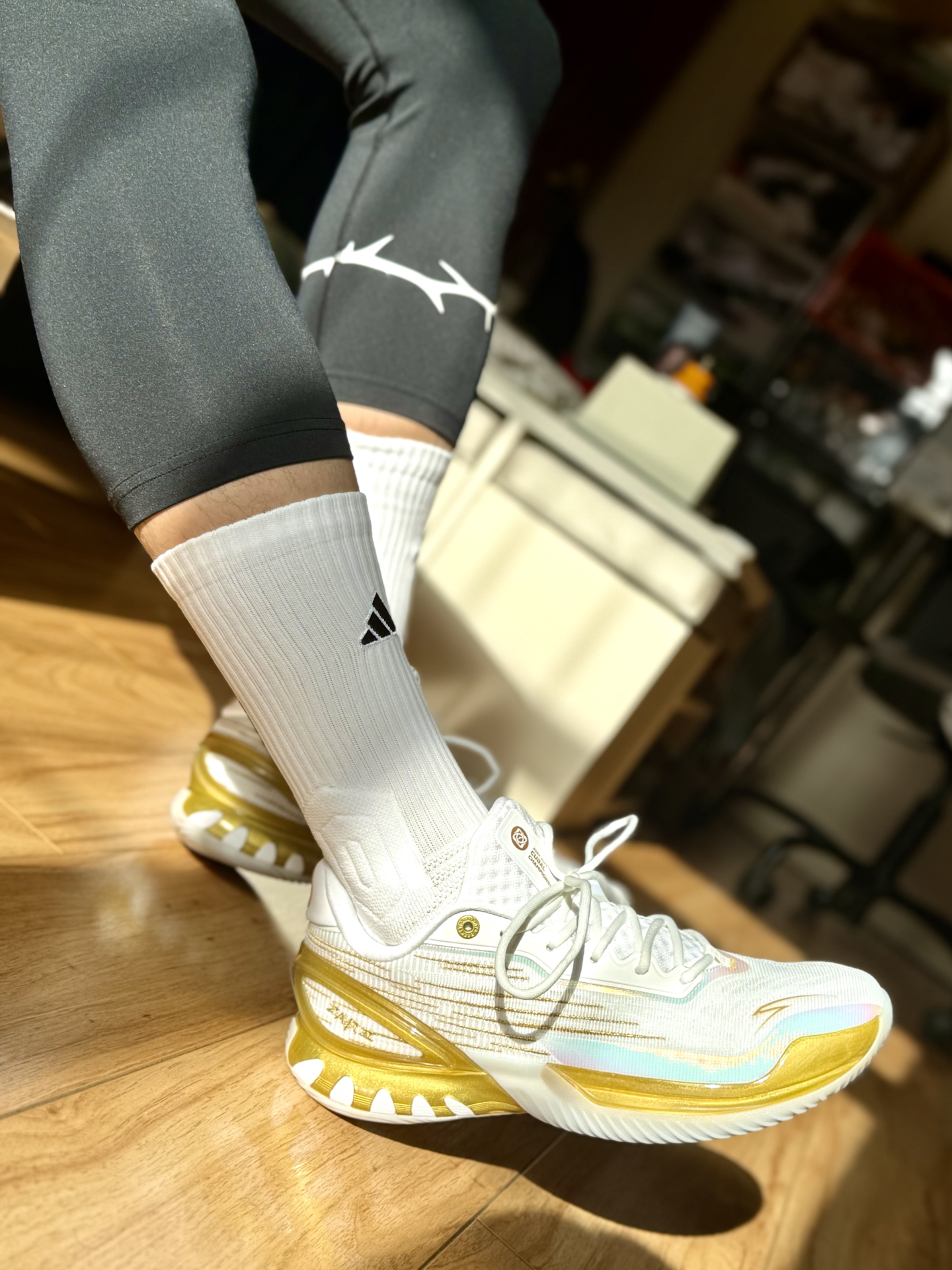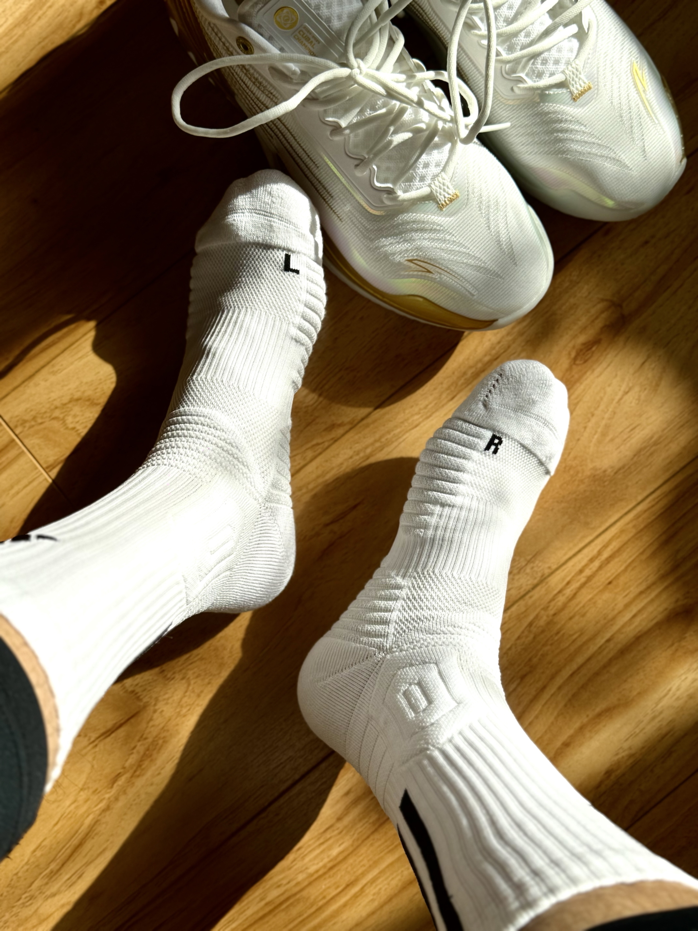 #新鞋零时差12月 这样的组合确实是很搭配啊。 白金配色的鞋身也彰显了华丽的一面,鞋子呈现非常流线的造型,碳板的加持增强了运动的稳定性。上脚之后包裹和缓震兼顾,我这体重也明显感觉到回弹,非常的平衡。 这双白袜确实也不简单,大面积防滑纹路也在运动中增色不少,袜口也不勒,后跟处三道杠还很具有代表性,绝对是看一眼必入的经典款了。