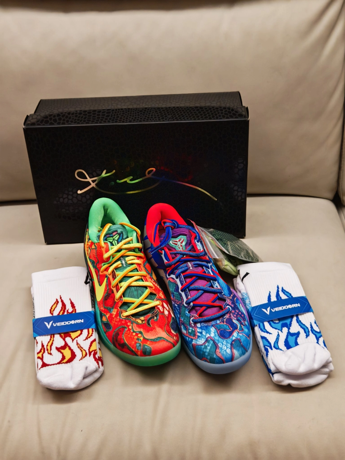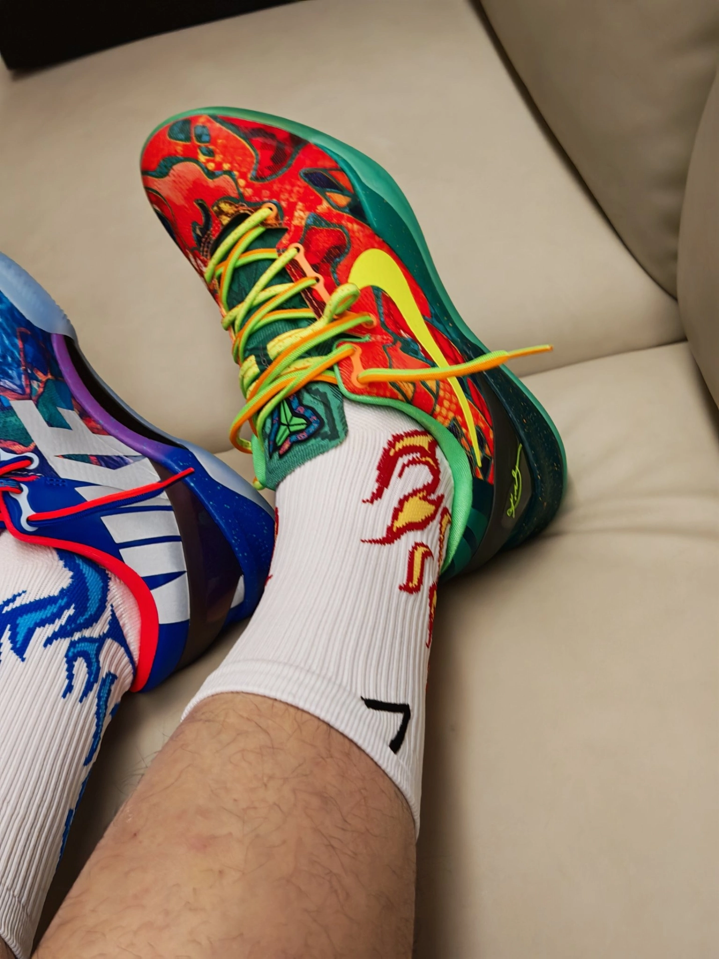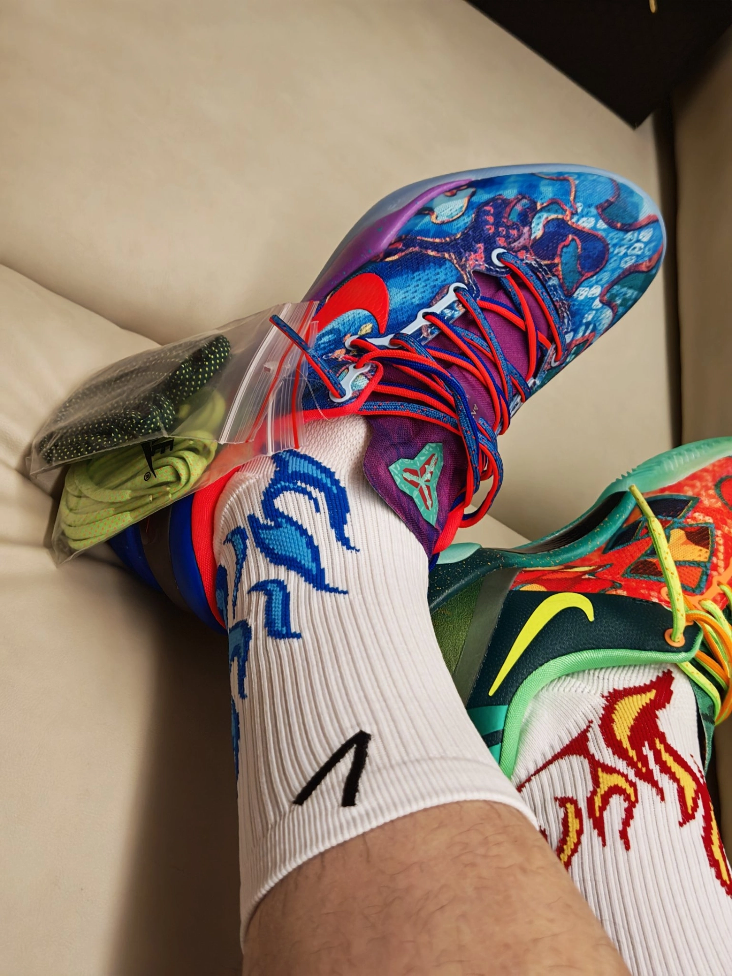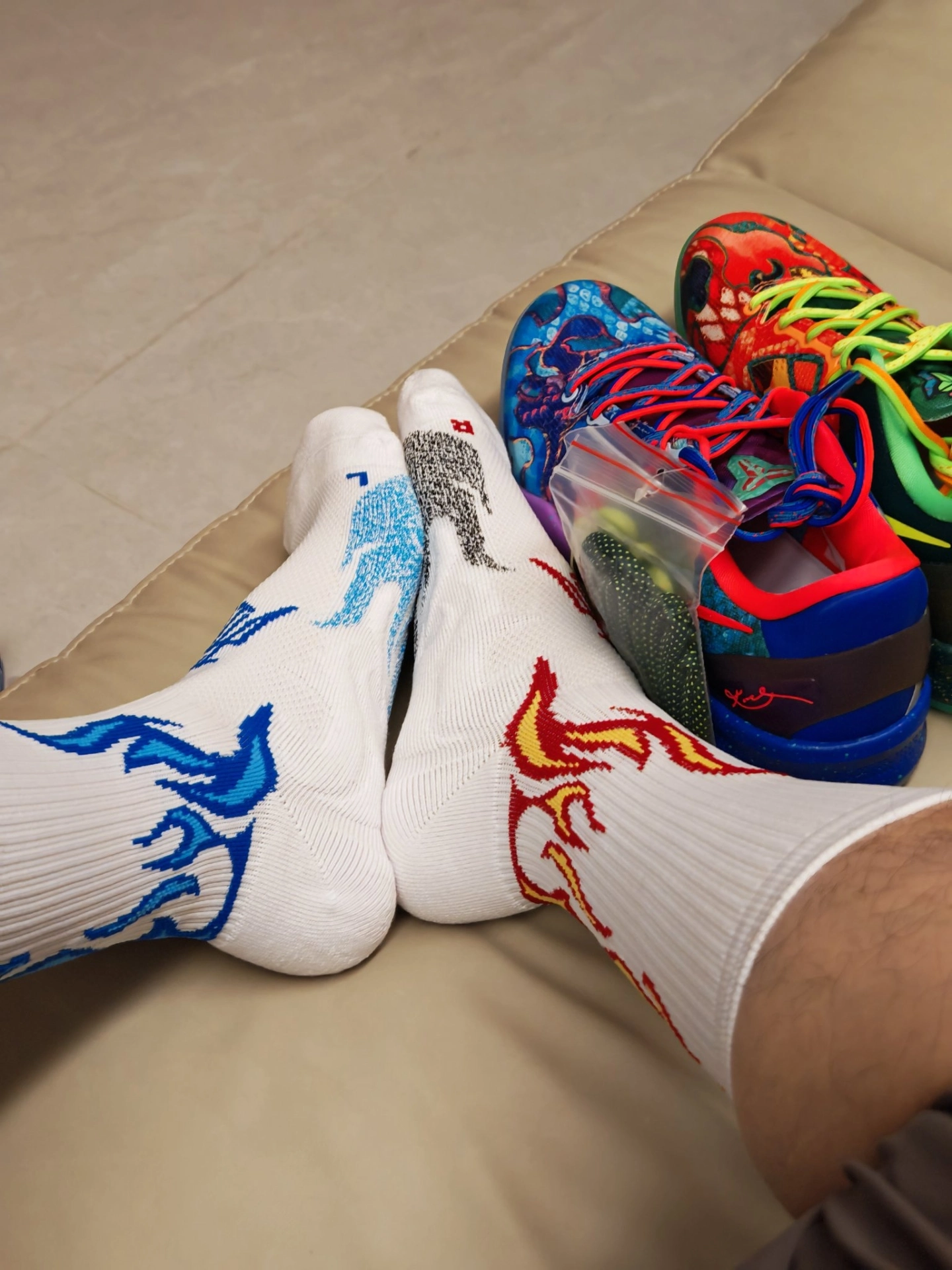 今天的#鞋袜搭配计划 直接点燃“冰火双生”Buff 🔥❄️ 鞋子我选的是 Nike Kobe 8 Elite “What The” 鸳鸯配色 —— 一边是热烈红焰,一边是清冽蓝浪,泼墨纹理自带艺术感,低帮鞋身兼顾灵活与包裹,实战时能跟上每一次变向,出街也像把艺术穿在了脚上。🎨 袜子搭的是维动 VEIDOORN 燎原Pro 专业实战篮球袜,特意各取一只红焰款和蓝浪款,白底色+对应色系的火焰...