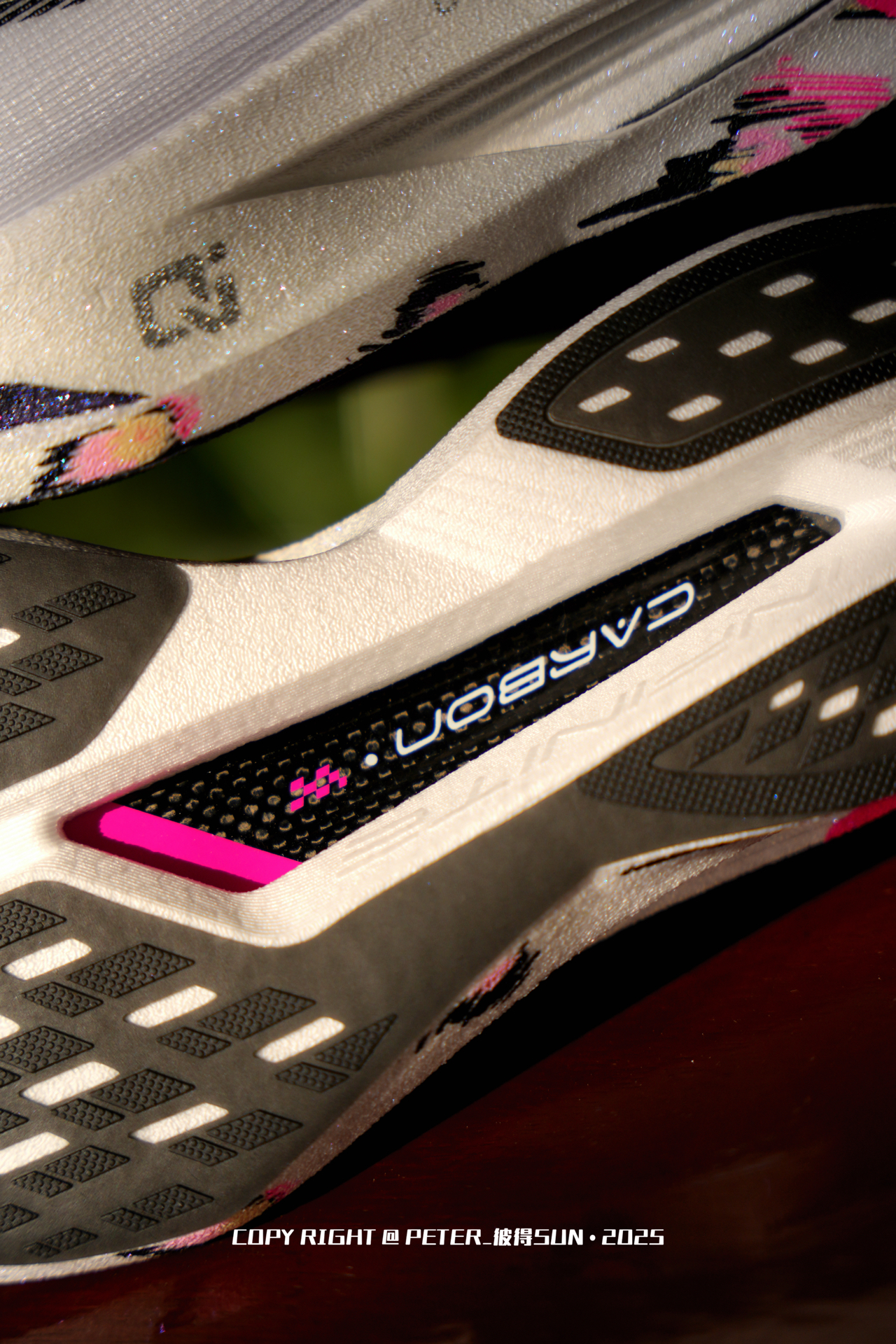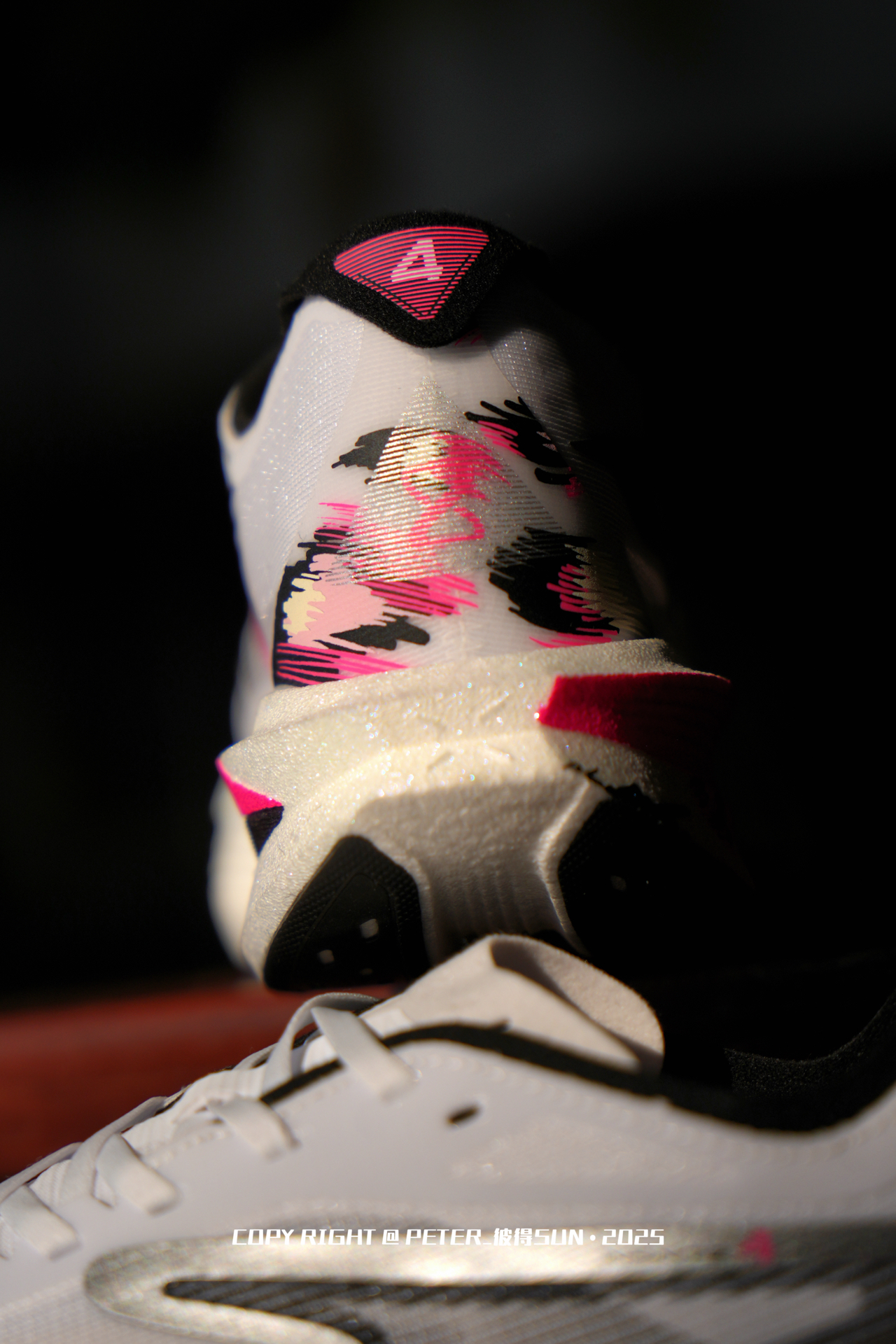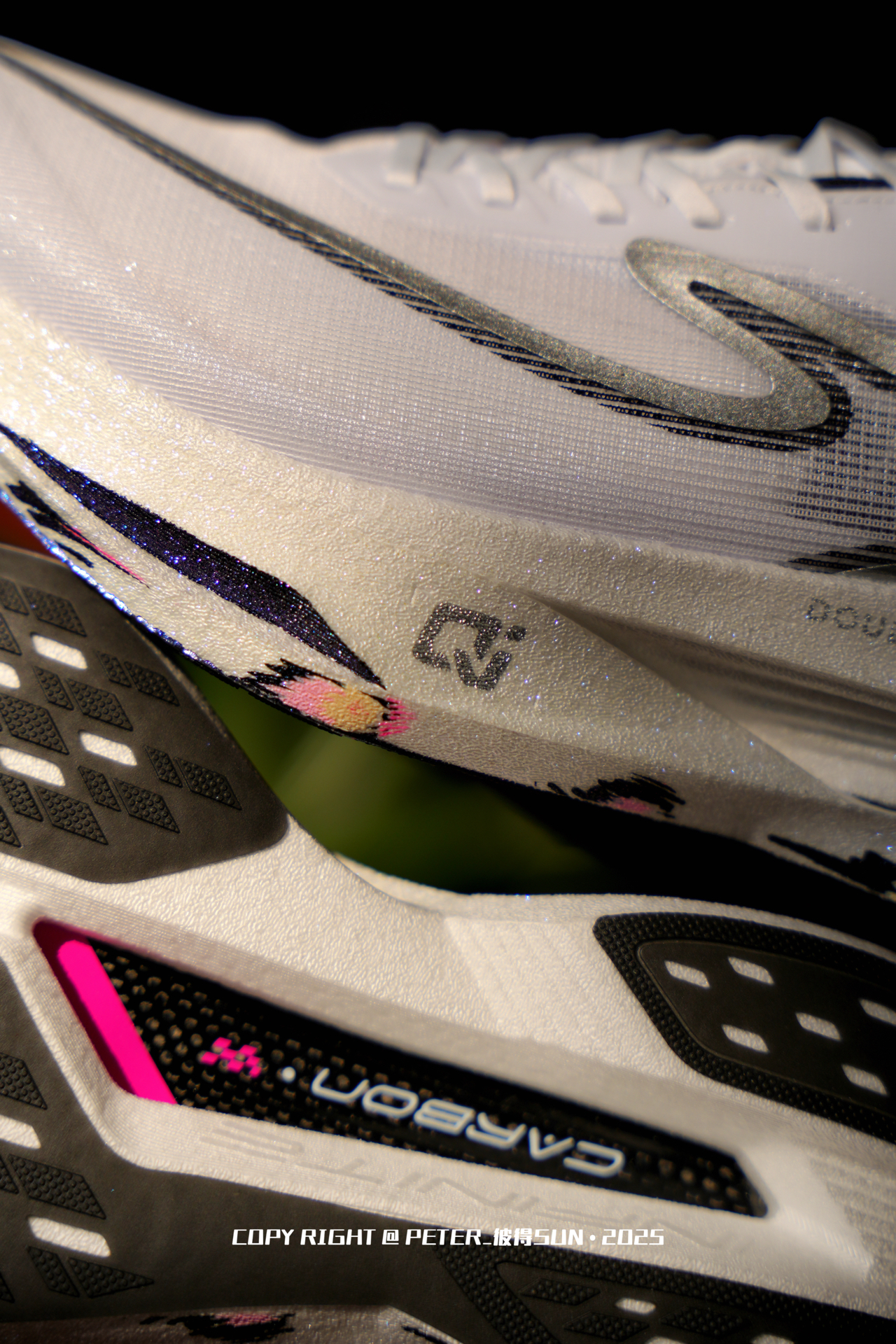 每年球鞋似乎都有很多粉红豹的配色,说真的,看到这个粉色➕豹纹总是忍不住拿下。可能已经对这个IP没抵抗力了。 芷境4粉红豹配色还是挺帅的。大色块加上叠影一样的豹纹还是挺特别的,仔细看👀中底的位置还有闪粉点缀,细节是挺到位了。 4代是在3代上做了针对性的提升。 前后掌加宽,确实解决了3后跟不稳的问题,中底也做了加厚处理,这个实属是我这种大体重的福音。 中底依然是超大碳板,不过不同的是这个碳板解构,起翘...