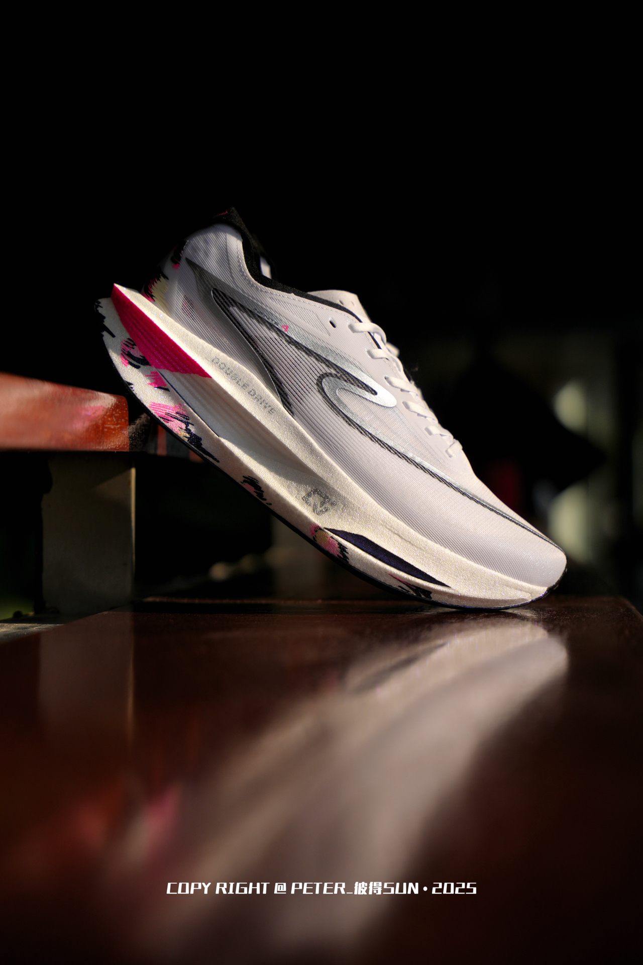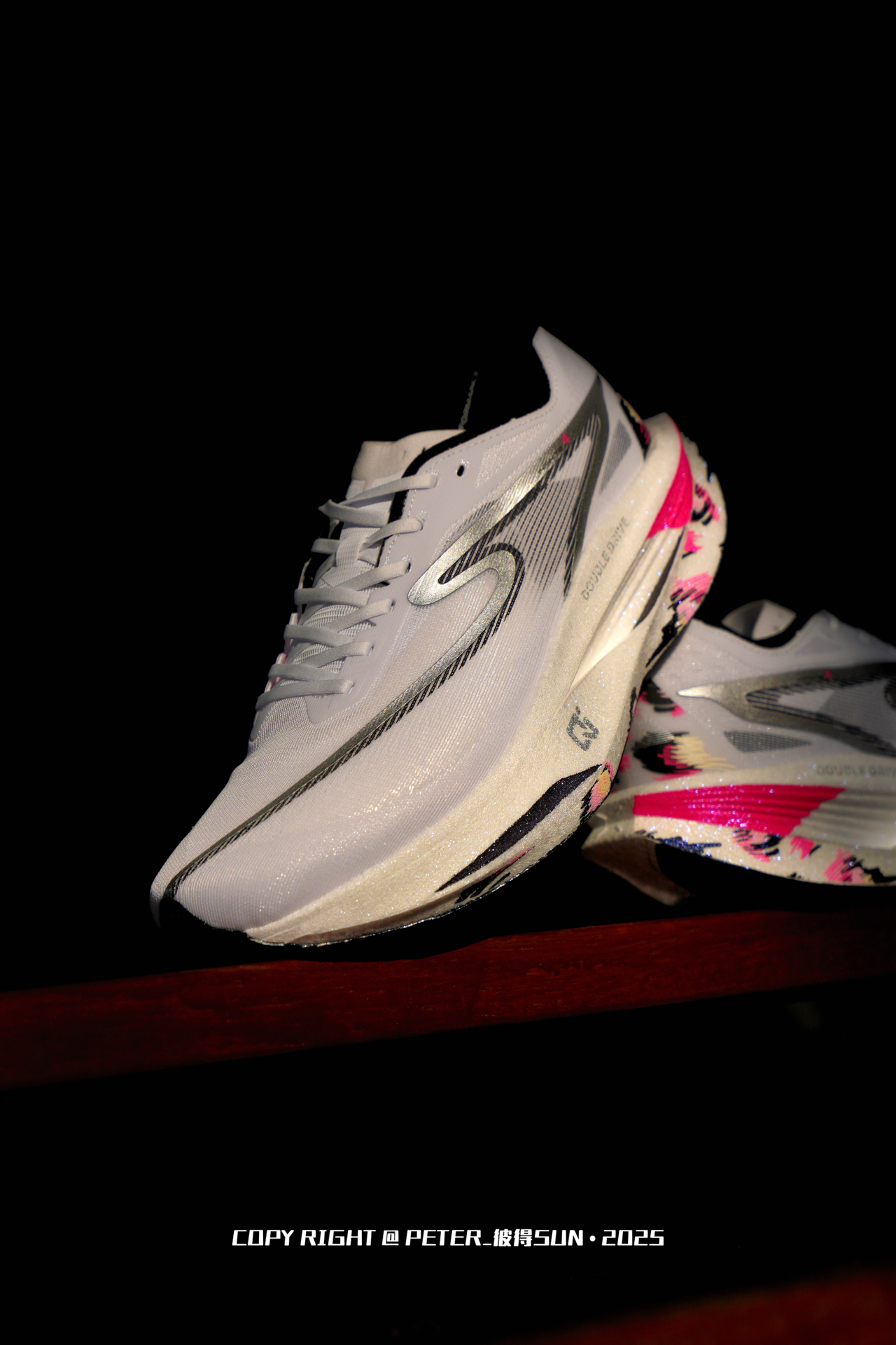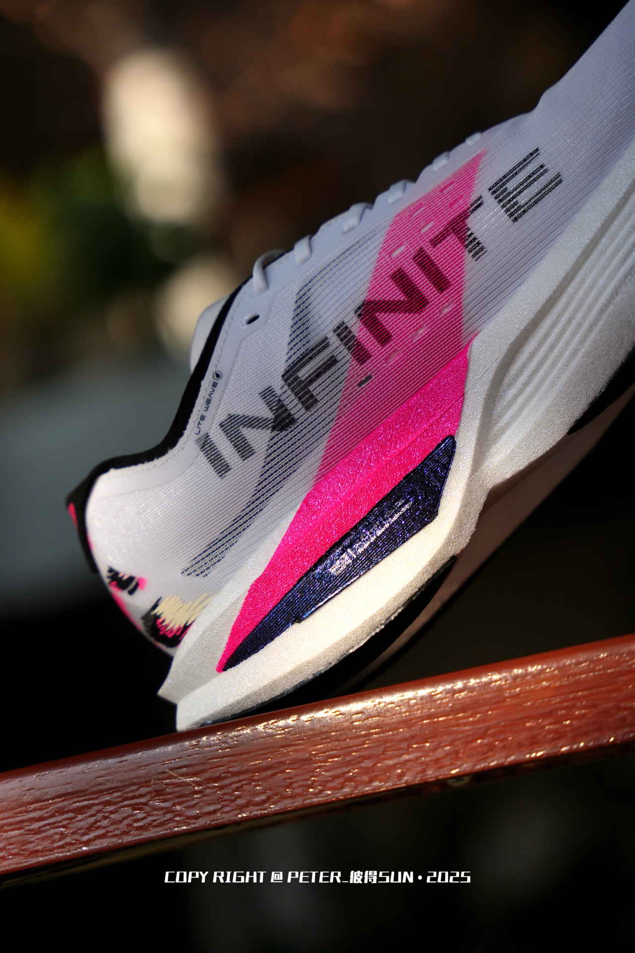 每年球鞋似乎都有很多粉红豹的配色,说真的,看到这个粉色➕豹纹总是忍不住拿下。可能已经对这个IP没抵抗力了。 芷境4粉红豹配色还是挺帅的。大色块加上叠影一样的豹纹还是挺特别的,仔细看👀中底的位置还有闪粉点缀,细节是挺到位了。 4代是在3代上做了针对性的提升。 前后掌加宽,确实解决了3后跟不稳的问题,中底也做了加厚处理,这个实属是我这种大体重的福音。 中底依然是超大碳板,不过不同的是这个碳板解构,起翘...
