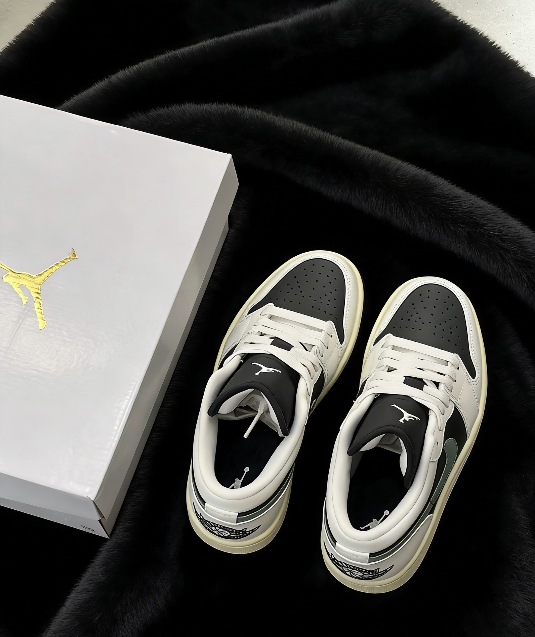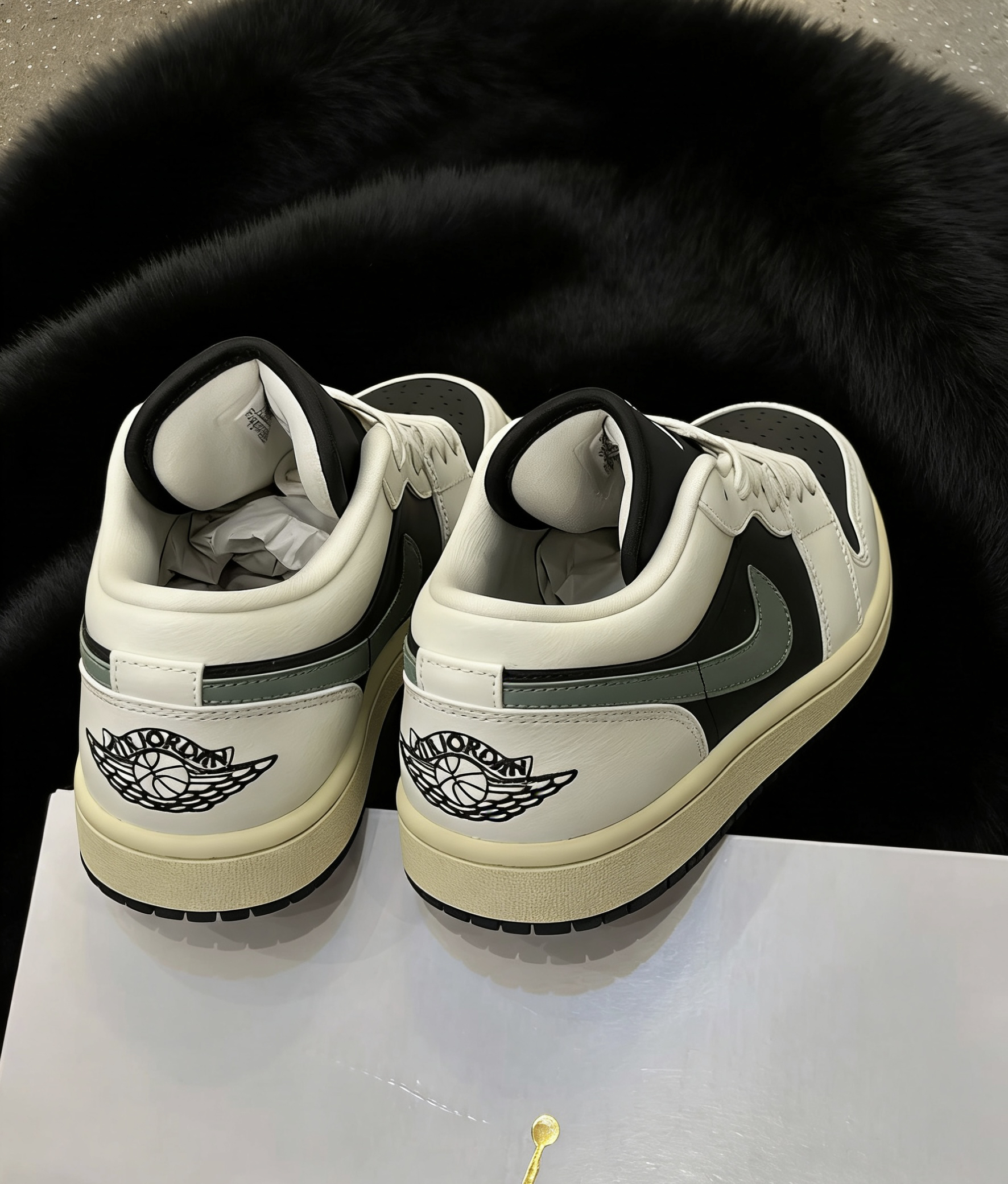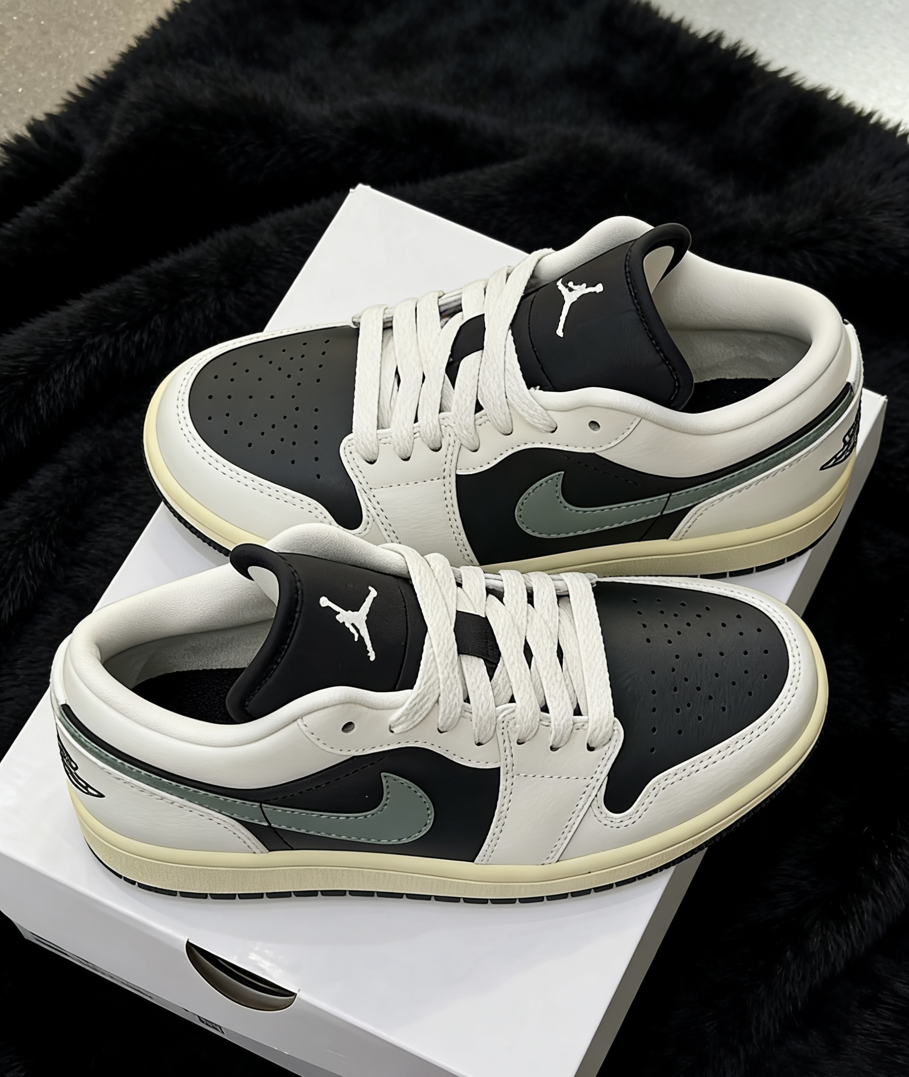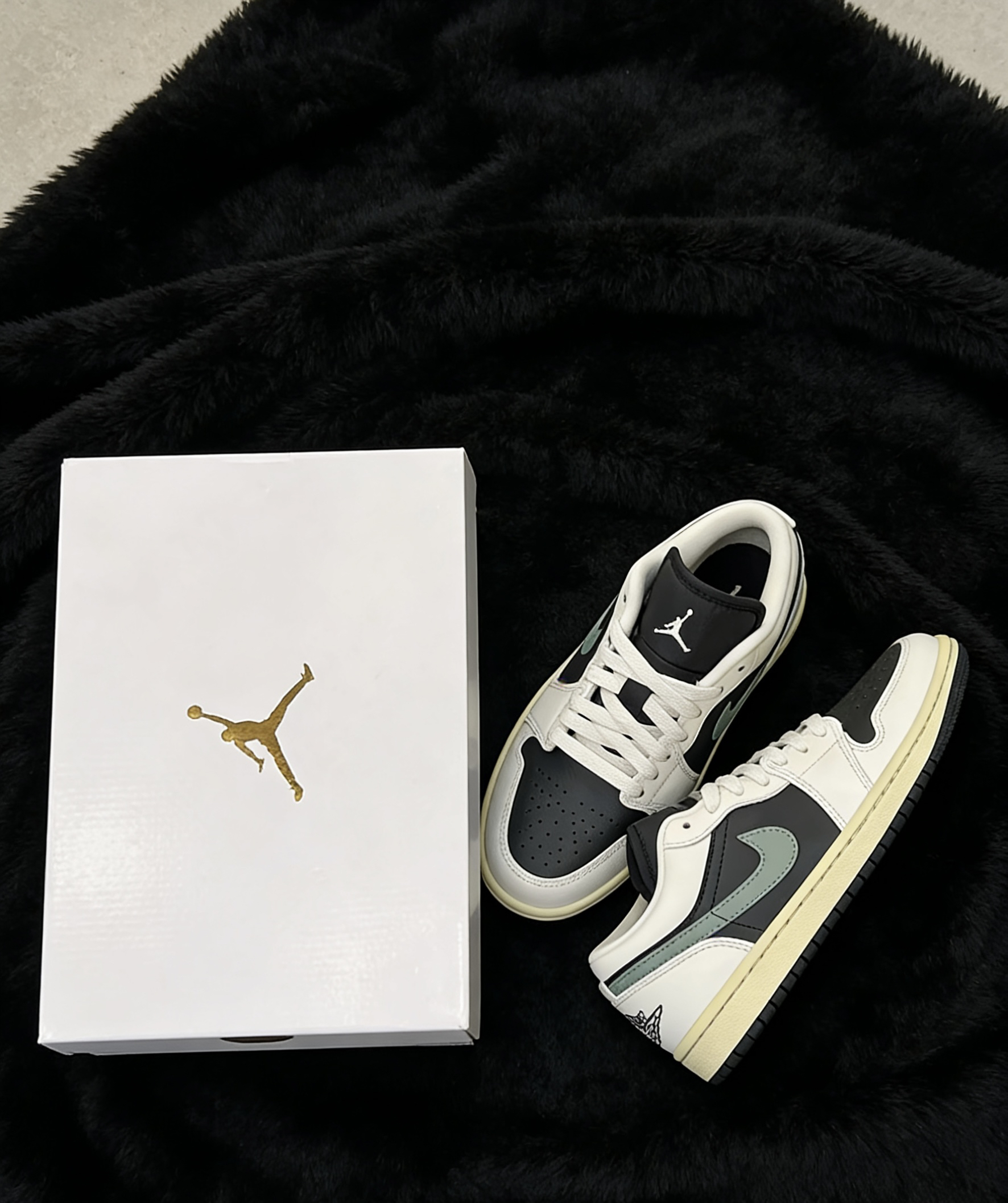 这双AJ低帮真的长在我的审美点上了💯 经典的黑白配色基础上,加了一抹清冷的灰绿色勾子做点缀,瞬间打破单调。做旧的米黄鞋底自带vintage感,和黑色毛绒背景对比超有质感,上脚不挑风格不挑穿搭,日常穿又舒服又吸睛,真的越看越爱!