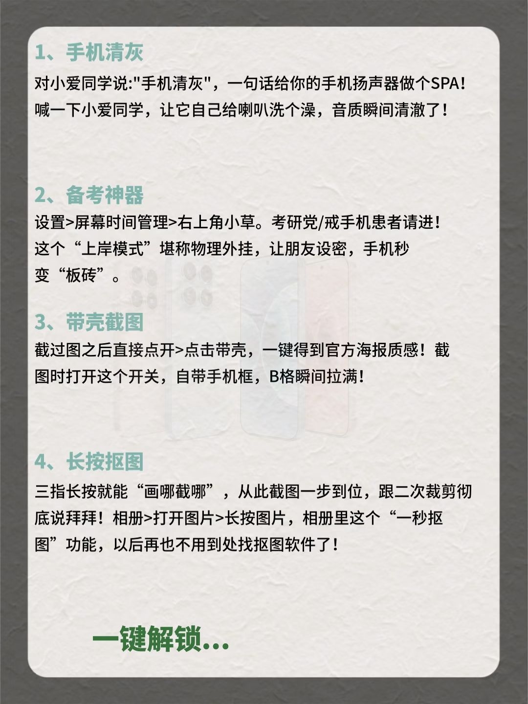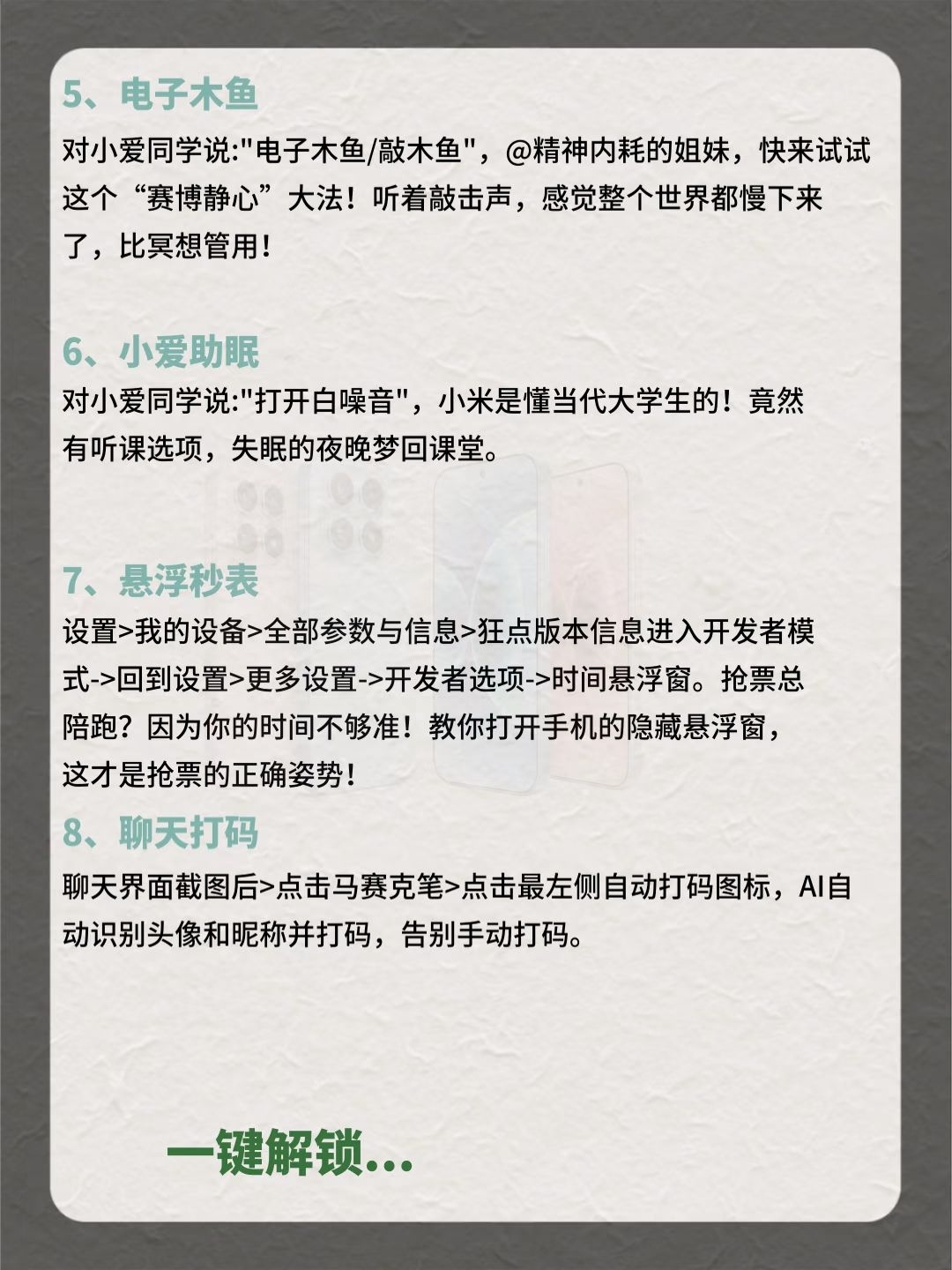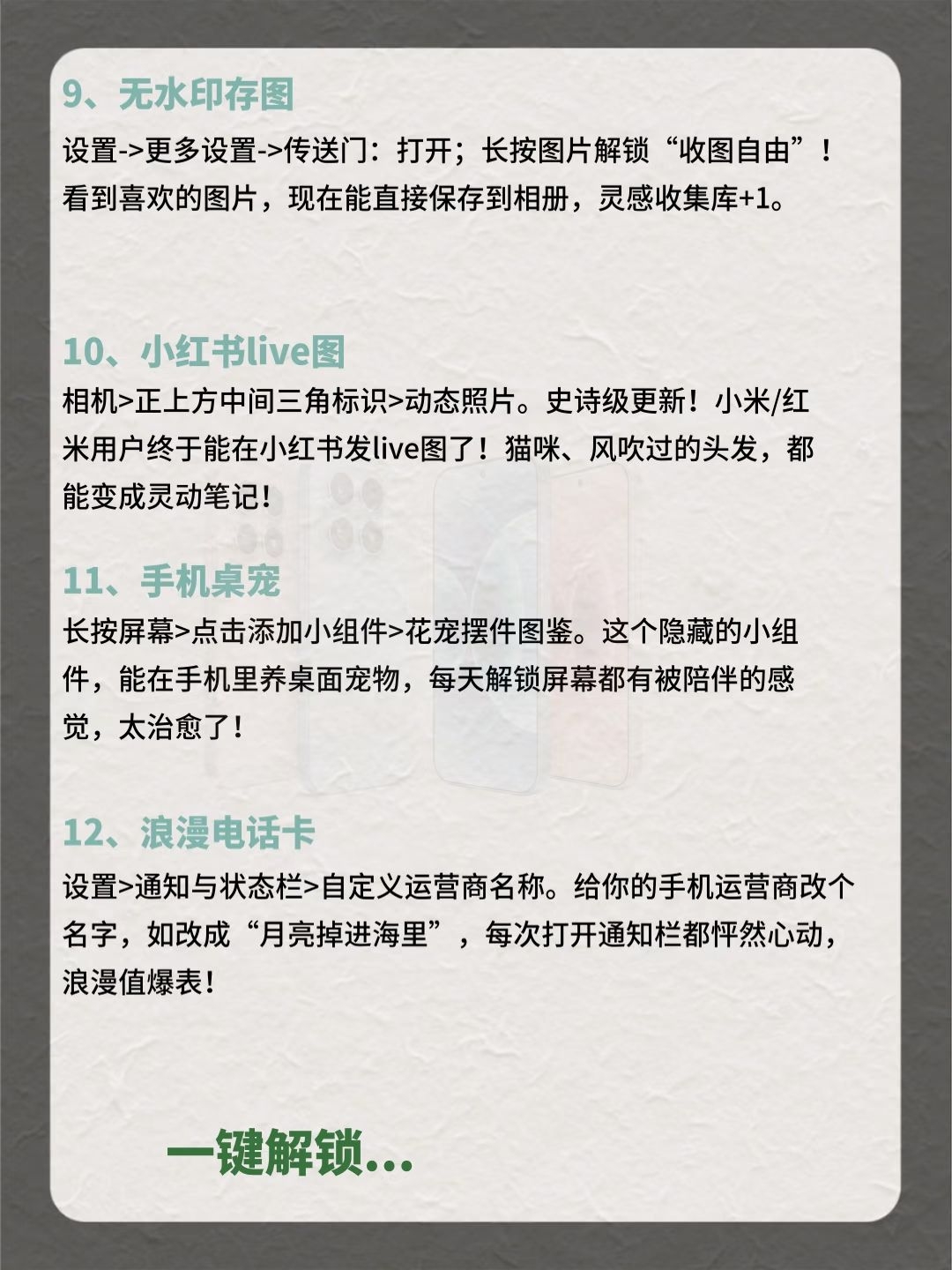 小米手机31个隐藏功能,你知道几个? 快看过来,用小米的都有福啦!感觉赚了500块😍 花5000+买的手机,这些隐藏功能超值! 早八人着急用图,无水印存图功能水印一键消除; 平时闲下来用背屏玩法凹造型拍照,超酷的; 摇一摇广告太烦人,一键关闭瞬间清净了; 拍照预设参数全部导入,小白也能秒变摄影大师,立省一个单反钱! 这么多宝藏功能,赶紧收藏点赞起来!别下次用了找不到了! 还有哪些宝藏功能,评论区秀...