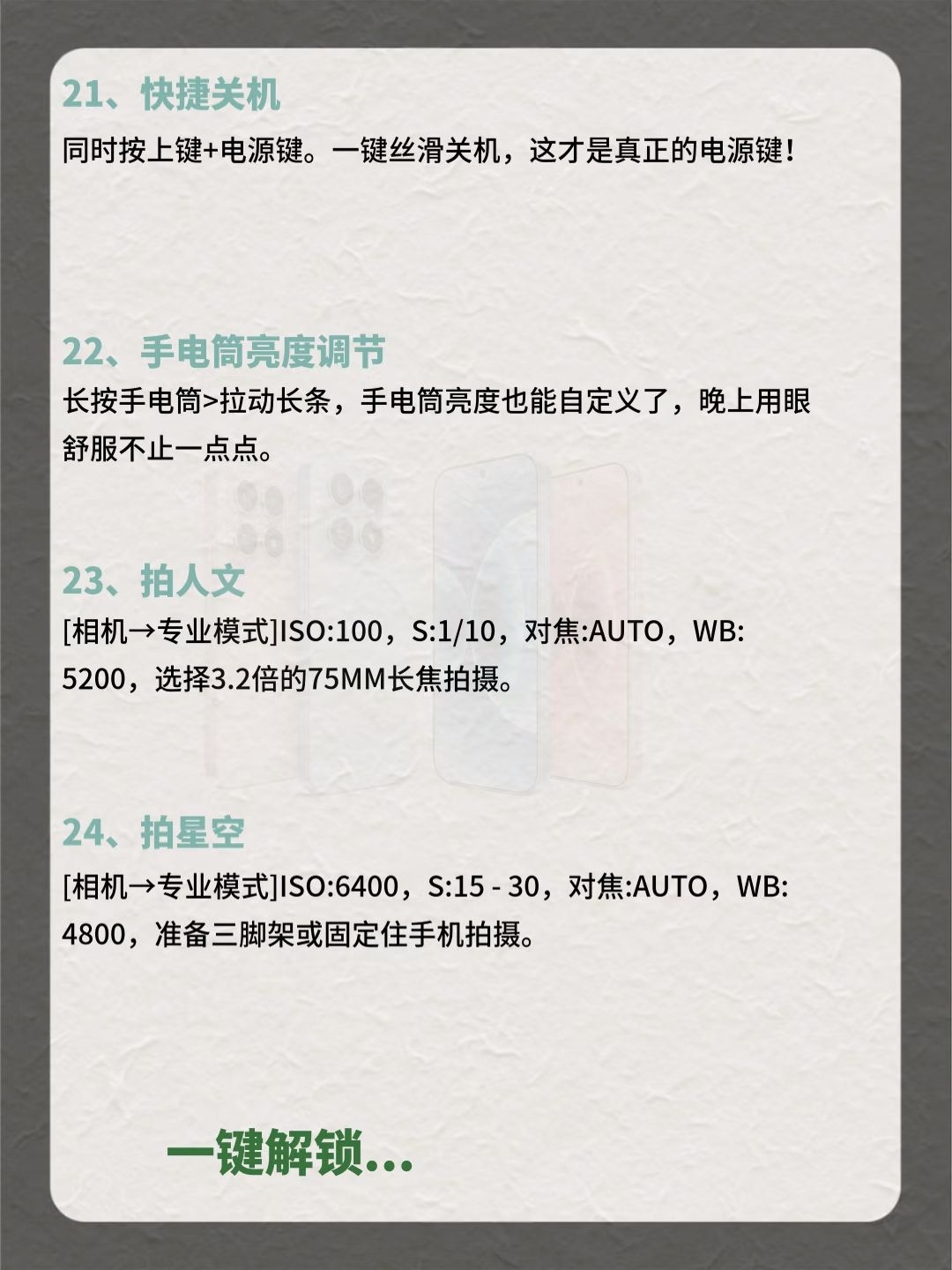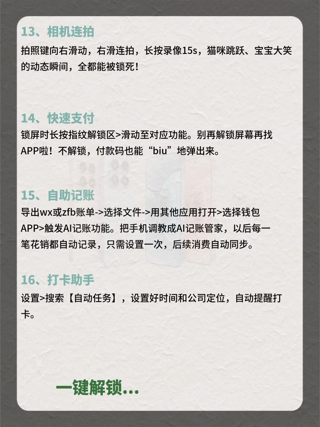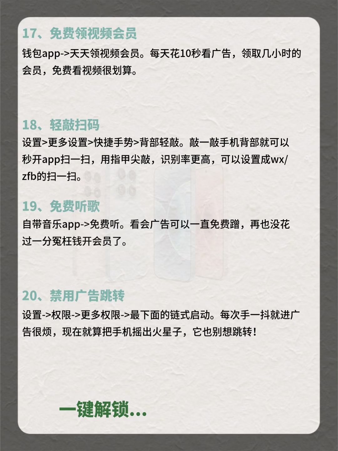 小米手机31个隐藏功能,你知道几个? 快看过来,用小米的都有福啦!感觉赚了500块😍 花5000+买的手机,这些隐藏功能超值! 早八人着急用图,无水印存图功能水印一键消除; 平时闲下来用背屏玩法凹造型拍照,超酷的; 摇一摇广告太烦人,一键关闭瞬间清净了; 拍照预设参数全部导入,小白也能秒变摄影大师,立省一个单反钱! 这么多宝藏功能,赶紧收藏点赞起来!别下次用了找不到了! 还有哪些宝藏功能,评论区秀...