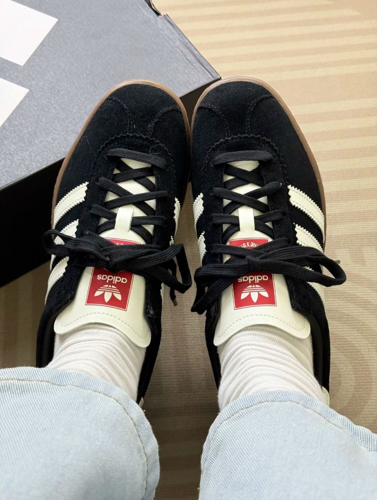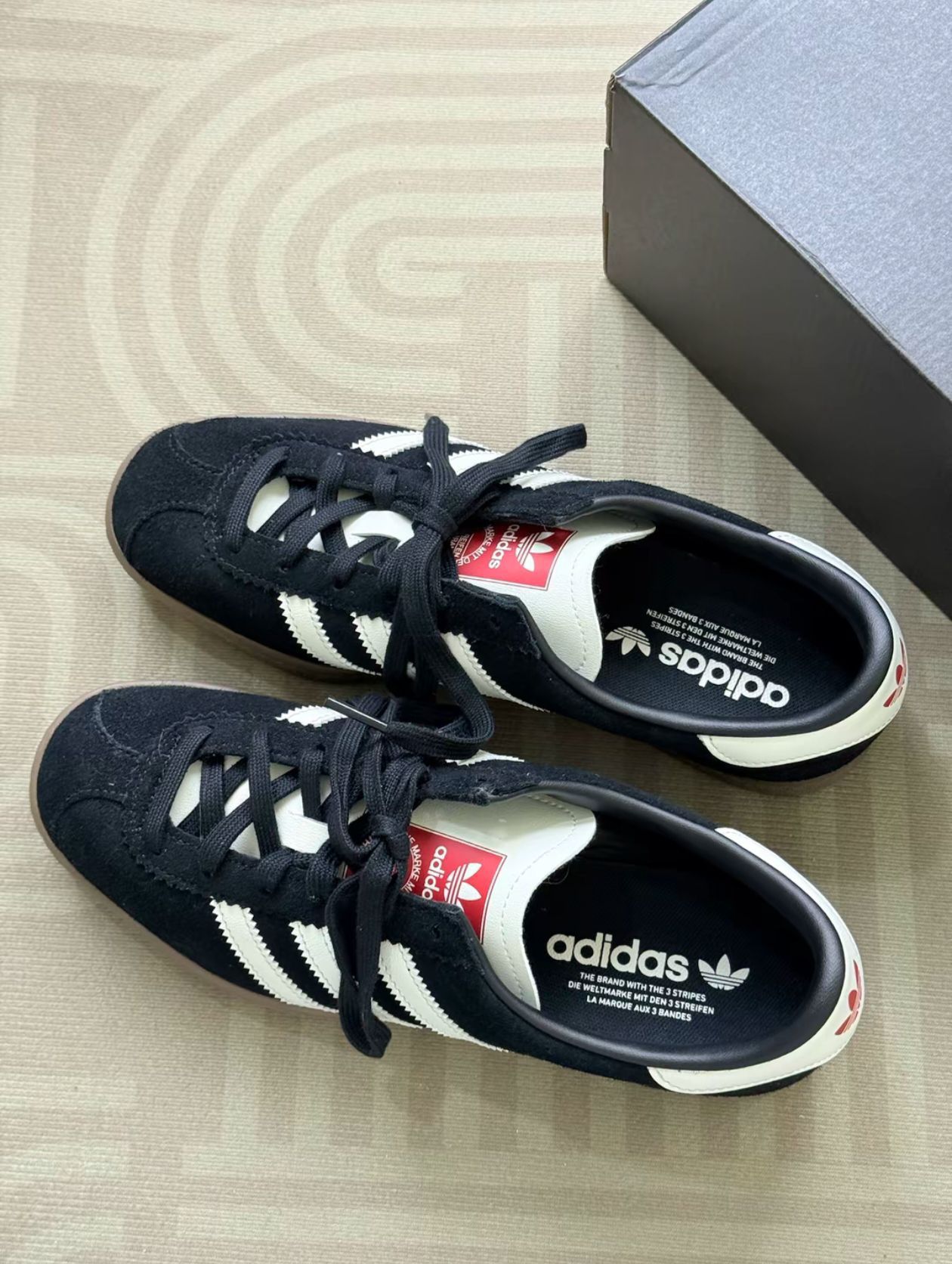 聊聊这双阿迪达斯的鞋的真实体验 黑白棕的经典搭配挺有复古感,麂皮材质看着也有质感。但麂皮真的很“娇贵”,稍微沾点灰或者污渍就很明显,清洁起来特别麻烦。 穿着的话,日常短时间走路还行,鞋底有一定的柔软度,但要是长时间出门,就会觉得支撑不够,脚底板容易发酸。而且鞋型偏瘦,我脚宽,穿久了会觉得挤,得选大半码才舒服。