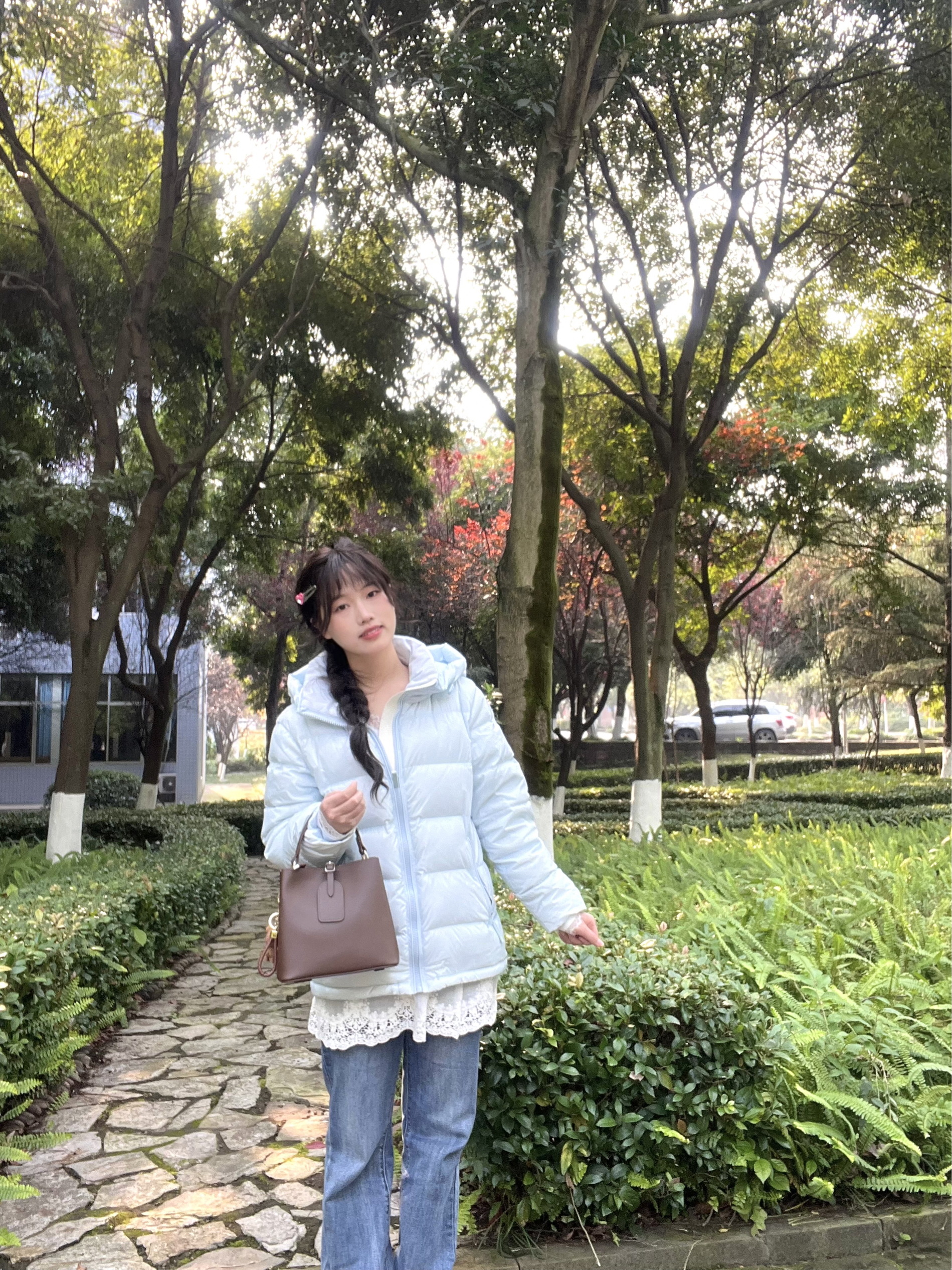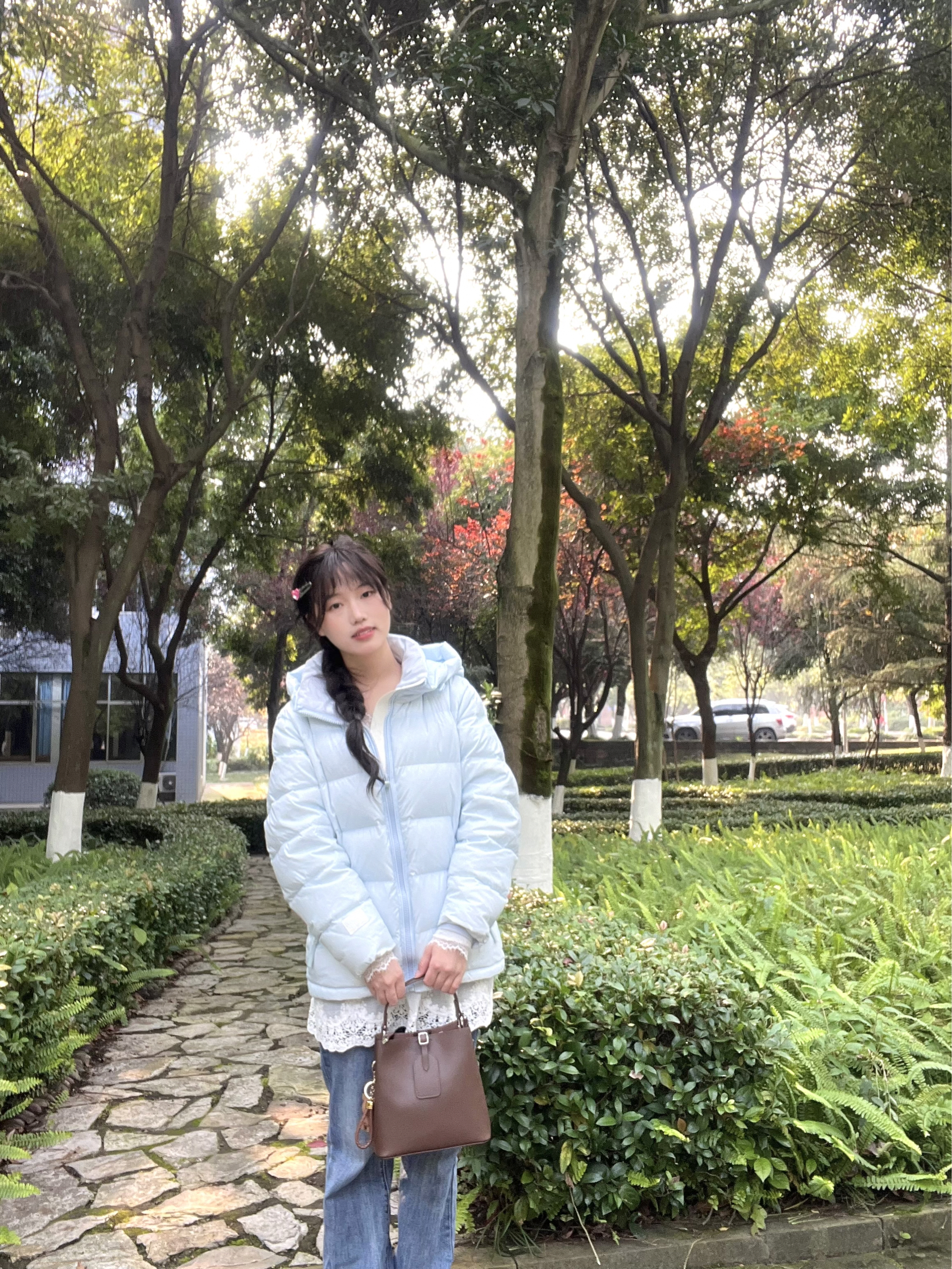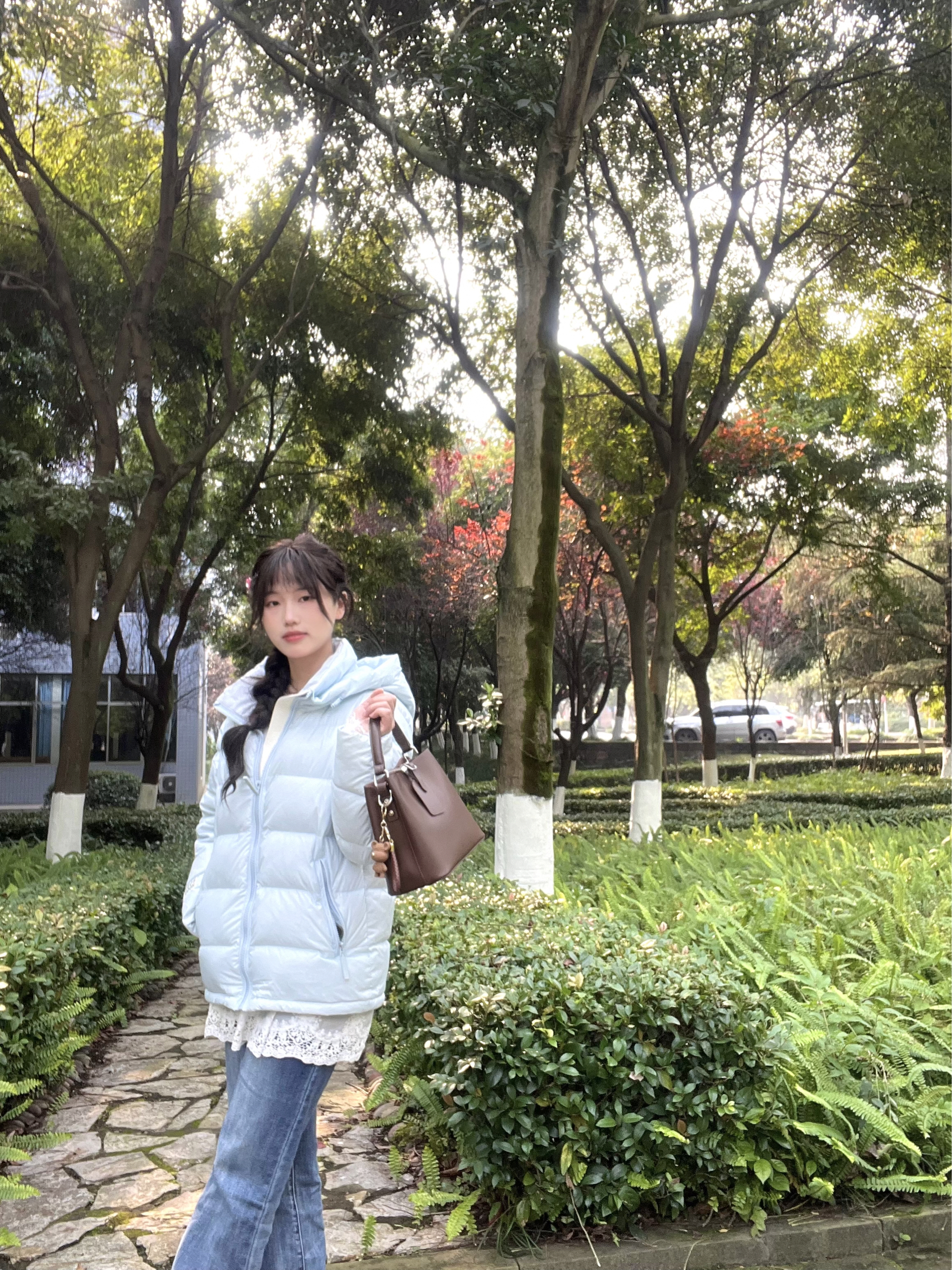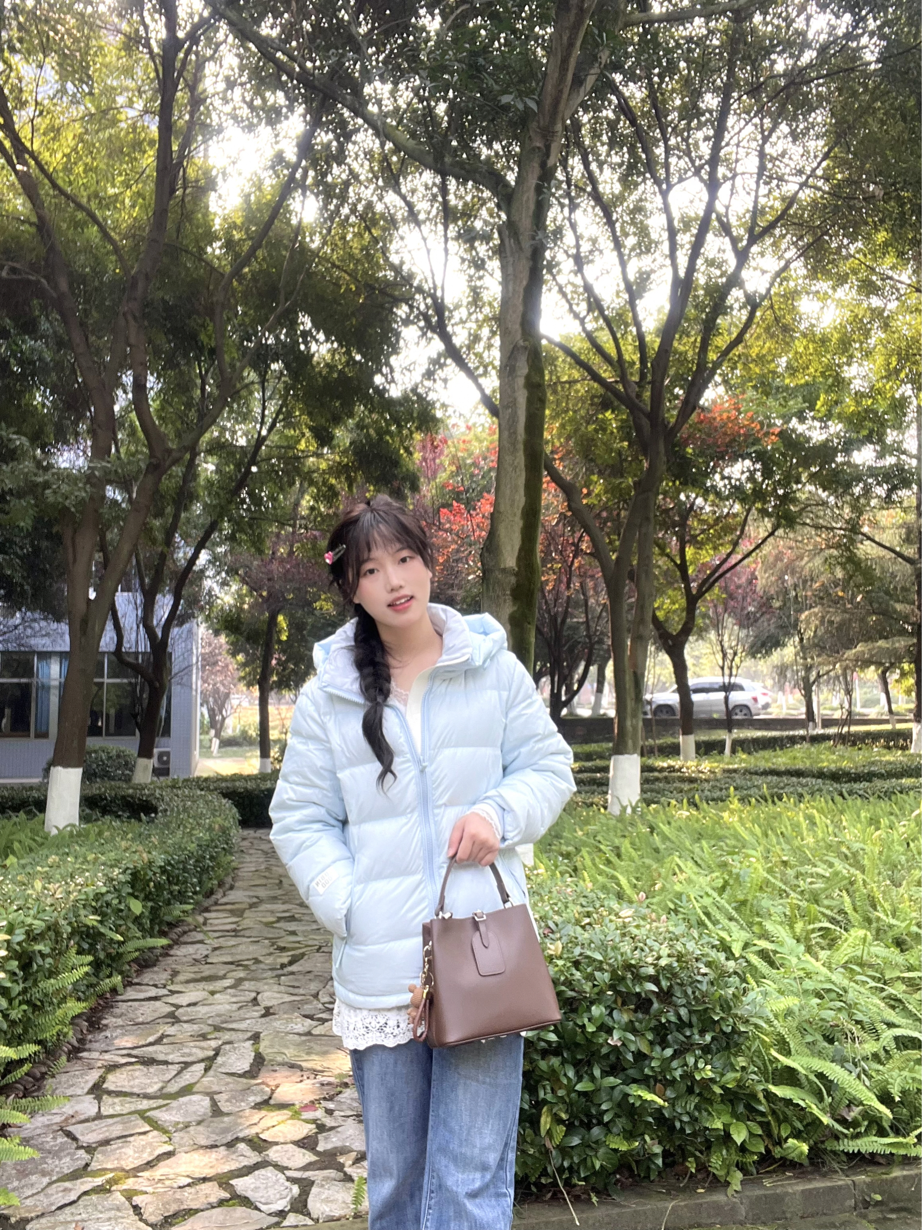 不靠建模靠穿搭也能变身美美girl👧🏻 今天穿杨超越妹妹同款罗宾汉羽绒服🌟 淡淡的蓝真的很可爱◍˃ᵕ˂◍上身秒变甜妹🥰 我的身高158厘米体重50公斤这件穿的M码哦 搭配这个通勤包包简直时尚感拉满✨ 冬日通勤必备小包,学生党上班族都能轻松驾驭