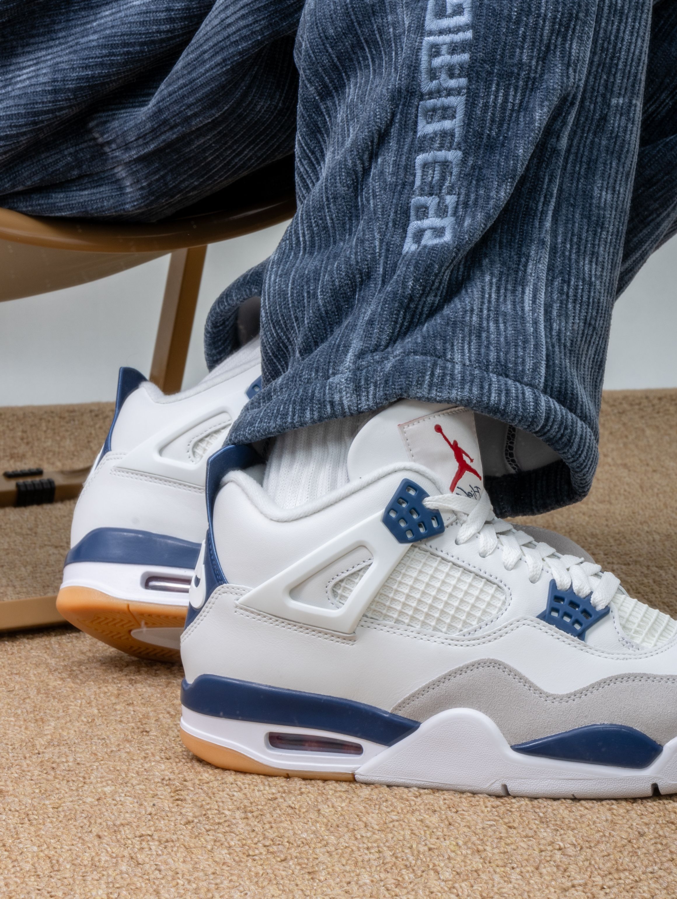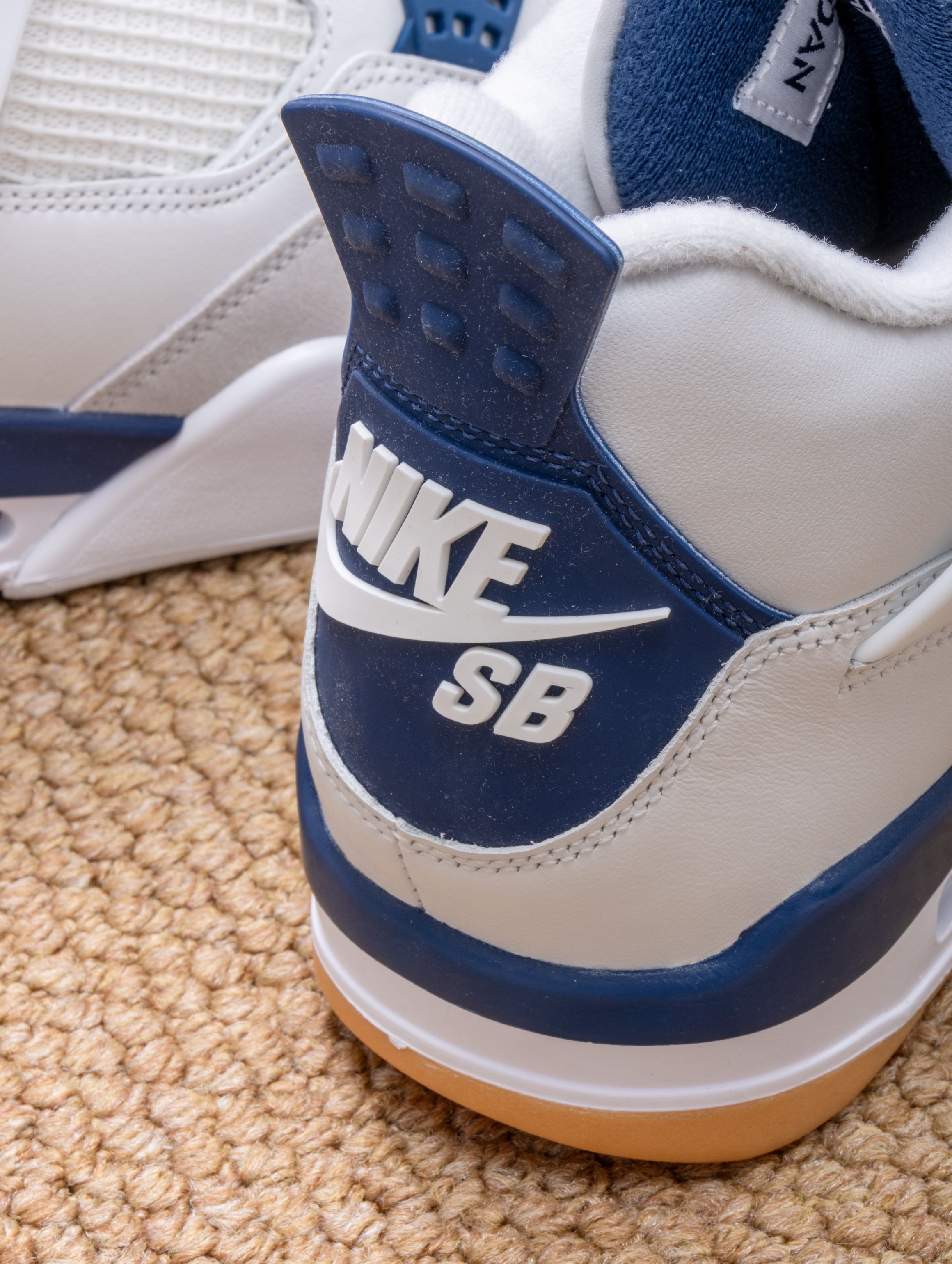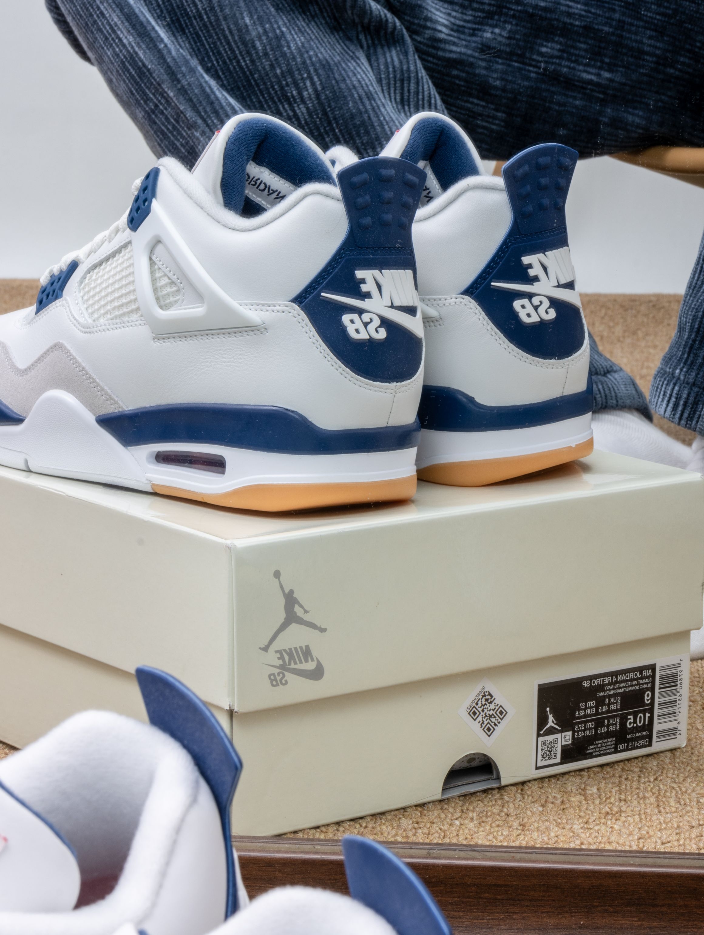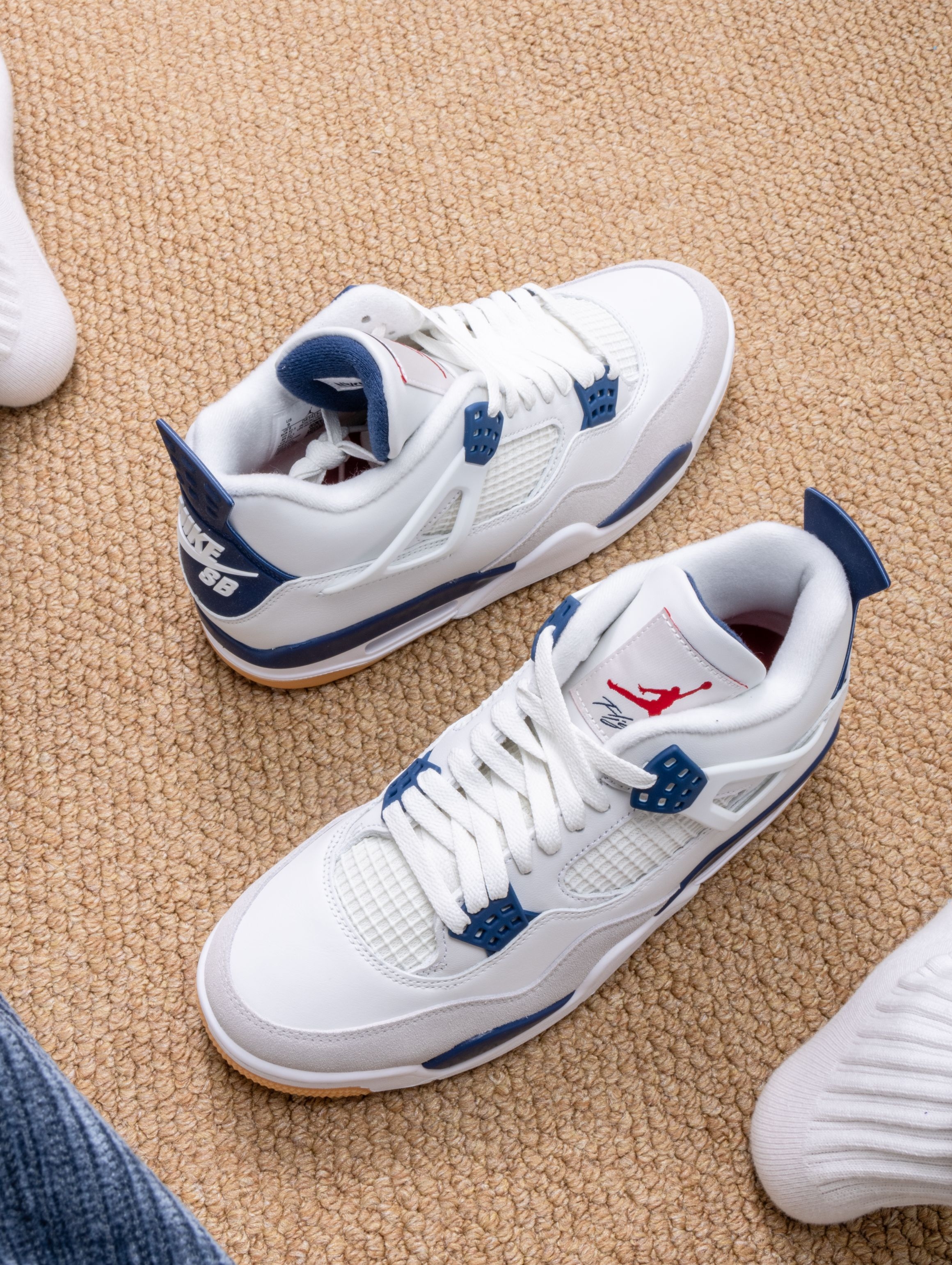 实物是带点灰调的海军蓝麂皮,搭配米白皮革,清爽又不失质感。SB版本果然更贴心,加厚的鞋舌和更软的鞋垫,穿上就像踩着云朵散步,逛一天街脚底都不会抗议。 随手搭条卡其裤或浅色牛仔,整个人都显得干净又松弛。它不像普通AJ4那么板正,自带一股滑板少年的随意感,是那种能陪你从街头玩到海边的万能鞋。 自从穿上它,手机里多了好多张蓝天下的鞋照——好看又好穿,大概就是心动的理由吧