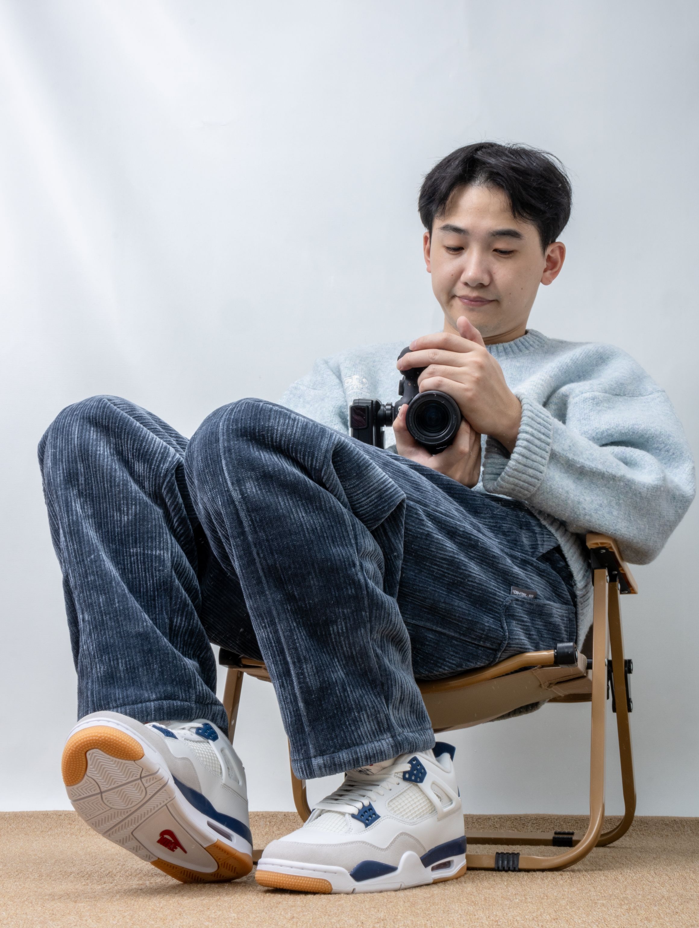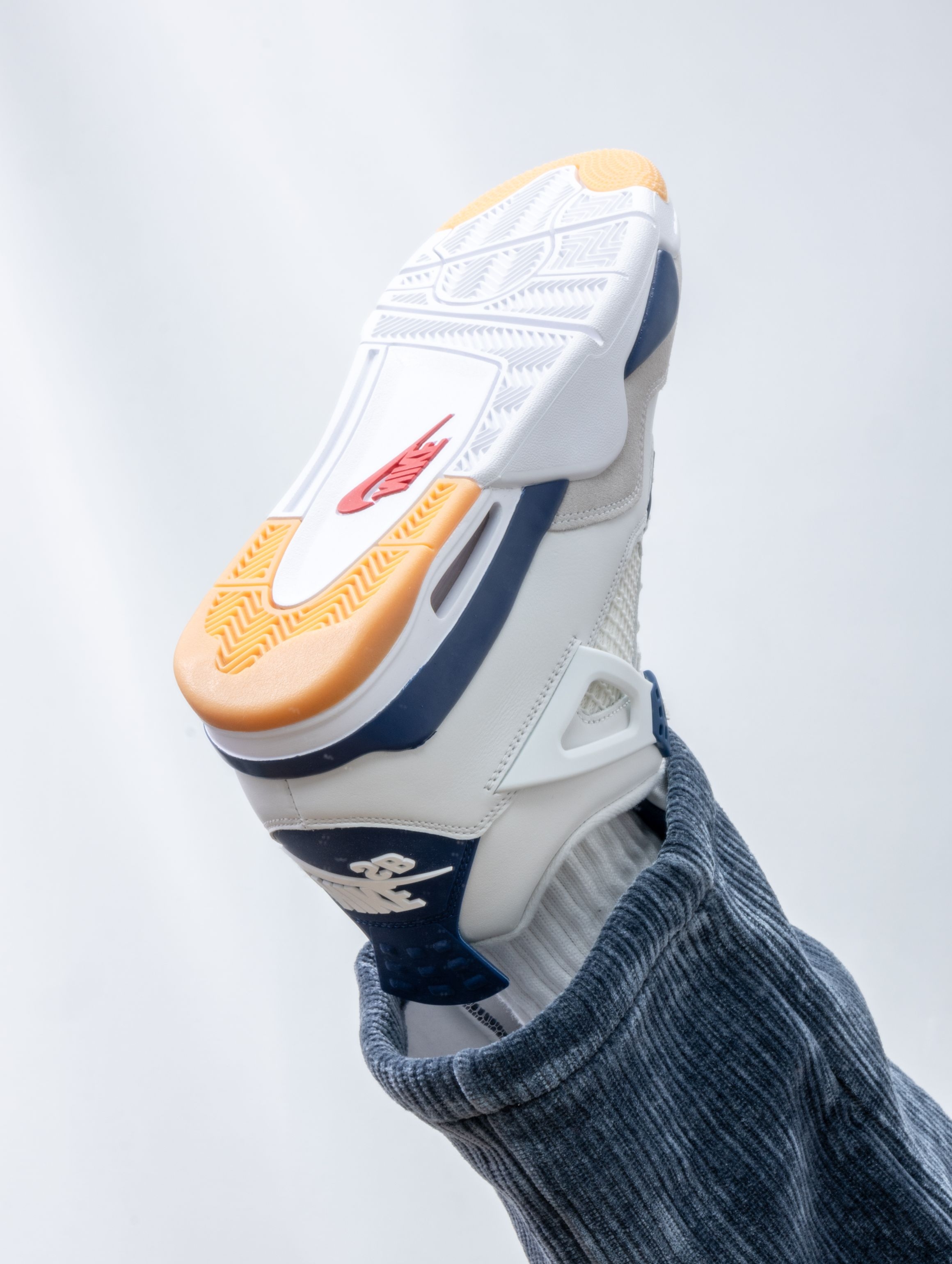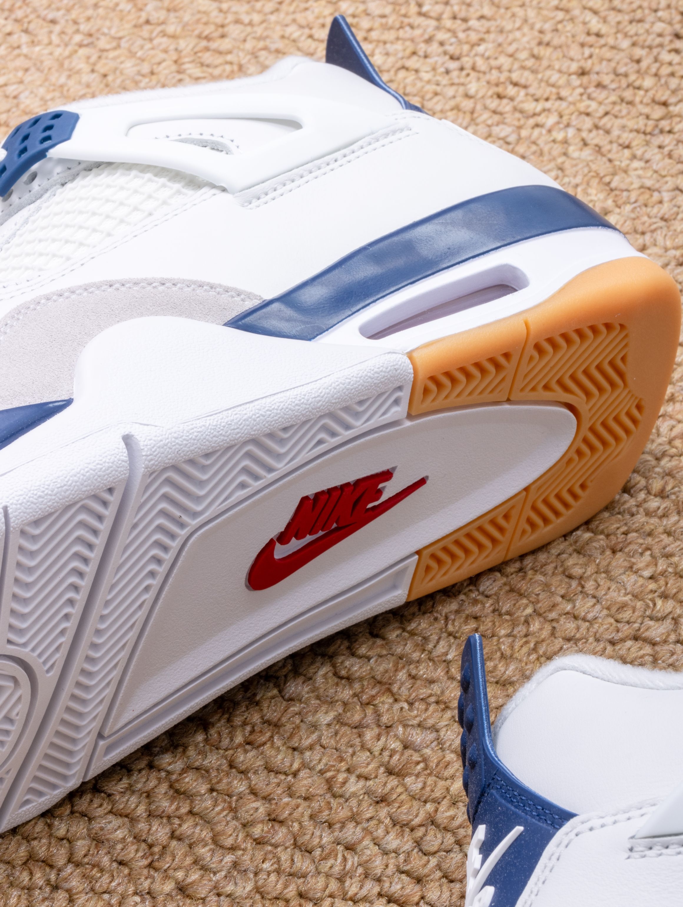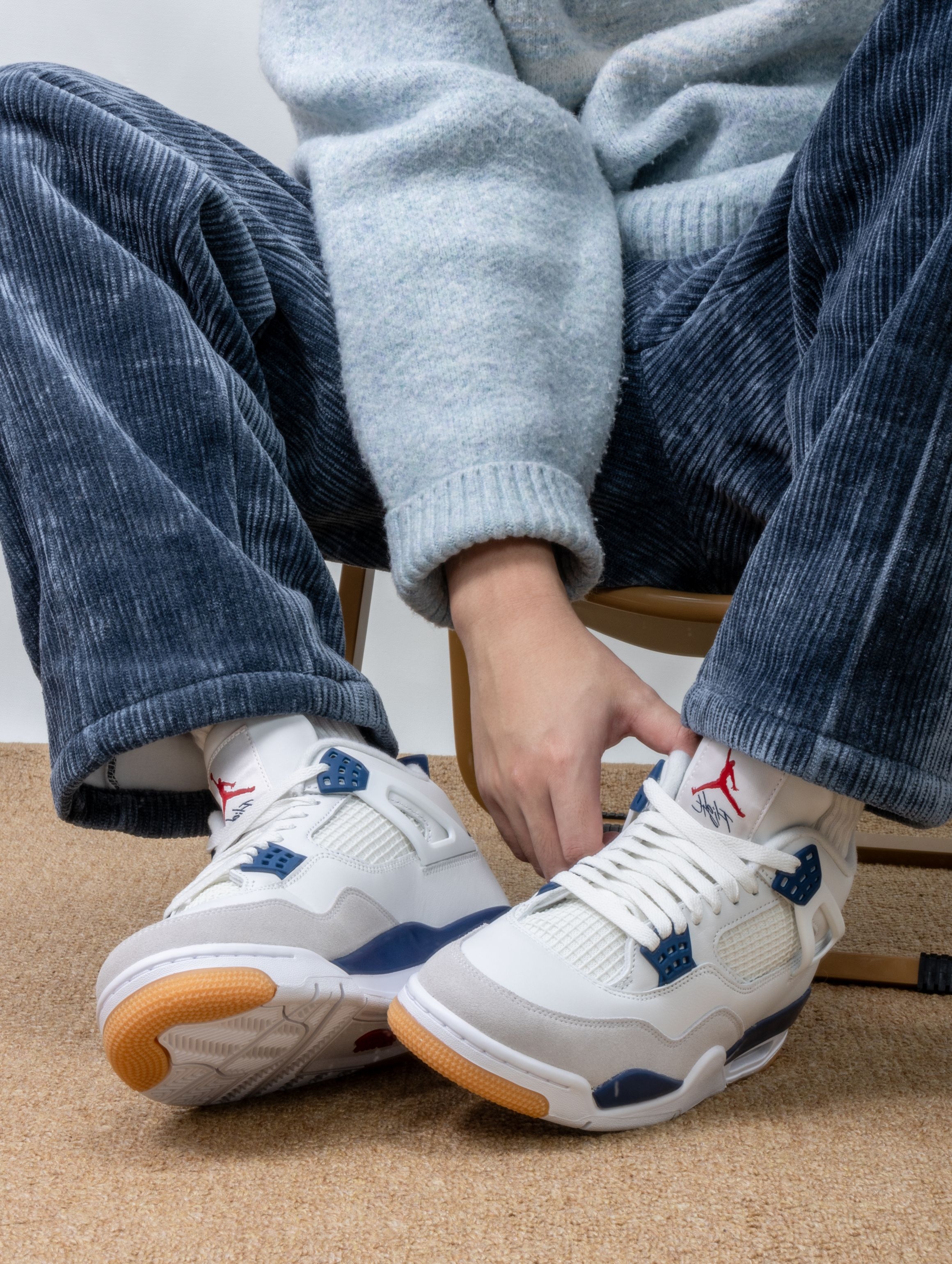 实物是带点灰调的海军蓝麂皮,搭配米白皮革,清爽又不失质感。SB版本果然更贴心,加厚的鞋舌和更软的鞋垫,穿上就像踩着云朵散步,逛一天街脚底都不会抗议。 随手搭条卡其裤或浅色牛仔,整个人都显得干净又松弛。它不像普通AJ4那么板正,自带一股滑板少年的随意感,是那种能陪你从街头玩到海边的万能鞋。 自从穿上它,手机里多了好多张蓝天下的鞋照——好看又好穿,大概就是心动的理由吧
