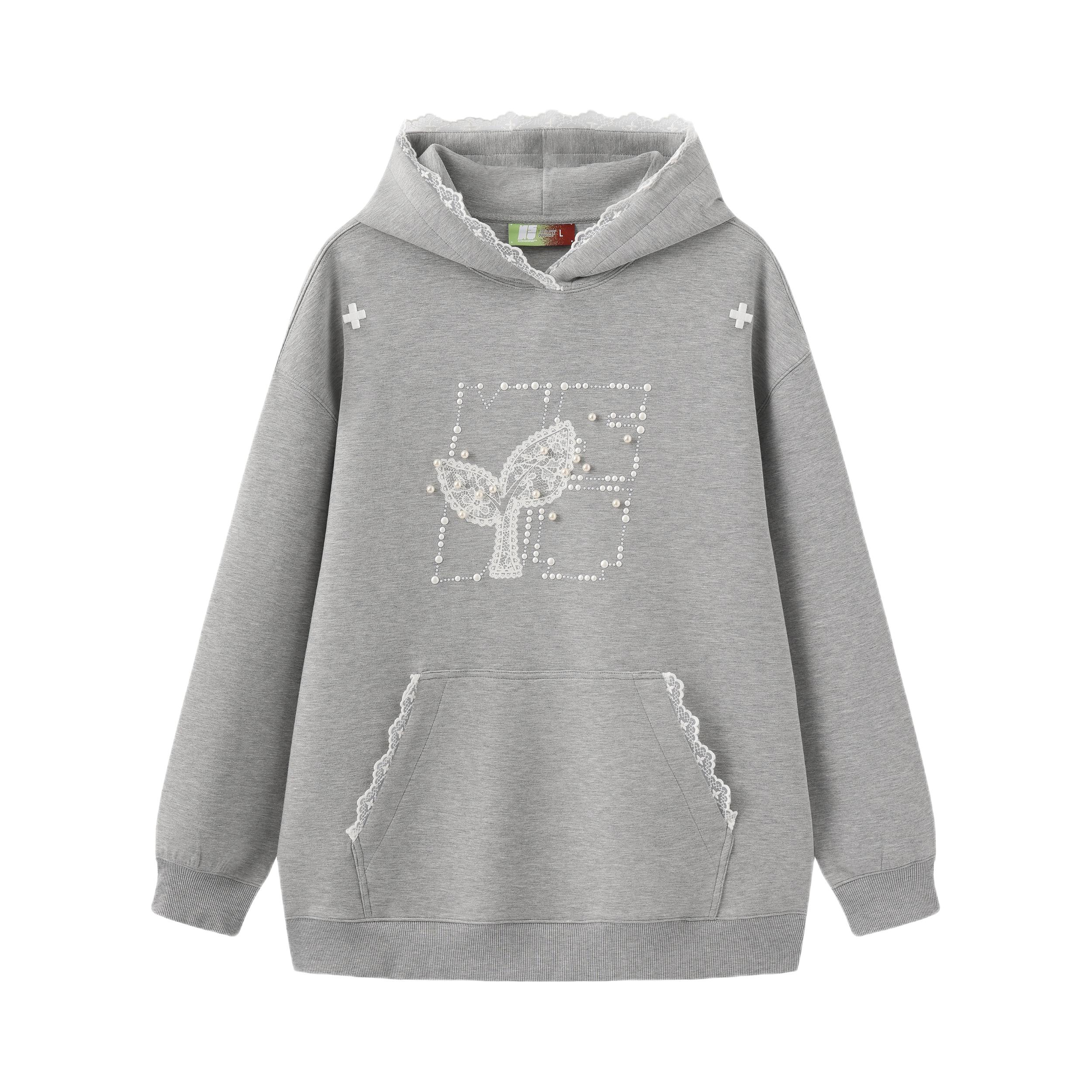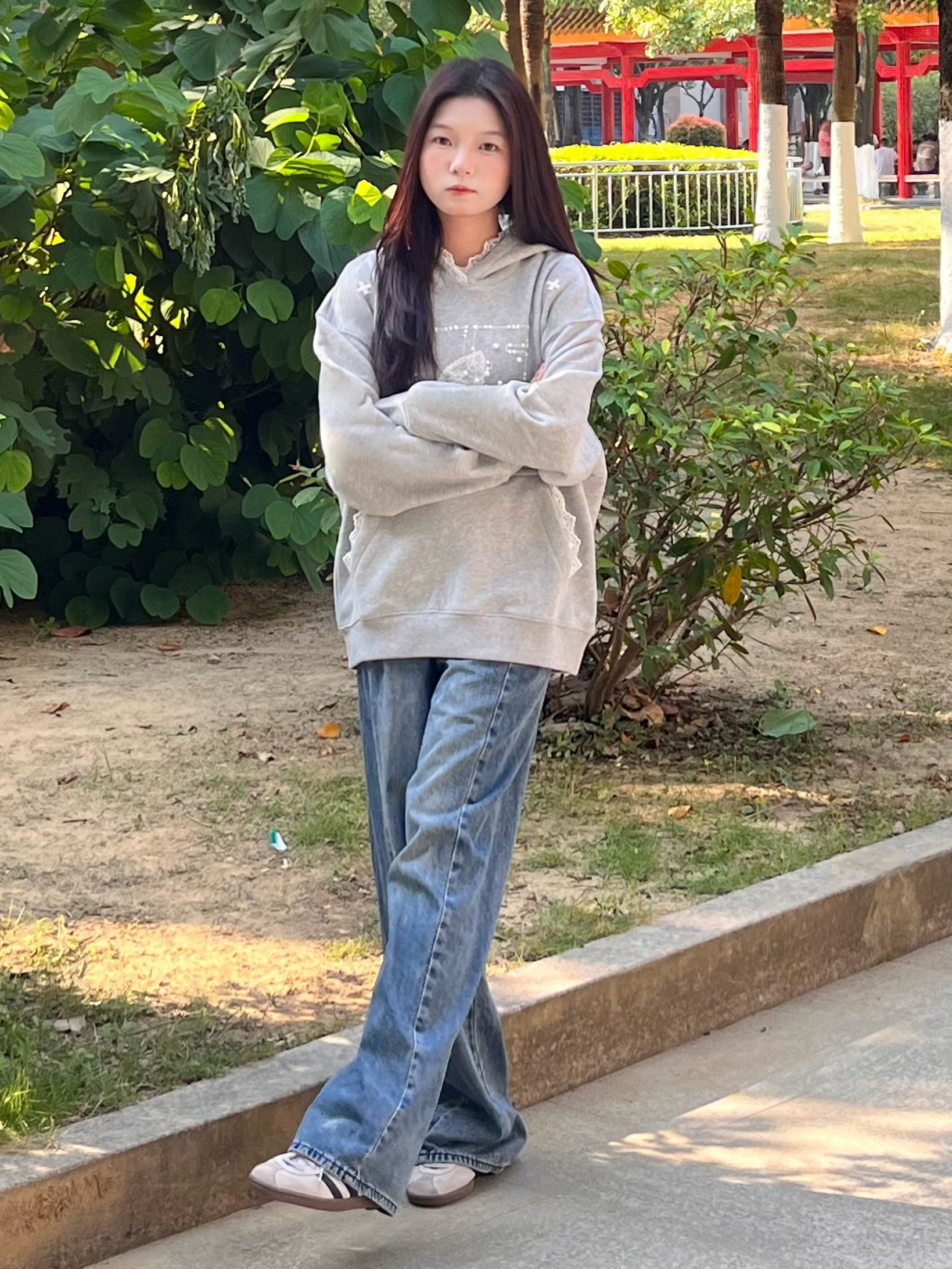 灰色卫衣+直筒裤+德训鞋 卫衣帽子和口袋都有蕾丝边设计 很好看 面料柔软舒适 不闷 版型正 裤子是直筒的牛仔裤 显腿长腿细
