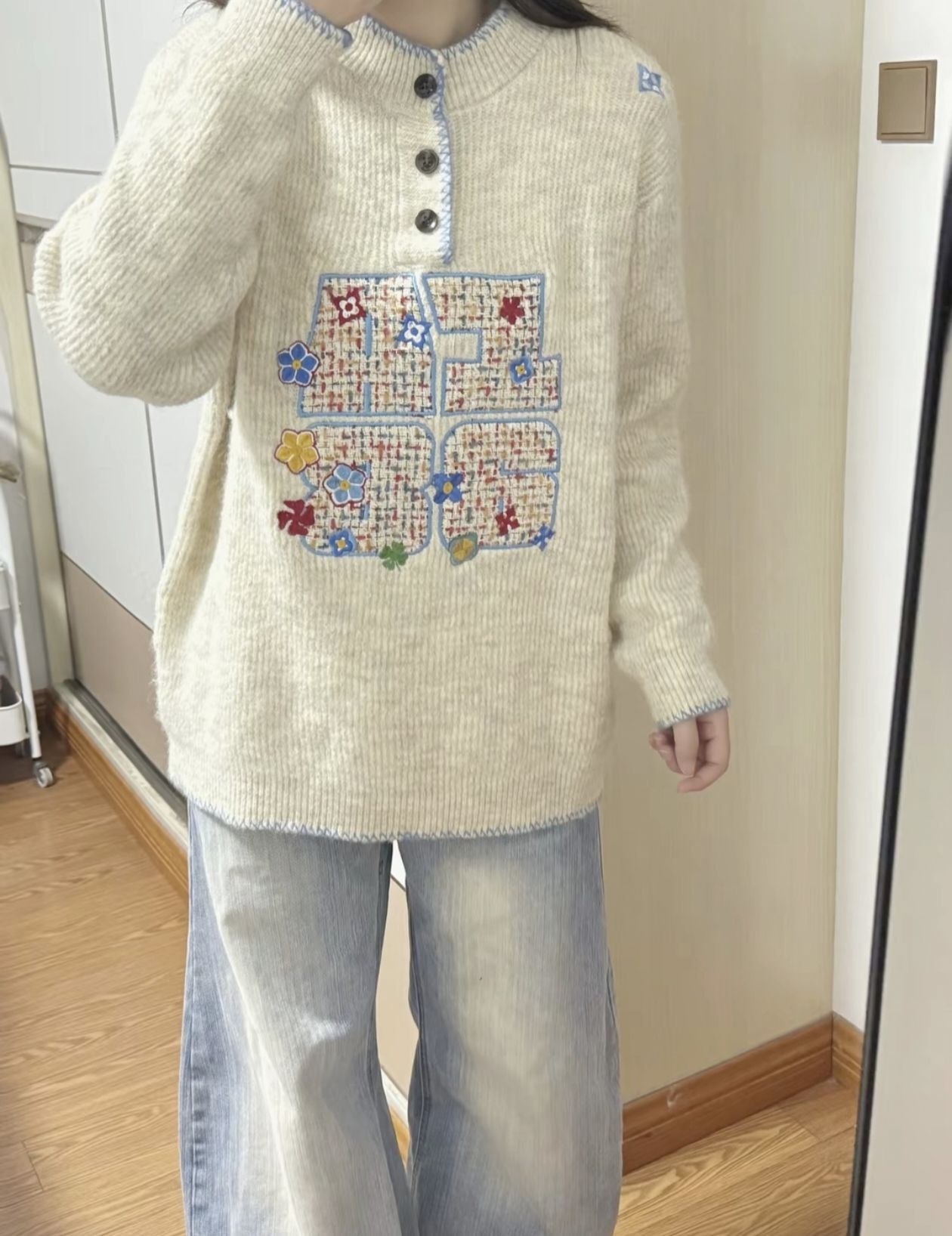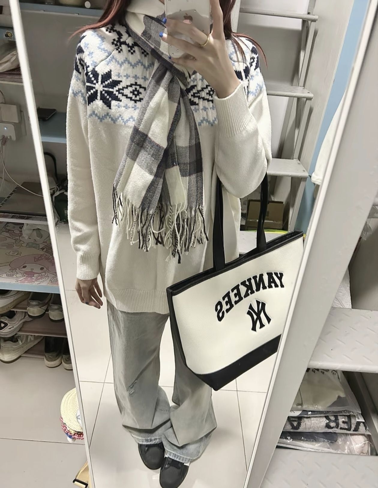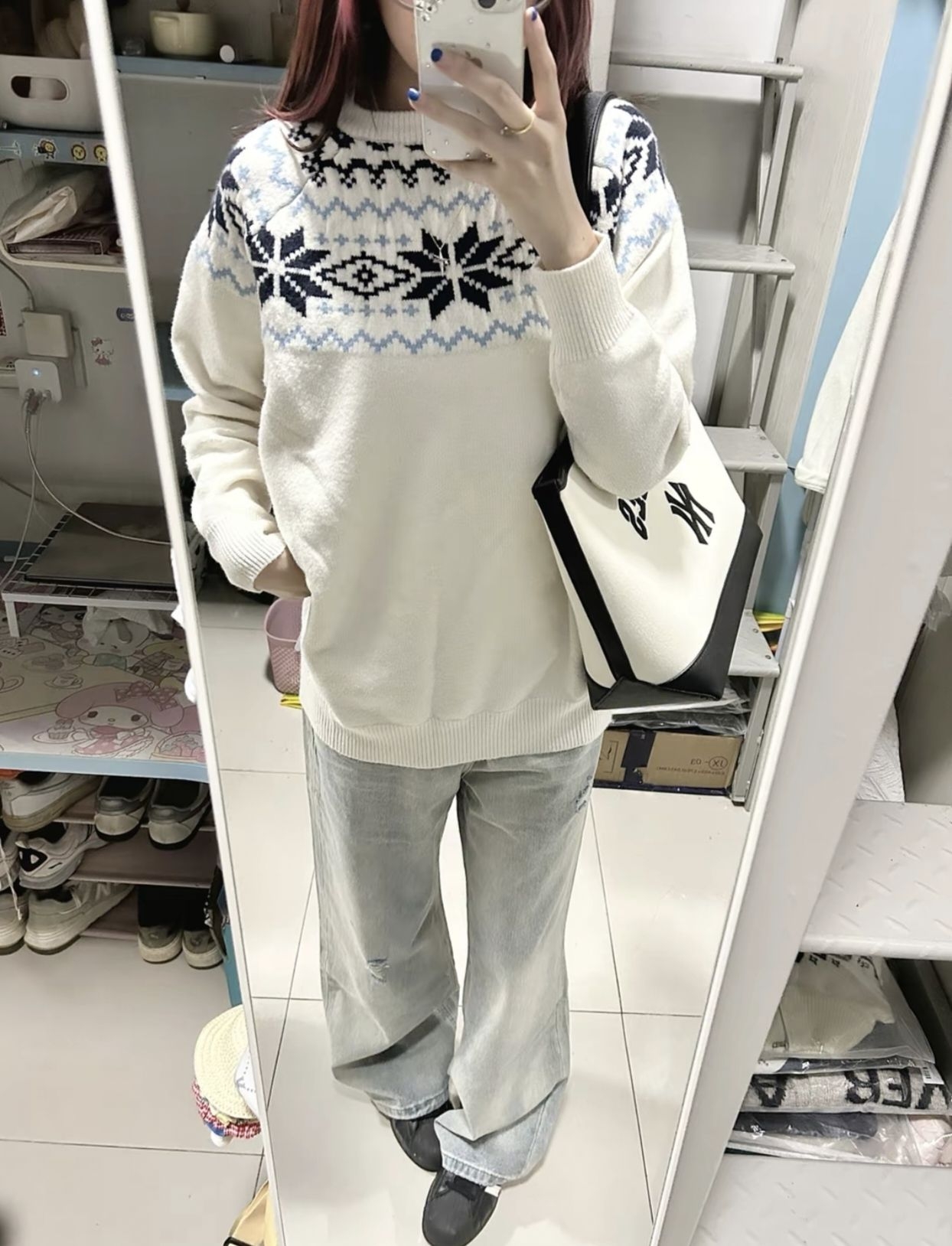 奶白底色+蓝黑雪花/菱格纹,圣诞/冬日氛围直接拉满🎄 软乎乎的面料贴肉不扎,宽松版型藏肉又舒服,搭阔腿裤是慵懒美女,配短裙秒变甜妹! 单穿/内搭都能打,秋冬衣柜缺的那件「不普通基础款」就是它!”