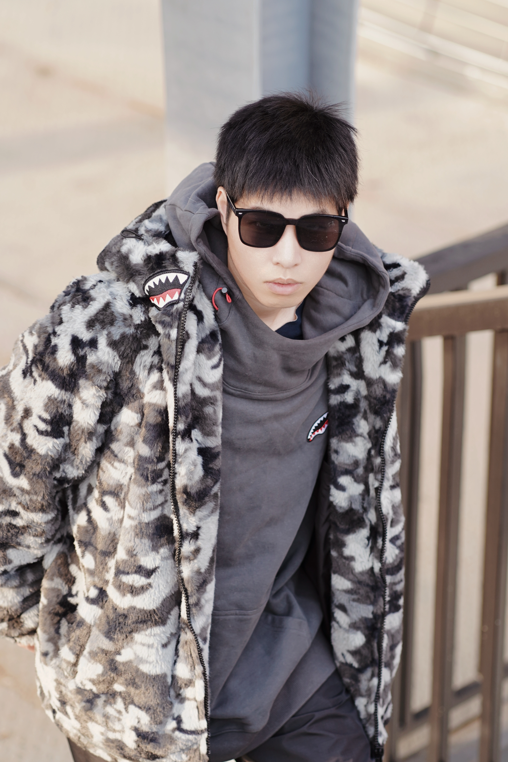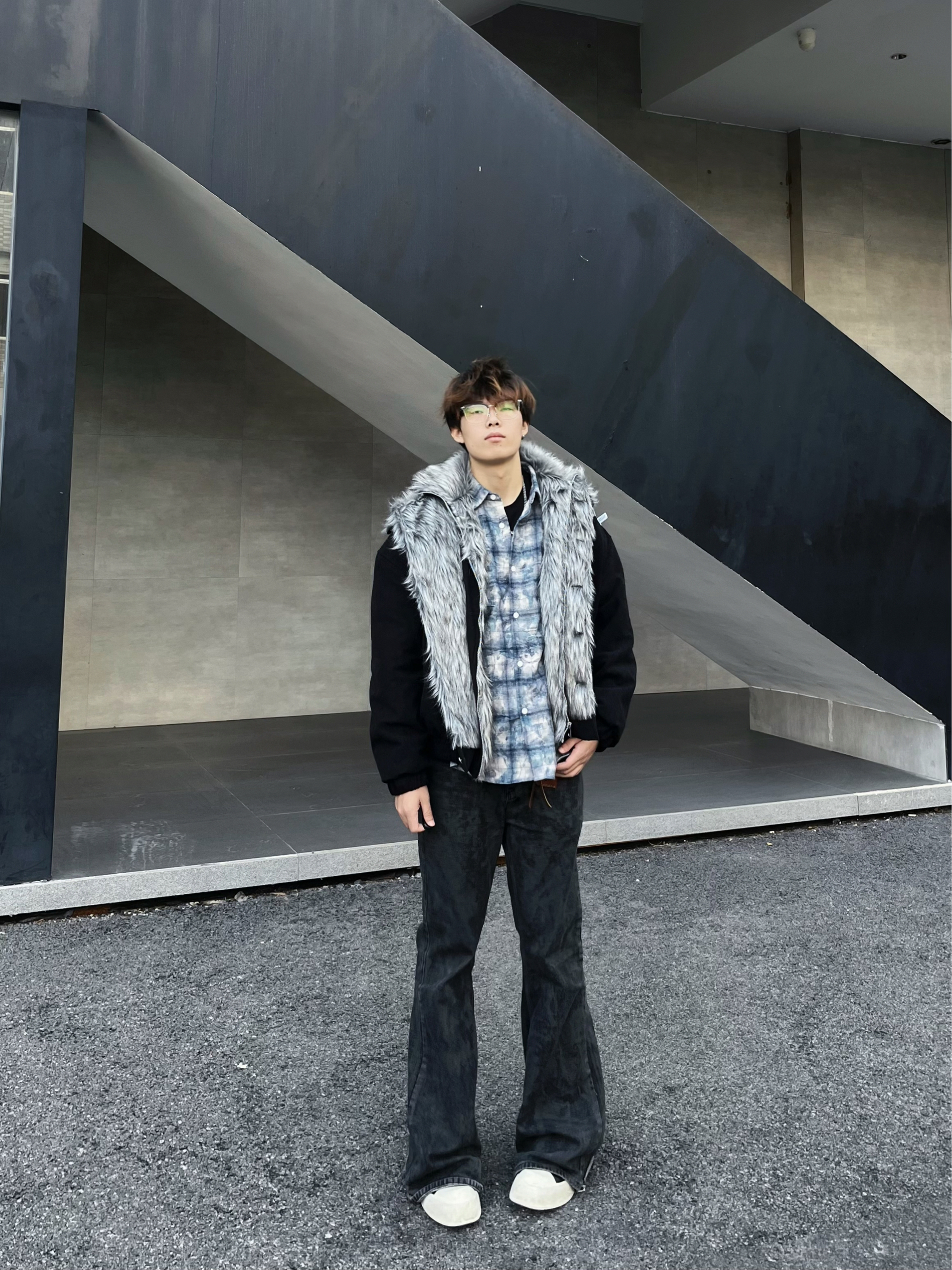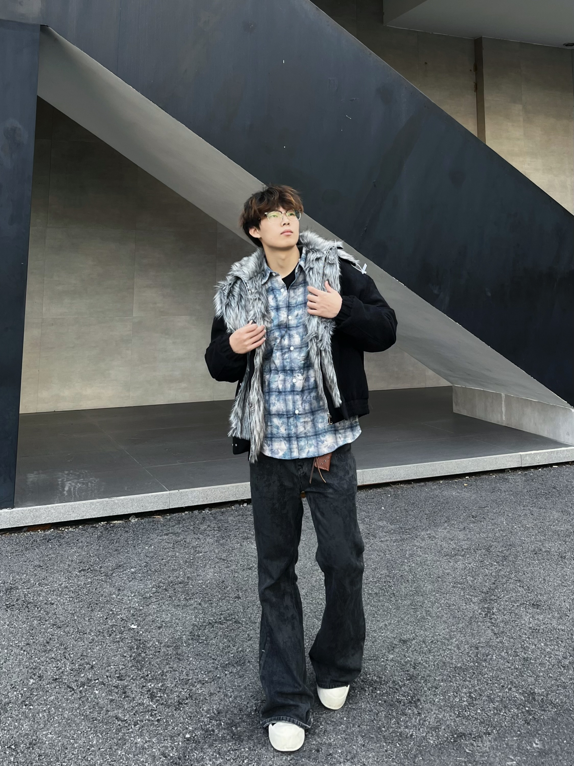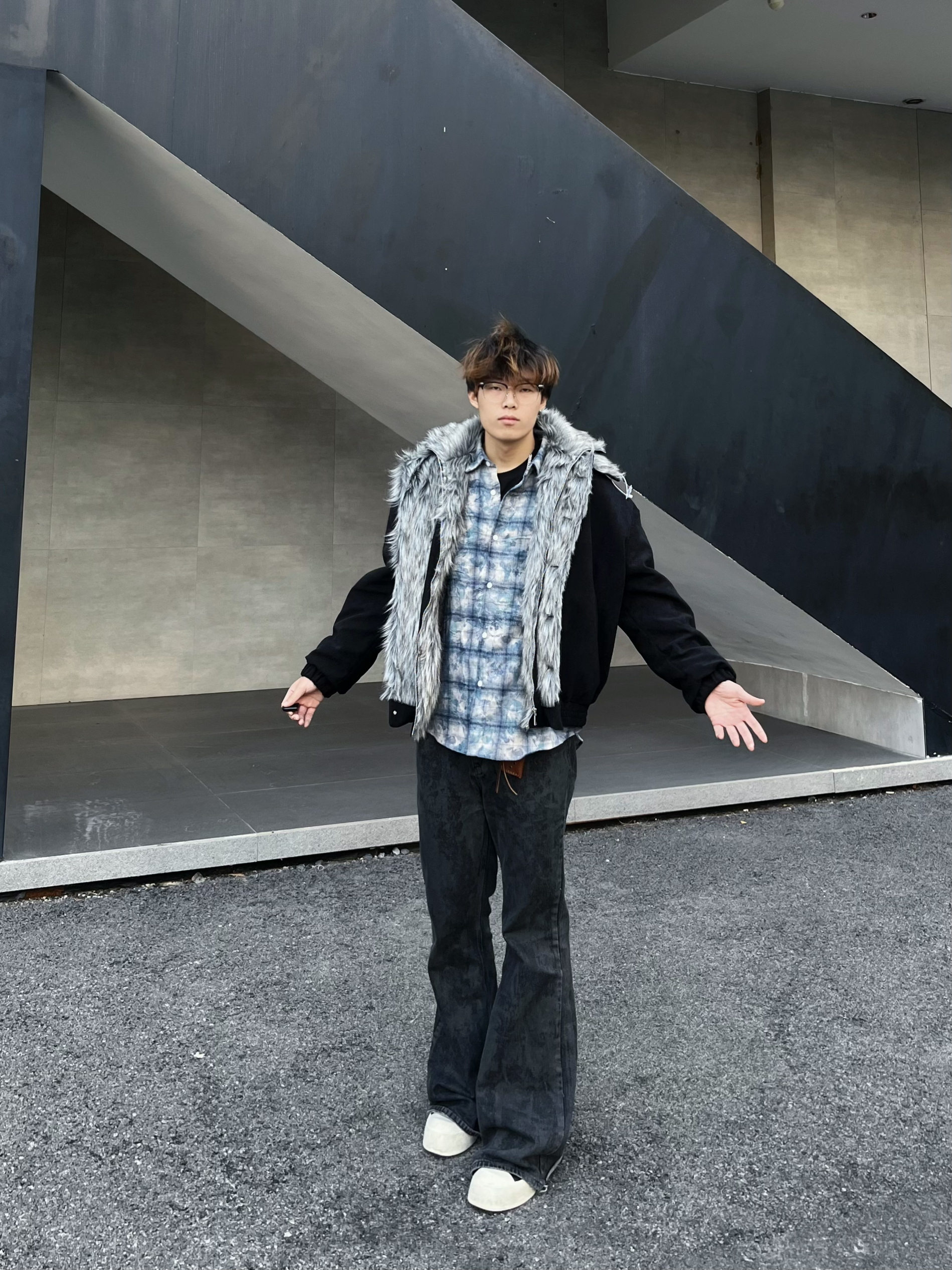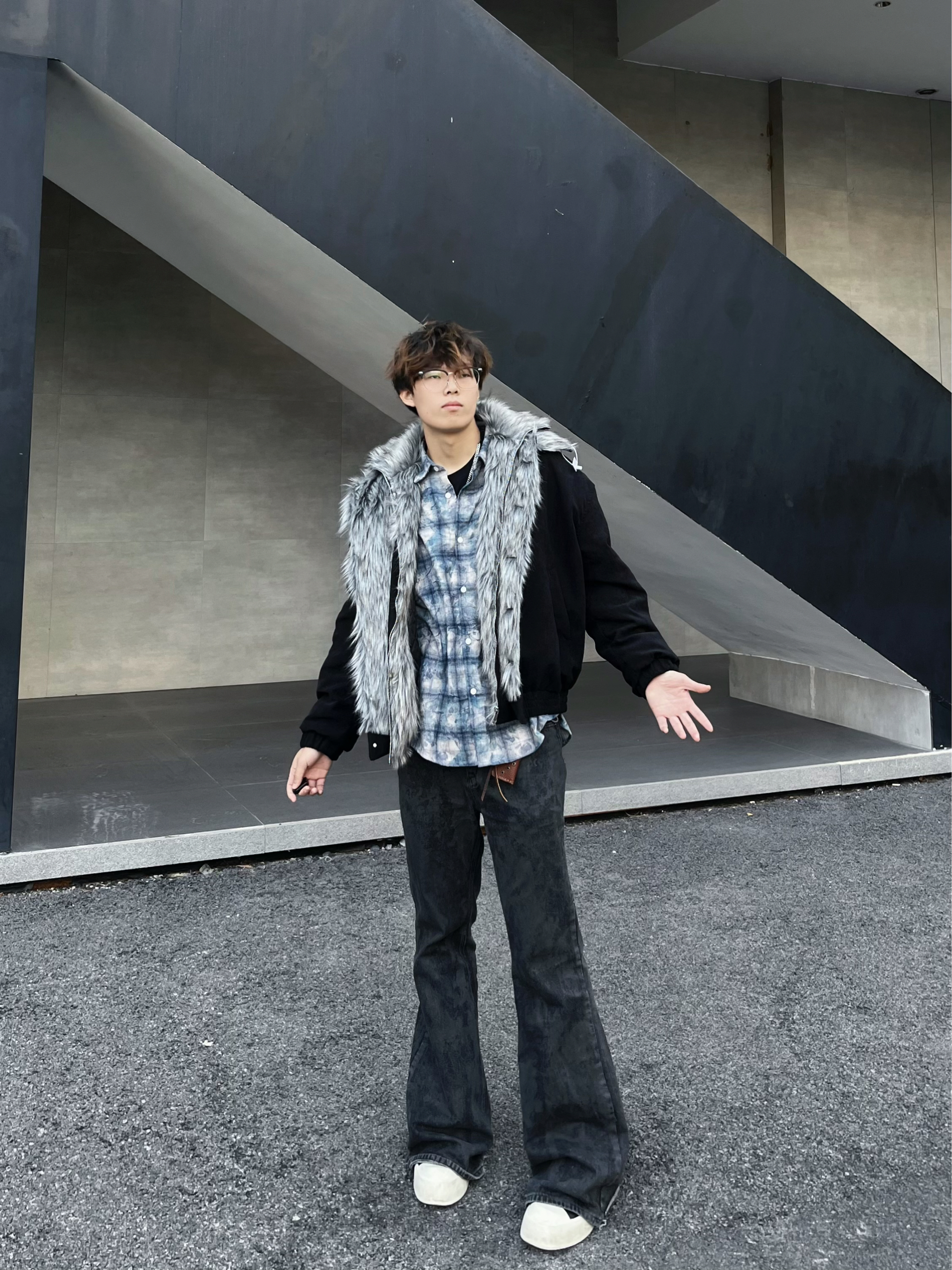 就是图上这件座山雕的款式,领口的狼毛设计真的有点东西~ 灰黑相间的毛流感自带野生气场,但版型却是利落的工装剪裁,两种风格碰撞得意外和谐✨ 内搭蓝白格纹衬衫增加层次,下身配黑色阔腿裤和净色板鞋,整体既霸气又不失清爽感! 在工业风的水泥建筑前,灰色背景衬得外套质感更突出了📸 单手插兜侧身一站,毛领在风里微微拂动的瞬间抓拍,那种不羁又潇洒的调调直接拿捏!秋冬季节穿出去逛街或拍照,这件外套绝对是让你在人群...