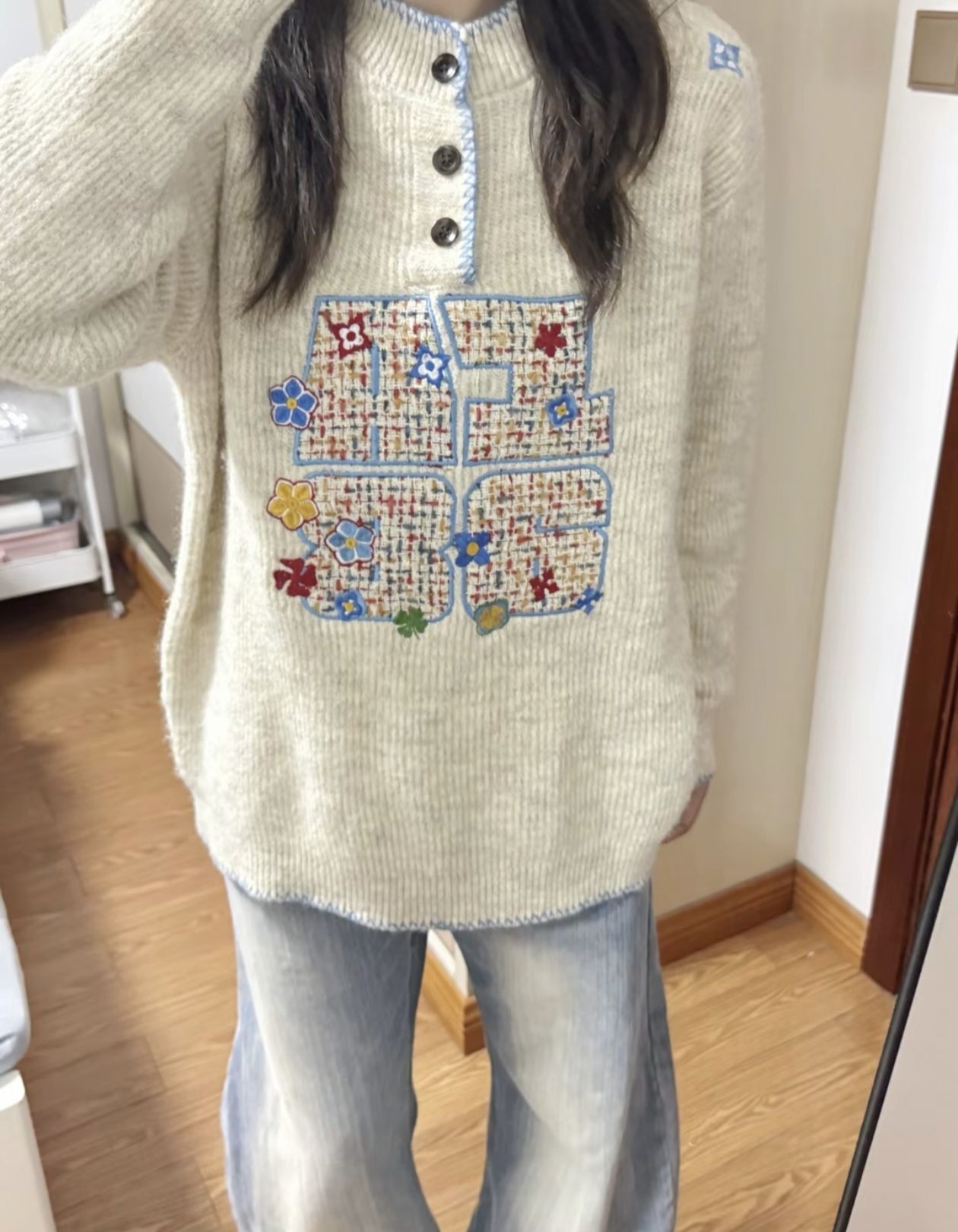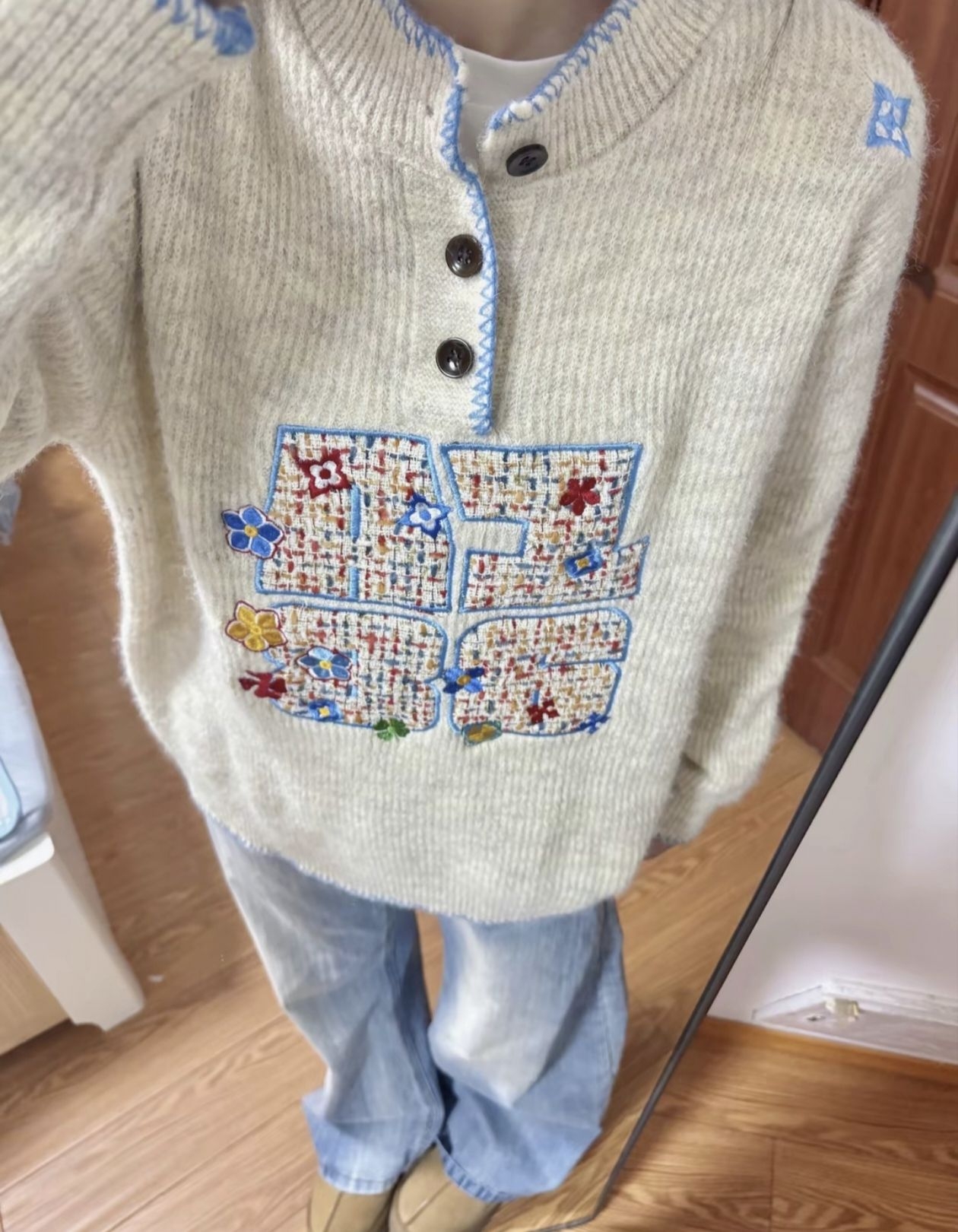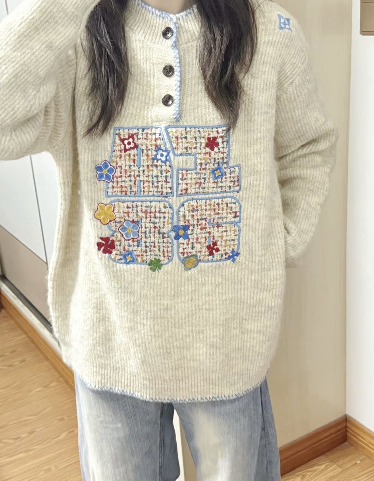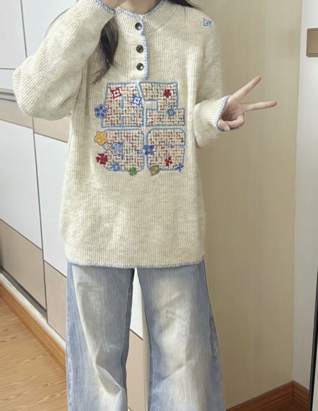 👇这毛衣的细节能让我盯着看半小时!温柔挂但完全不普通 奶fufu的米白针织也太戳秋冬氛围了—— 领口+下摆的蓝边锁线巨精致,中间的拼贴字母绣满小花,杂而不乱的彩色点缀直接把“慵懒松弛感”拉满! 版型是oversize的宽松款,配阔腿裤软乎乎像裹了团云,面料是那种糯糯的不扎皮肤,单穿内搭都好看,属于“随手一套就赢很大”的温柔系战衣~ (附:实物的纹理比照片更有质感,小花刺绣针脚超工整,洗过也不会皱!...