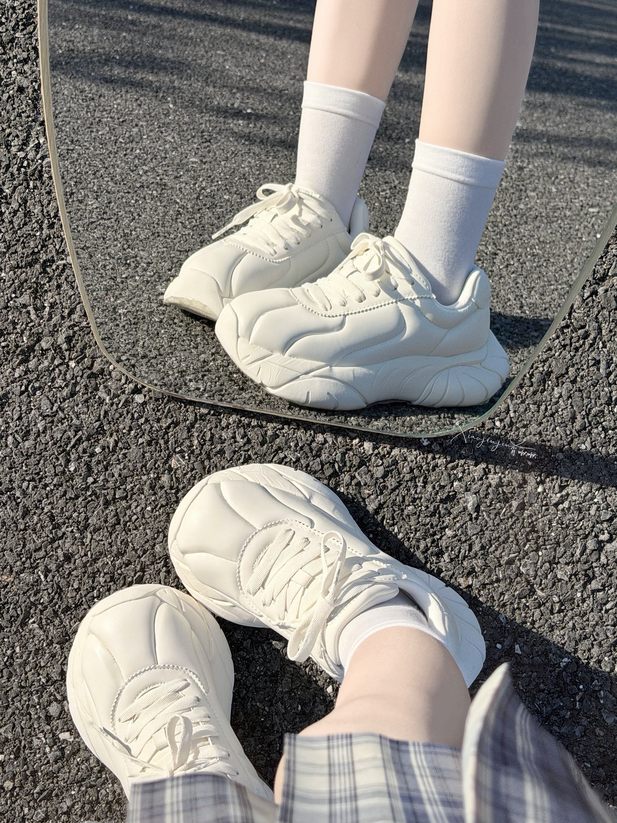 可以呀 下午暖和的嘞☀️,20度 啾啾约了朋友去买脐橙 搭配了白色泡芙厚底鞋和蓝色格子裙,是阳光氧气感女孩👧 鞋子自带增高,鞋型穿起来舒服~ 买了一箱赣南脐橙 尝了一个甜甜的🍊~ 鞋:CN泡芙鞋