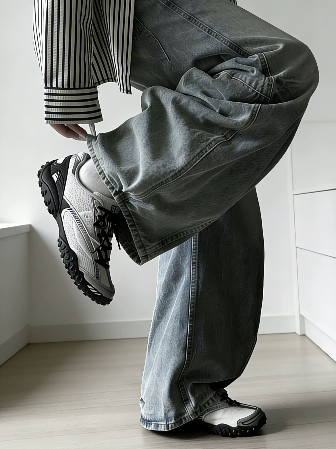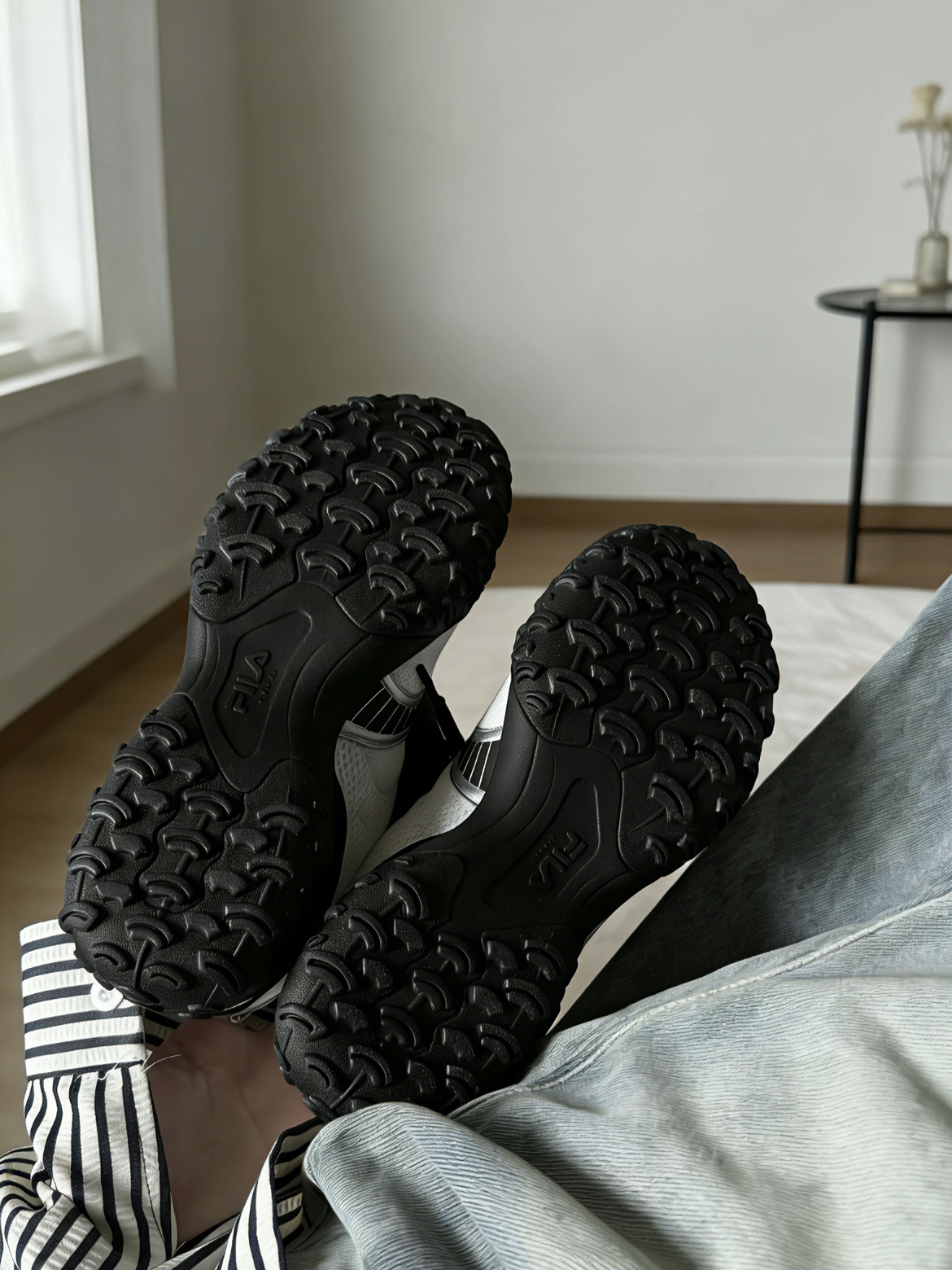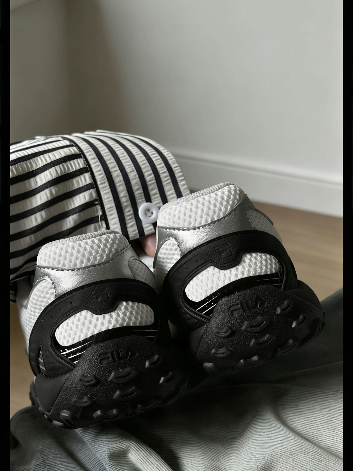 这双FILA的鞋面是网面拼接的,带着银色线条。鞋头两边有点不对称,设计上挺特别的,有点复古的感觉。 鞋底软硬适中,走路有回弹,穿起来确实舒服。款式比较简洁,配短裙或者裤子都行,挺适合大多数人穿的。