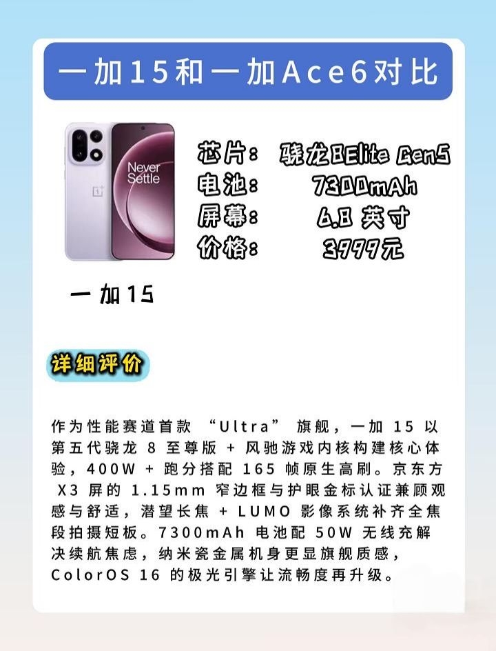 本篇笔记关联了OnePlus/一加 Ace6 5G 手机 165Hz超高刷 7800mAh冰川电池 电竞护眼 旗舰三芯 全网通 快充 双卡 快银、OnePlus/一加 15 5G手机 1.5K 165hz超高刷新率 极简线条 通体哑光质感 航天级纳米瓷金属摄像Deco 超高帧 性能旗舰 大电池 全网通 快充 雾光紫等商品,为用户提供真实的使用体验和购买参考。