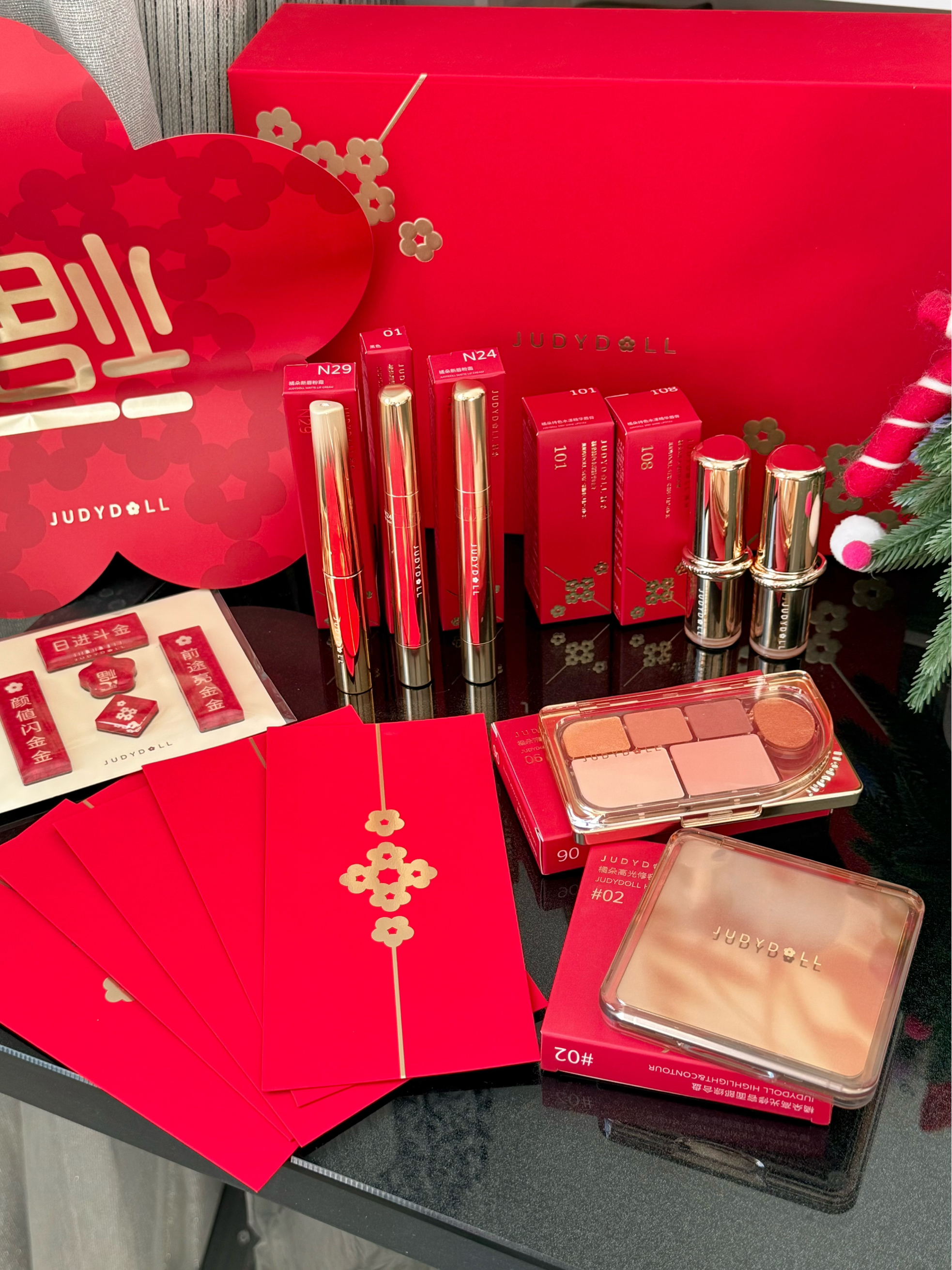 不知不觉又快过年了,不知道是橘朵哪个神人出的点金礼盒,把一些热门好用的单品全都加到了礼盒里,还都是新年限定包装 红色金色的,看着就贵气十足、年味满满 - 1️⃣六色眼影盘06 金棕色系眼影+裸杏色腮红,轻松搞定贵气千金感妆容 2️⃣高光修容盘02树影盘 热门常青树,我铁皮无数盘了,修容高光一盘搞定,调色刚刚好,不会发回发红,自然重塑骨相,徒手捏脸不是梦了! 3️⃣胶原精华口红 上嘴一秒就惊艳到我了...