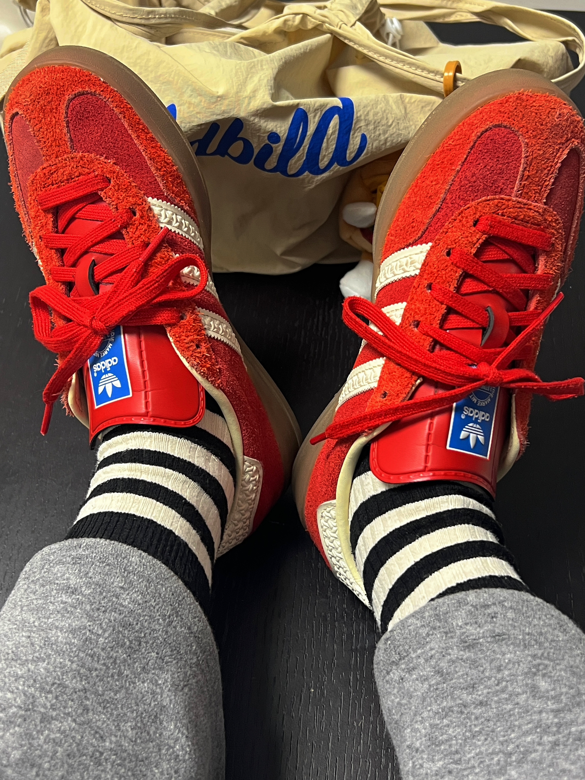 阿迪的这款德训 浓郁的红色麂皮搭配经典白色条纹 炒鸡吸睛 蓝色鞋标点缀 又增添了点小设计感 鞋子舒适度🉑️ 鞋型显脚小 最重要 德训鞋很好搭配 亲测! 接下来的圣诞 跨年 氛围感拿捏