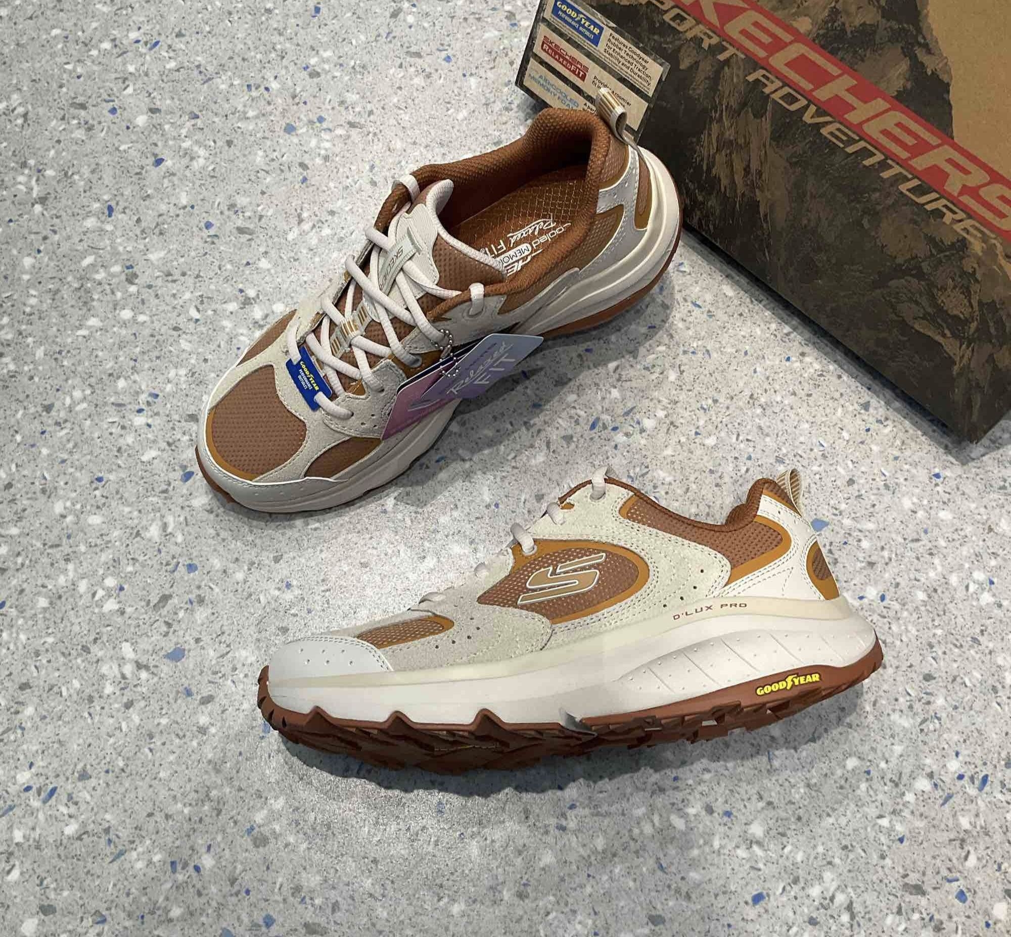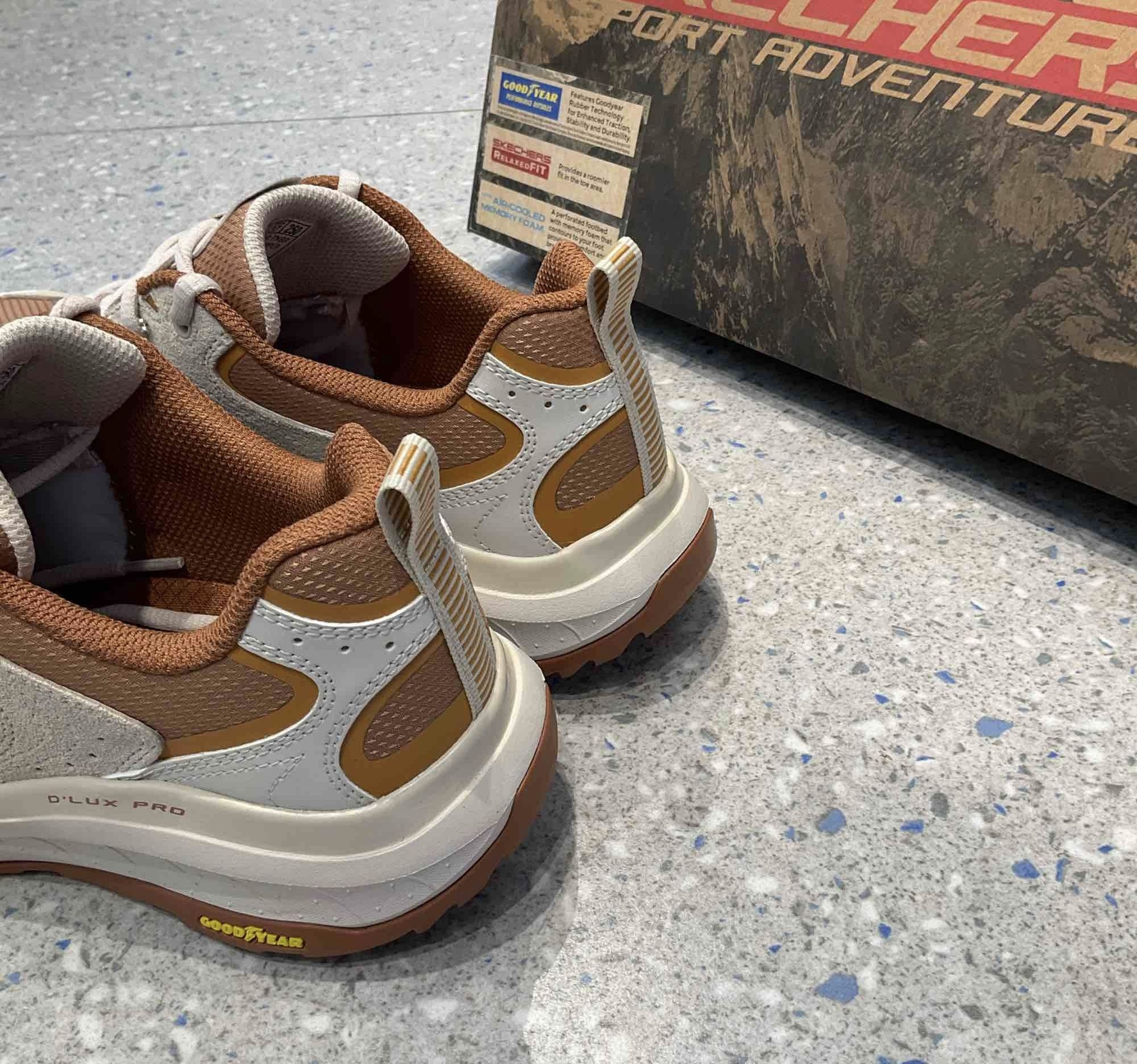 多种材质拼接看着还挺有质感。穿着应该挺舒服,斯凯奇的舒适口碑一直在线,而且这种户外风格的设计,日常穿或者轻度户外走走都合适,属于那种既好看又实用的类型,性价比和颜值都能打。