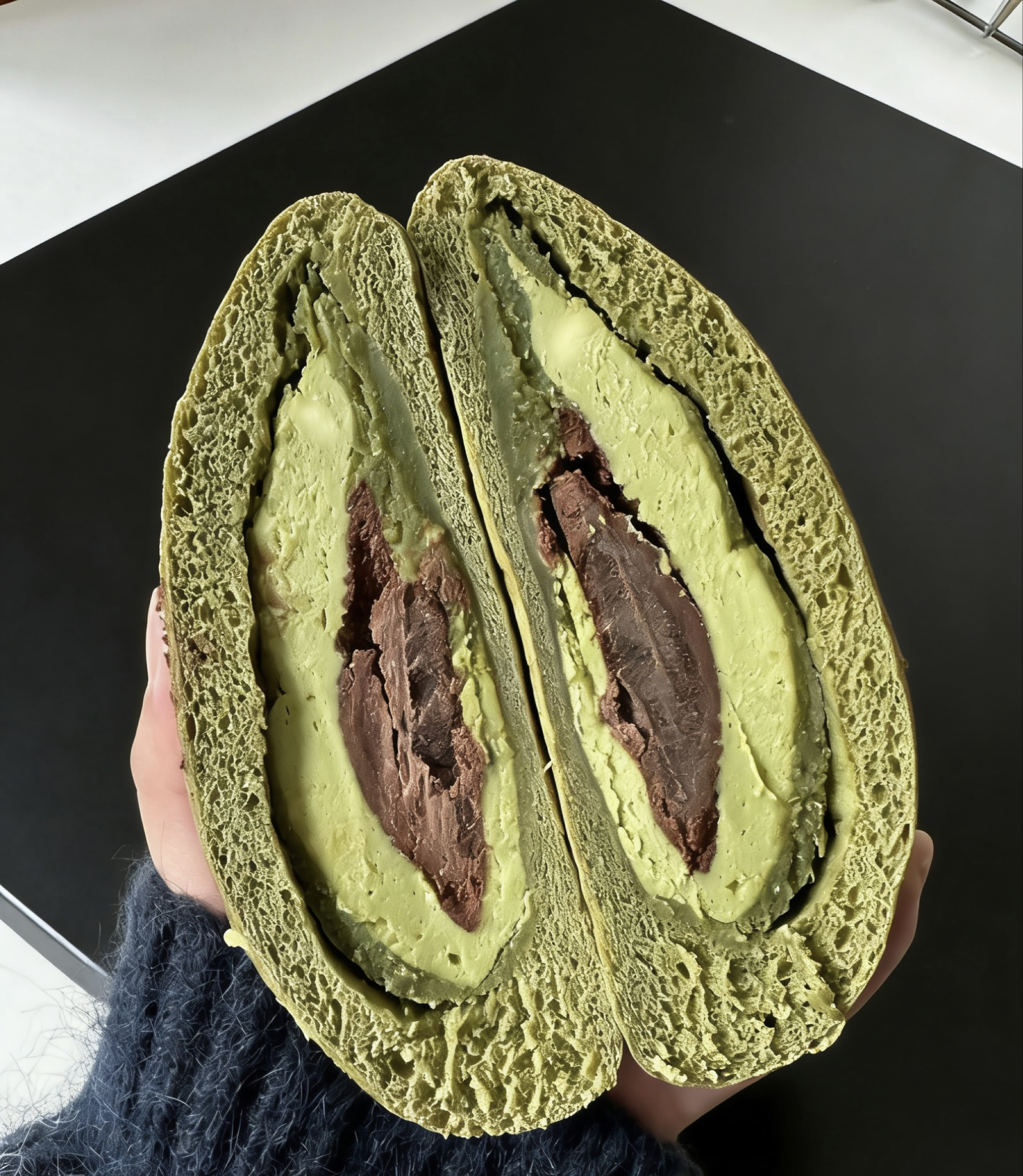 牛油果干酪巧克力欧包 【颜值暴击】 抹茶绿的面包体像一块刚从森林里摘来的“牛油果原石”,切开瞬间直接被内馅美晕——浅绿干酪层裹着深棕巧克力块,像把春天的清新和夏天的浓郁叠在了一起,拍照发圈被问爆链接! 【口感层次】 面包体软fufu带着抹茶的微苦清香,干酪馅细腻绵密像在吃“云朵奶油”,巧克力块加热后会流心,咬一口先是茶香,再是奶香,最后是巧克力的丝滑回甘,味蕾像坐过山车一样惊喜! 【治愈...