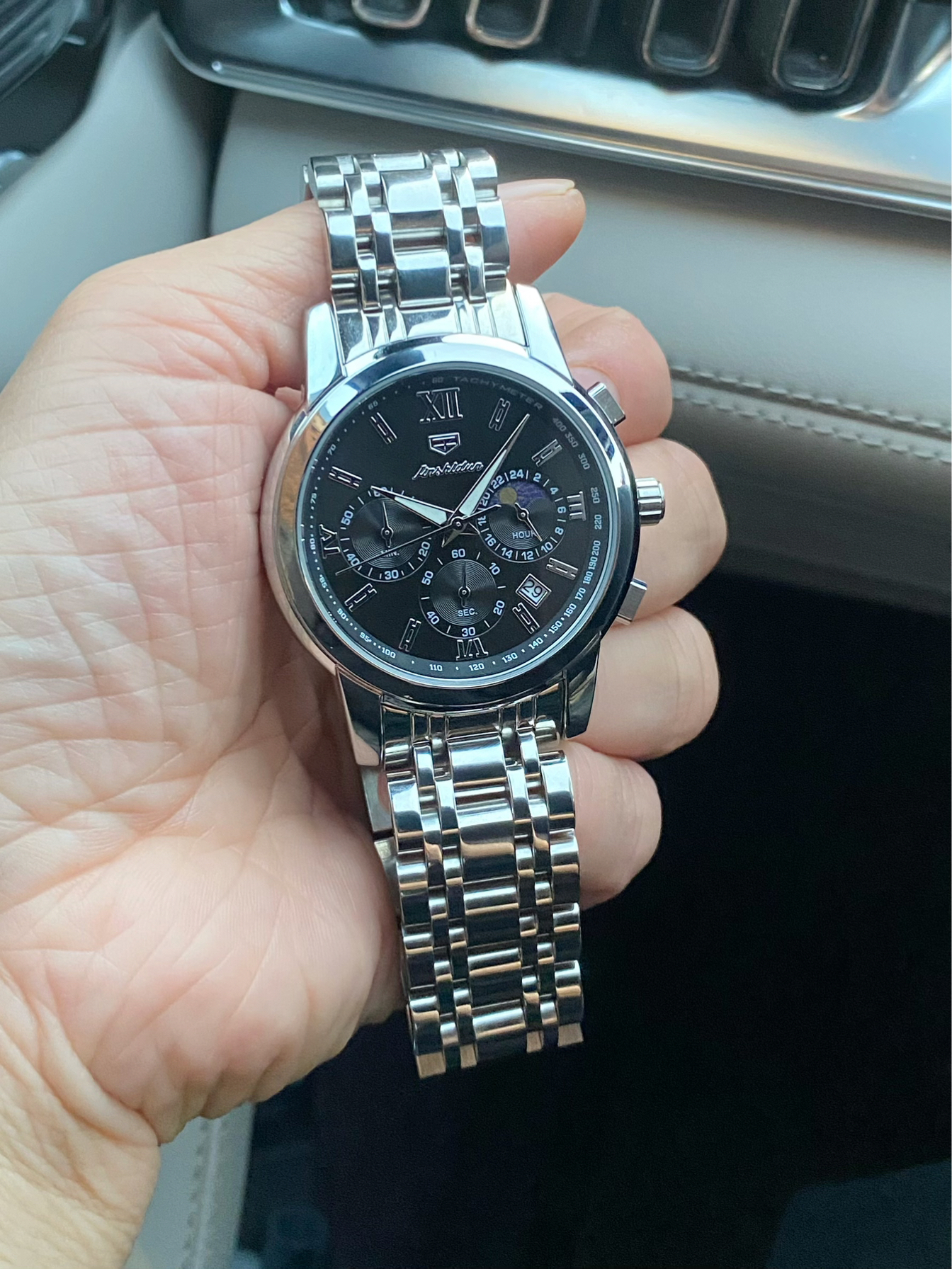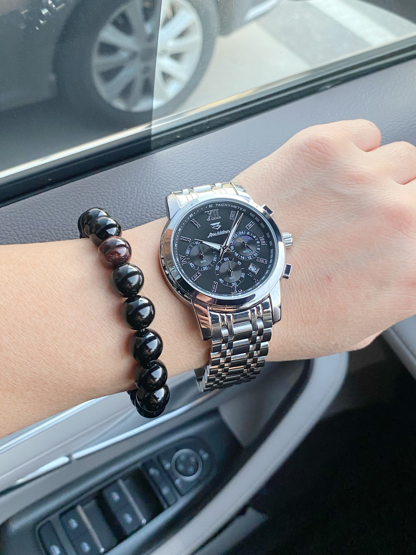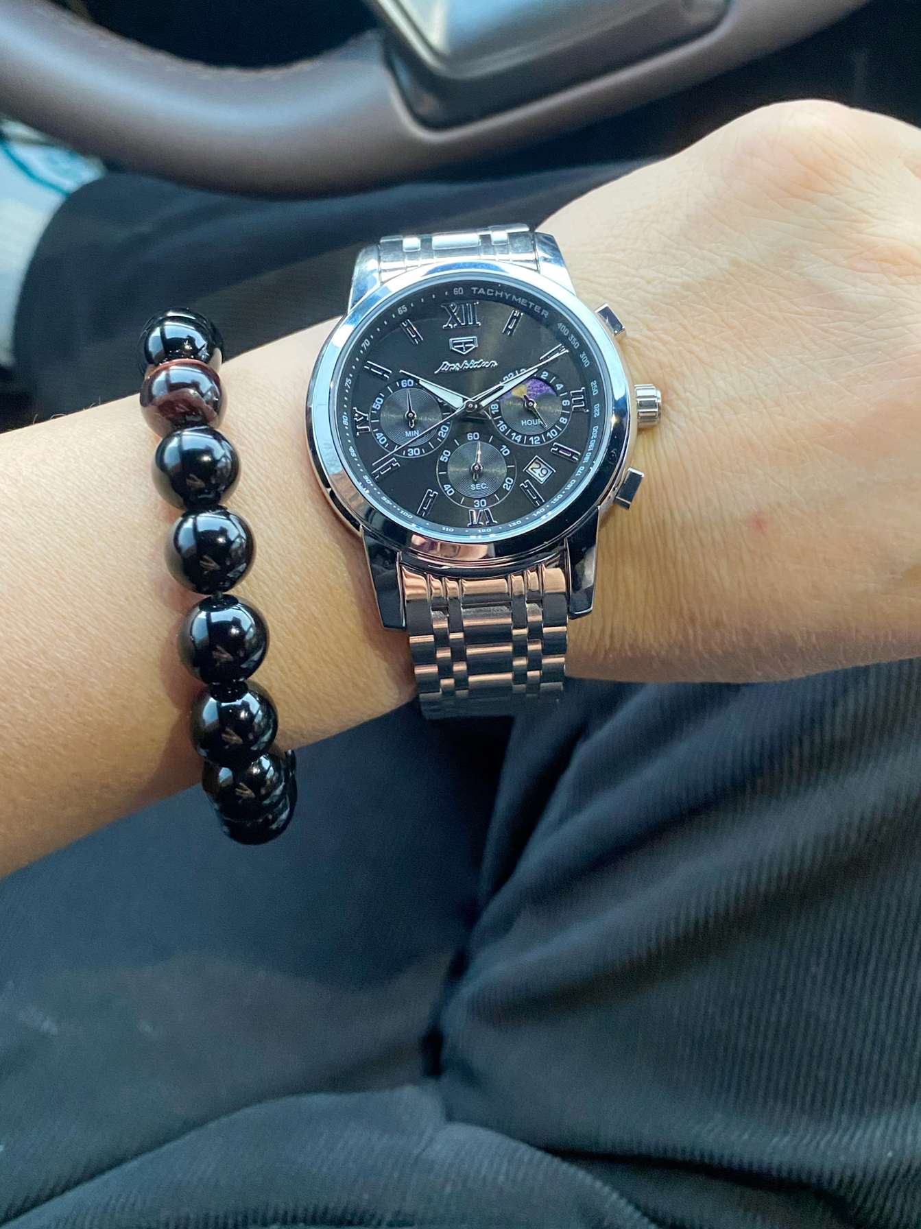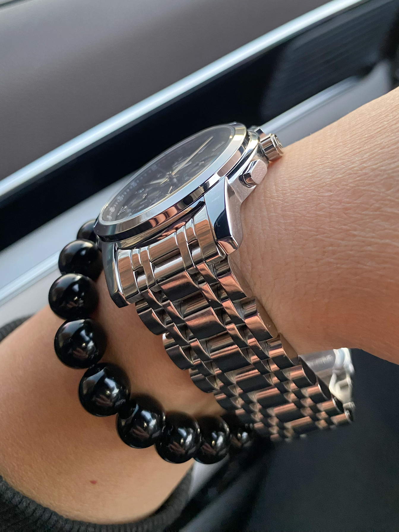 这搭配太绝了!银钢带手表黑盘配罗马刻度,加上月相、计时功能,科技感和精致感都拉满;旁边黑珠子手链一衬,沉稳又有格调。不管是开车出门还是日常通勤,这腕间组合都贼有范儿,低调中透着高级!