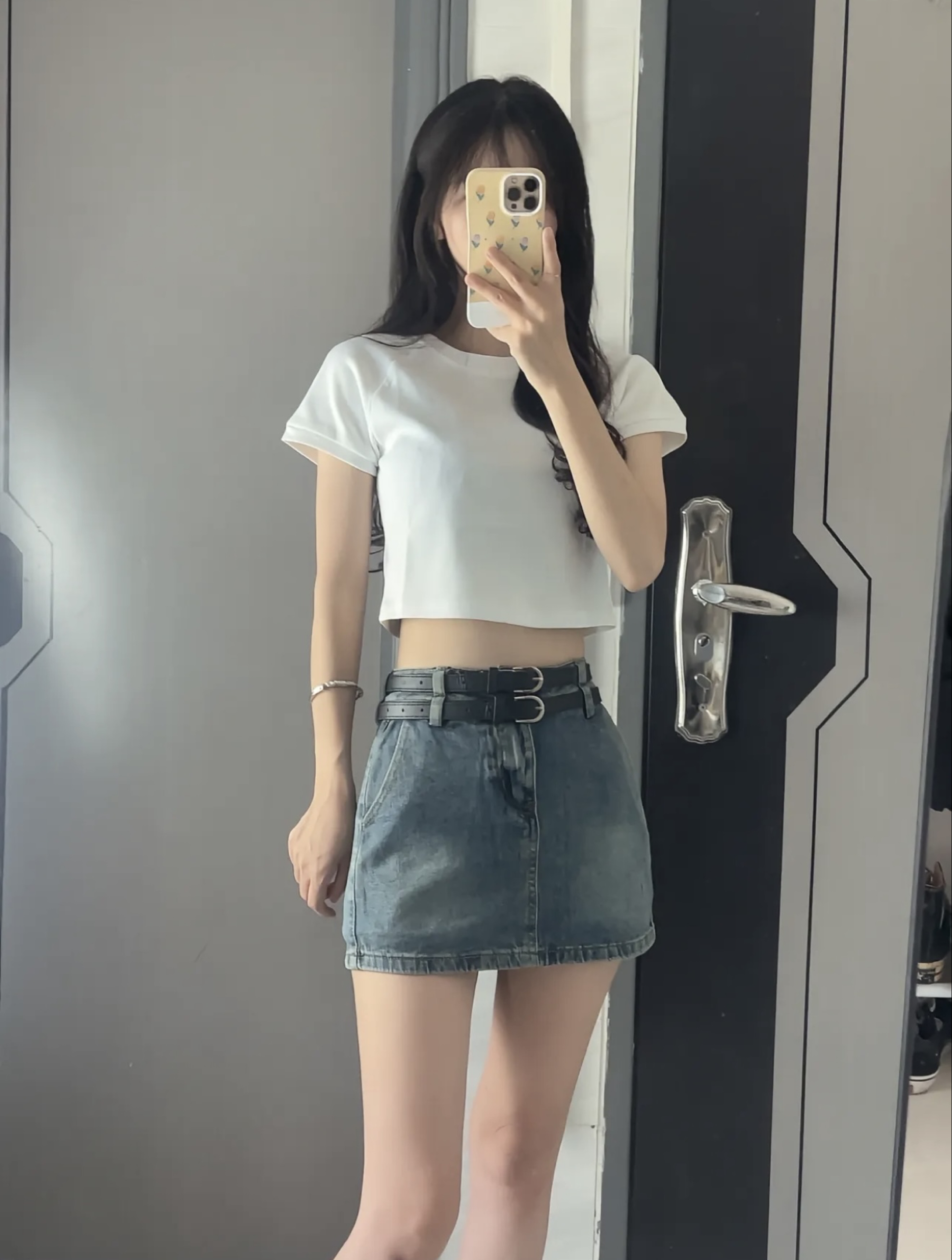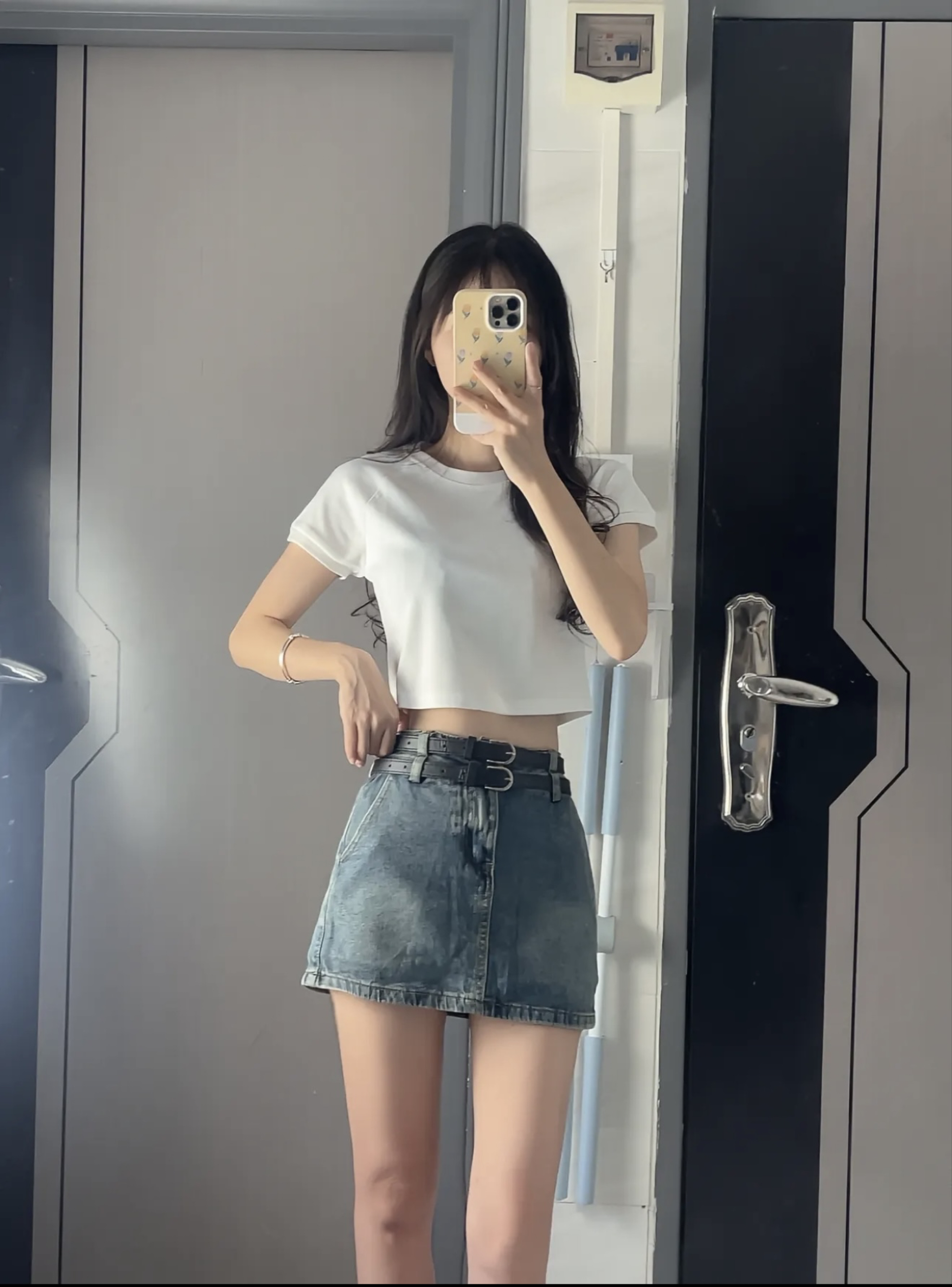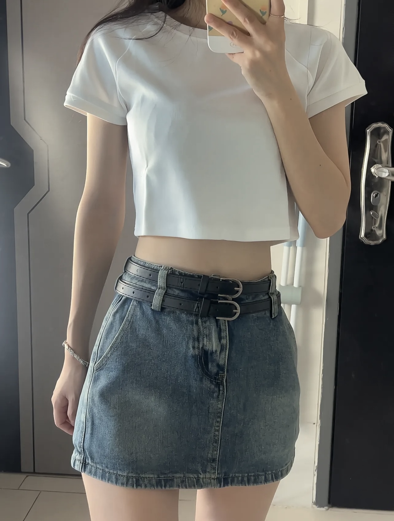 “今天是把‘舒服’焊在身上的一天—— 基础款短白T是夏天的万能钥匙,软乎乎的面料裹着松弛感,露腰的小设计刚好勾出腰线,不用刻意凹造型也能有轻熟的小女人味;做旧水洗的牛仔短裙是自带故事感的‘老伙计’,磨白纹理藏着随性的复古调,配条宽版黑皮带直接把比例拉满,甜酷感刚好卡在不费力的分寸里。
