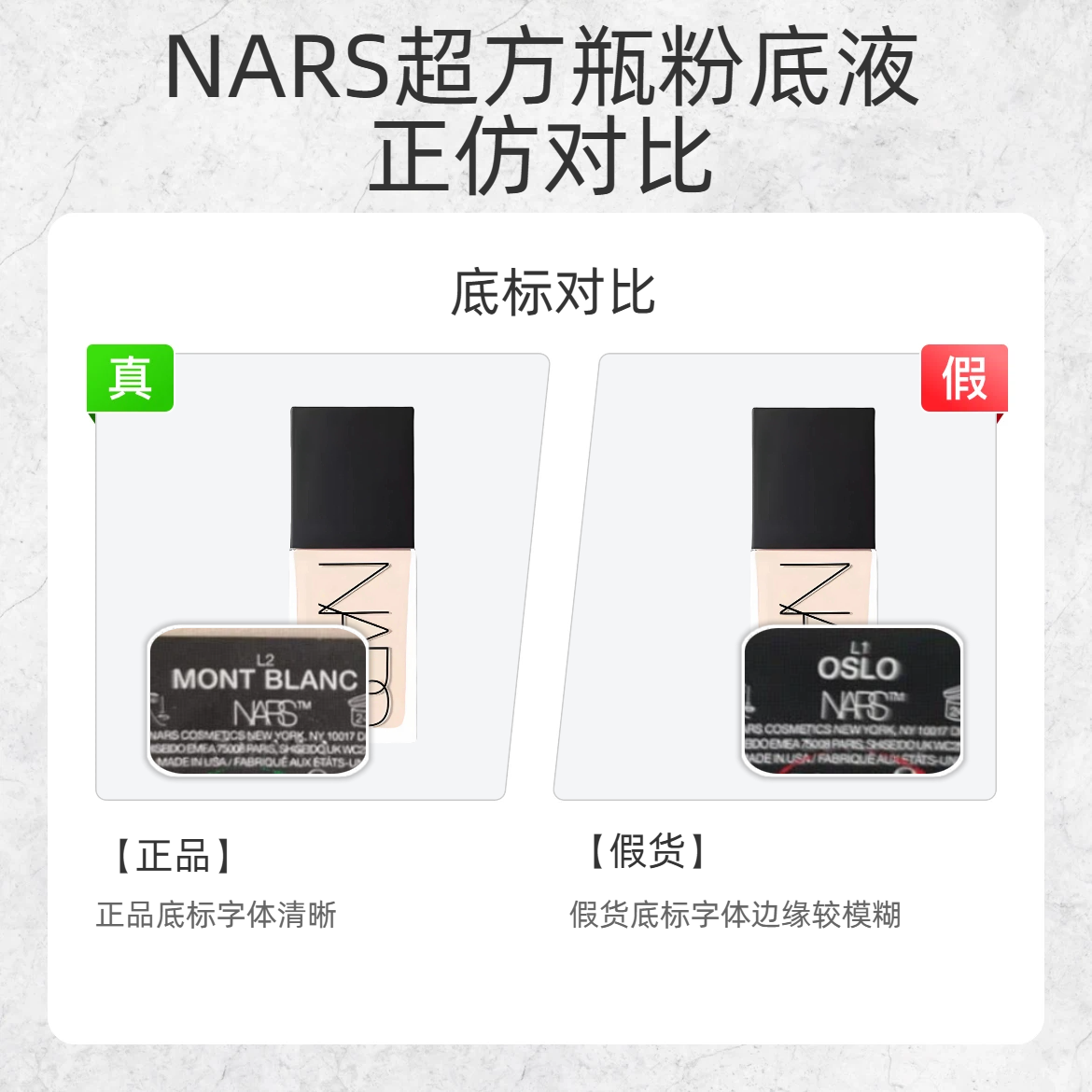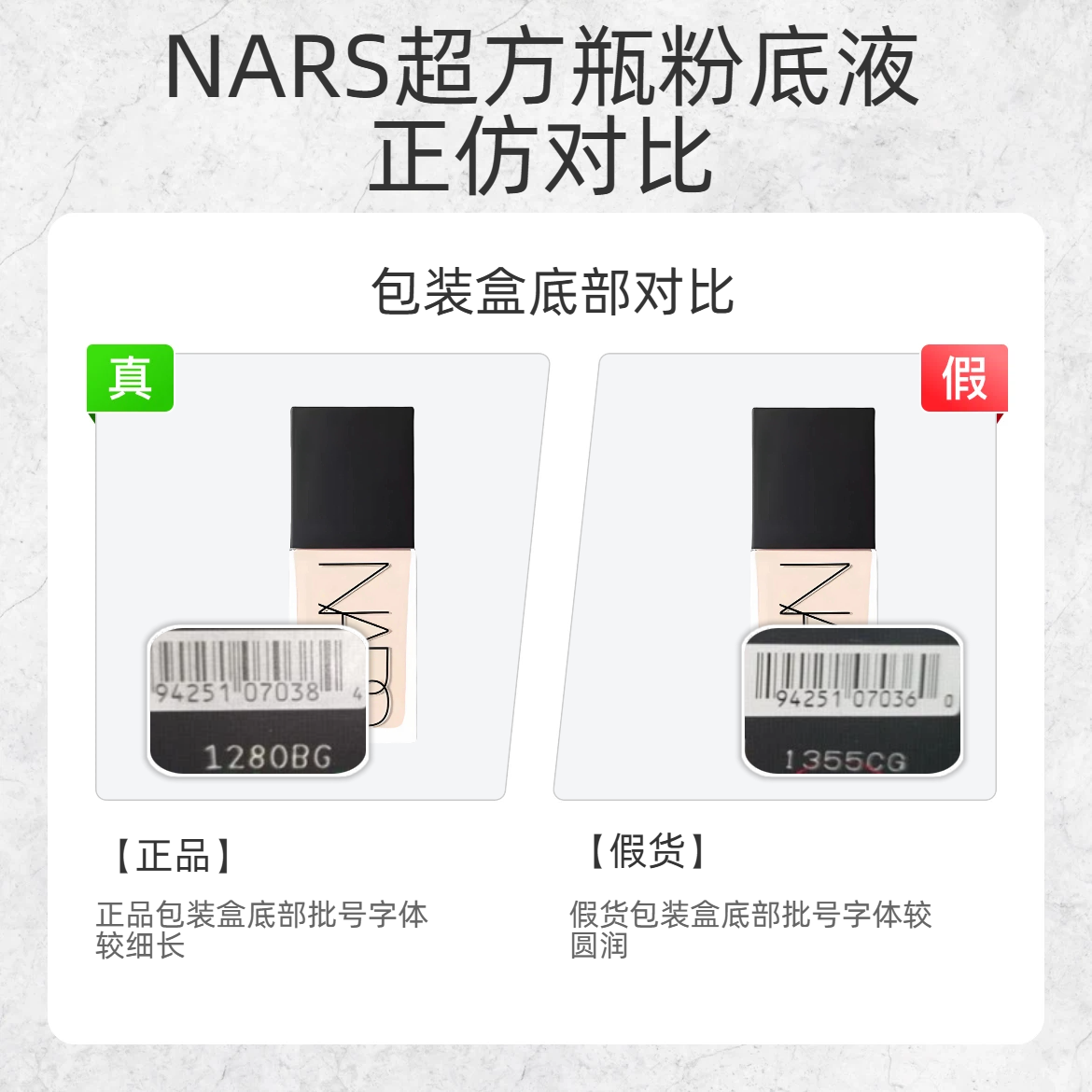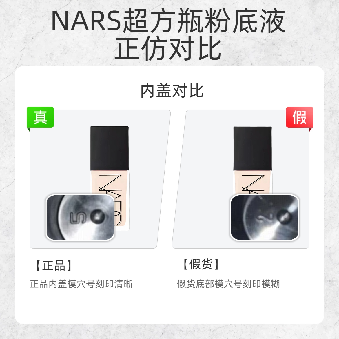 混油本命粉底液也逃不过假货?! 今天扒 NARS 超方瓶的 3 处造假重灾区,看完直接拿捏真假👇 1️⃣ 内盖 ✅ 正品:内盖的模具号刻印清晰 ❌ 假货:底部模具号印得糊糊的 2️⃣ 底标 ✅ 正品:底标字体清晰锐利,每个字母都很规整 ❌ 假货:字体边缘发虚,整体看起来雾蒙蒙的 3️⃣ 包装盒底部批号 ✅ 正品:批号字体偏细长 ❌ 假货:字体圆润膨胀 超方瓶的持妆 + 遮瑕真的是混油...
