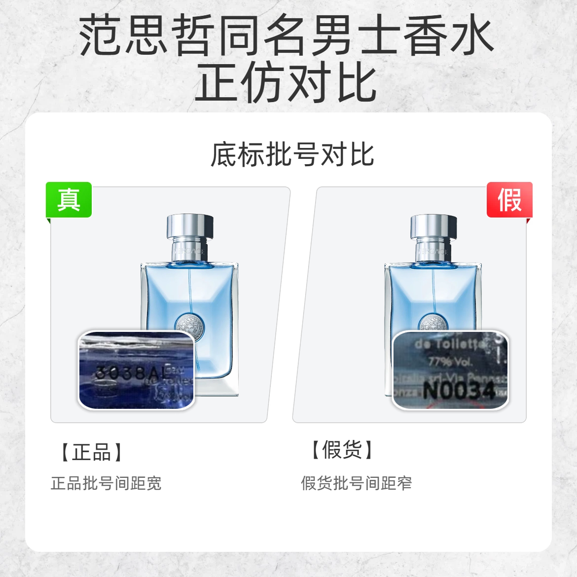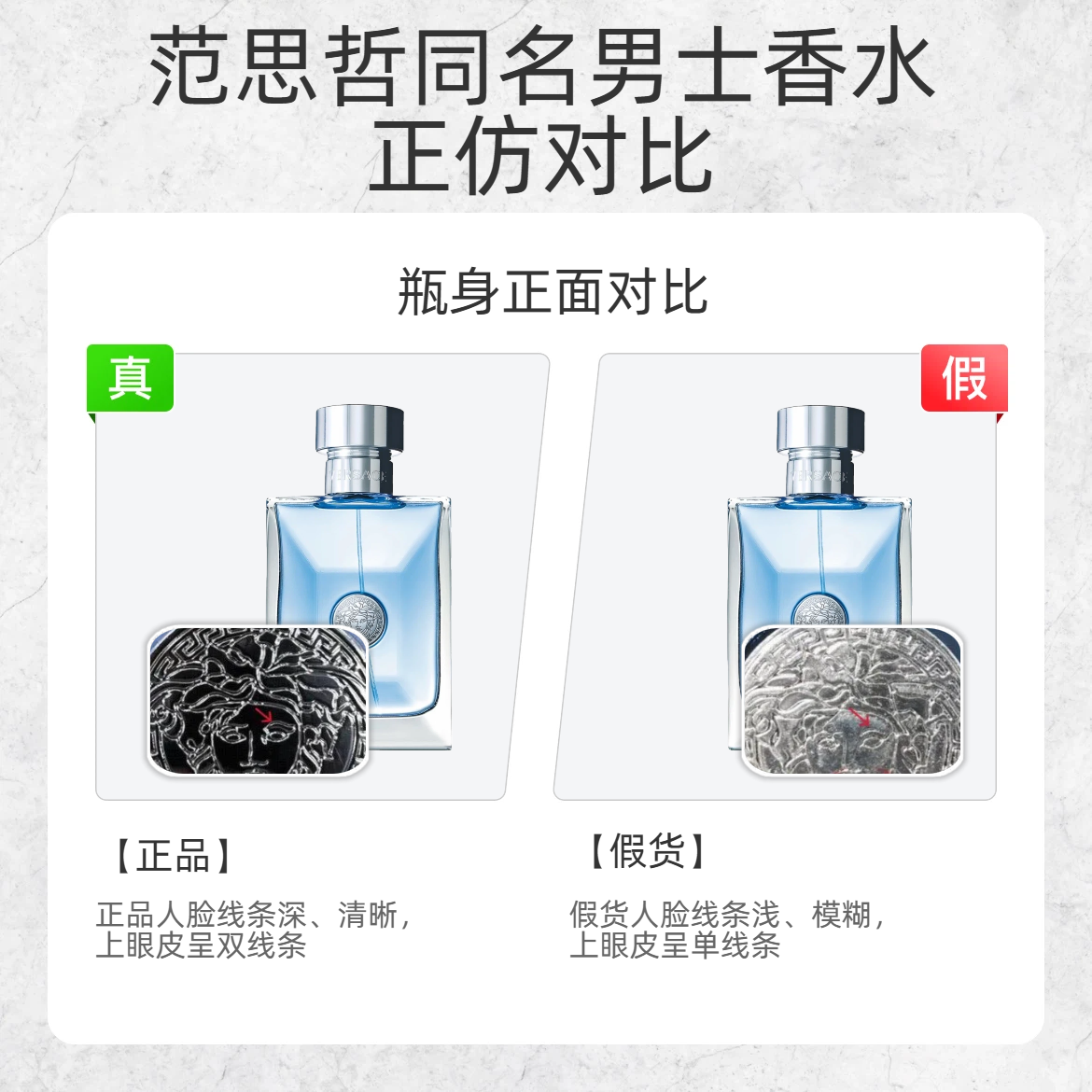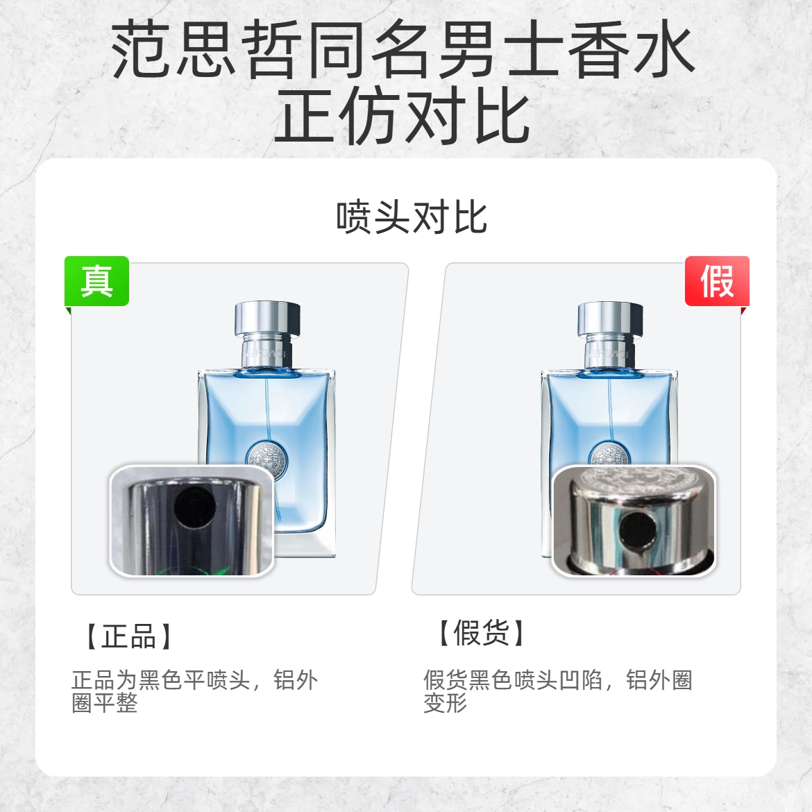 谁懂啊!花大几百买的香水居然是假的?!今天手把手教你辨范思哲同名男香的真假,这 3 处细节直接戳穿假货👇 1️⃣ 瓶身美杜莎标 ✅ 正品:人脸线条深邃清晰,上眼皮是双线条,雕刻感很强 ❌ 假货:线条浅且模糊,上眼皮只有单线条,质感廉价 2️⃣ 喷头细节 ✅ 正品:黑色喷头是平整的,铝外圈光滑无变形 ❌ 假货:喷头凹陷,铝外圈歪歪扭扭,做工粗糙 3️⃣ 底标批号 ✅ 正品:批号数字间距宽,印刷...