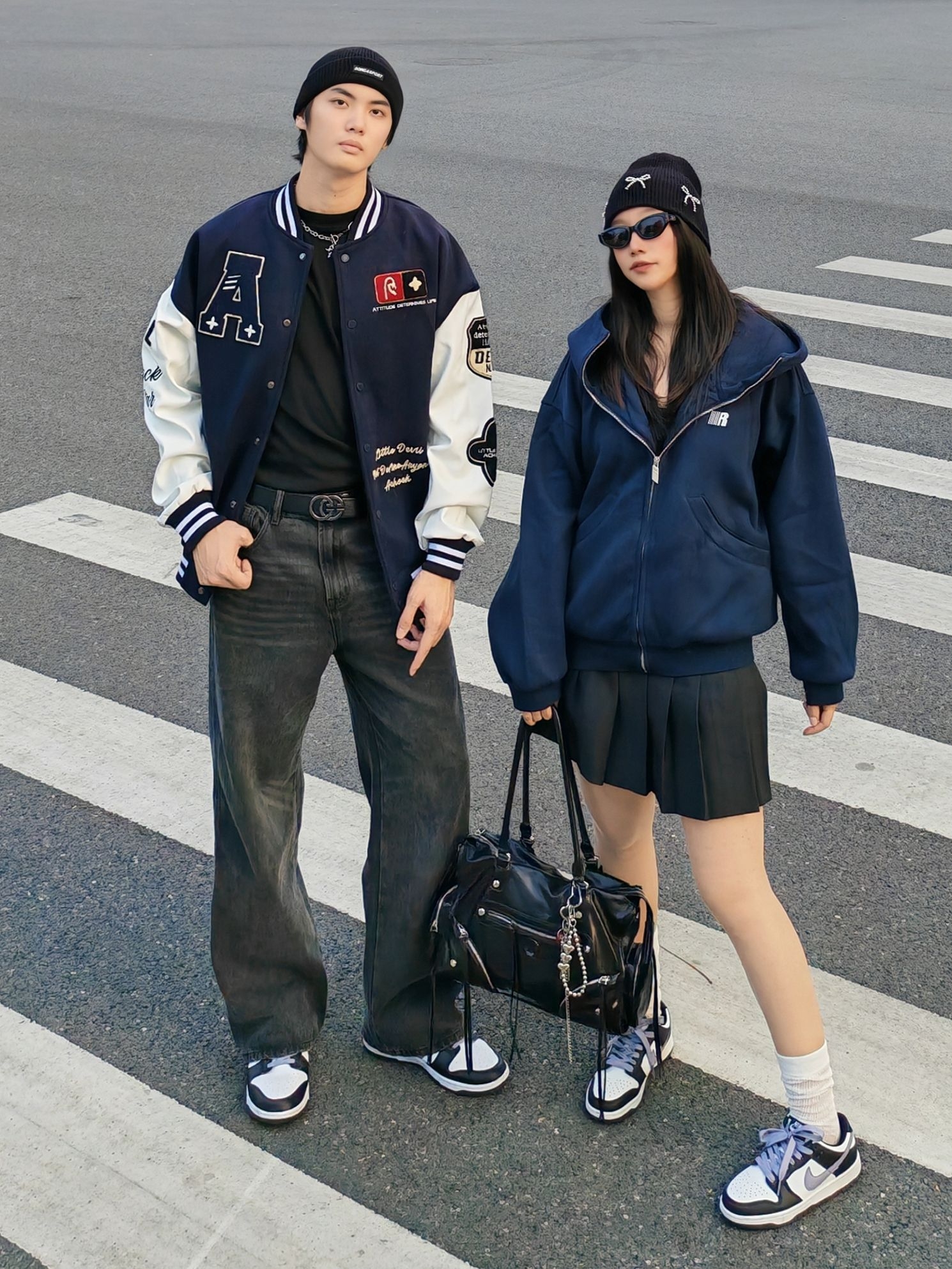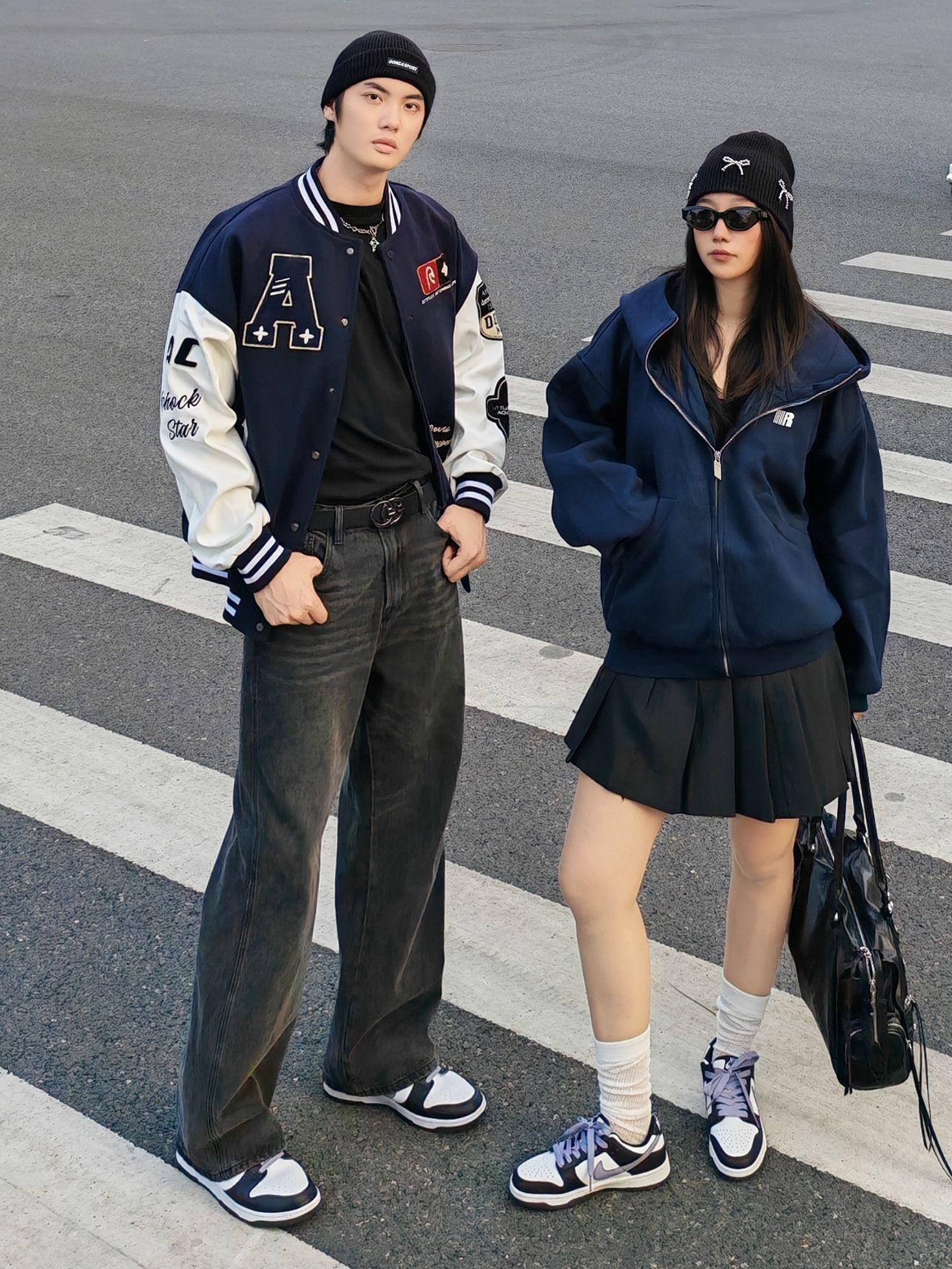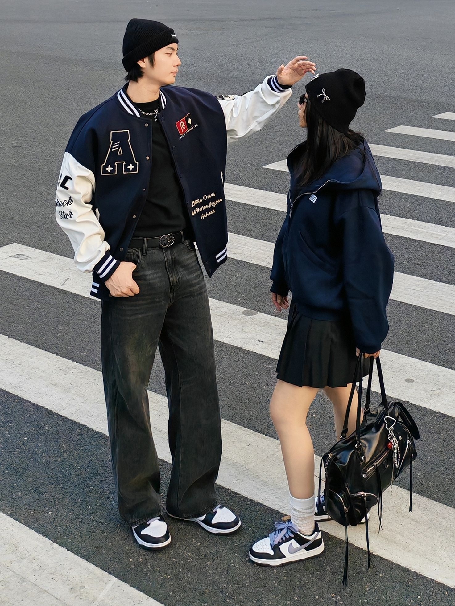 hello呀~ 这里是镭子的情侣穿搭分享 女友新送的金属扣皮带,刚好配我的棒球服+黑牛,美式复古感拉满; 女友穿同色系藏蓝连帽外套+百褶裙,球鞋细节和我呼应~ 藏蓝+黑的低饱和配色,甜酷和痞帅刚好搭。