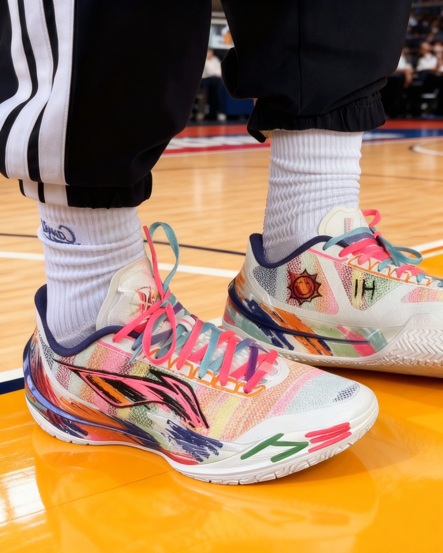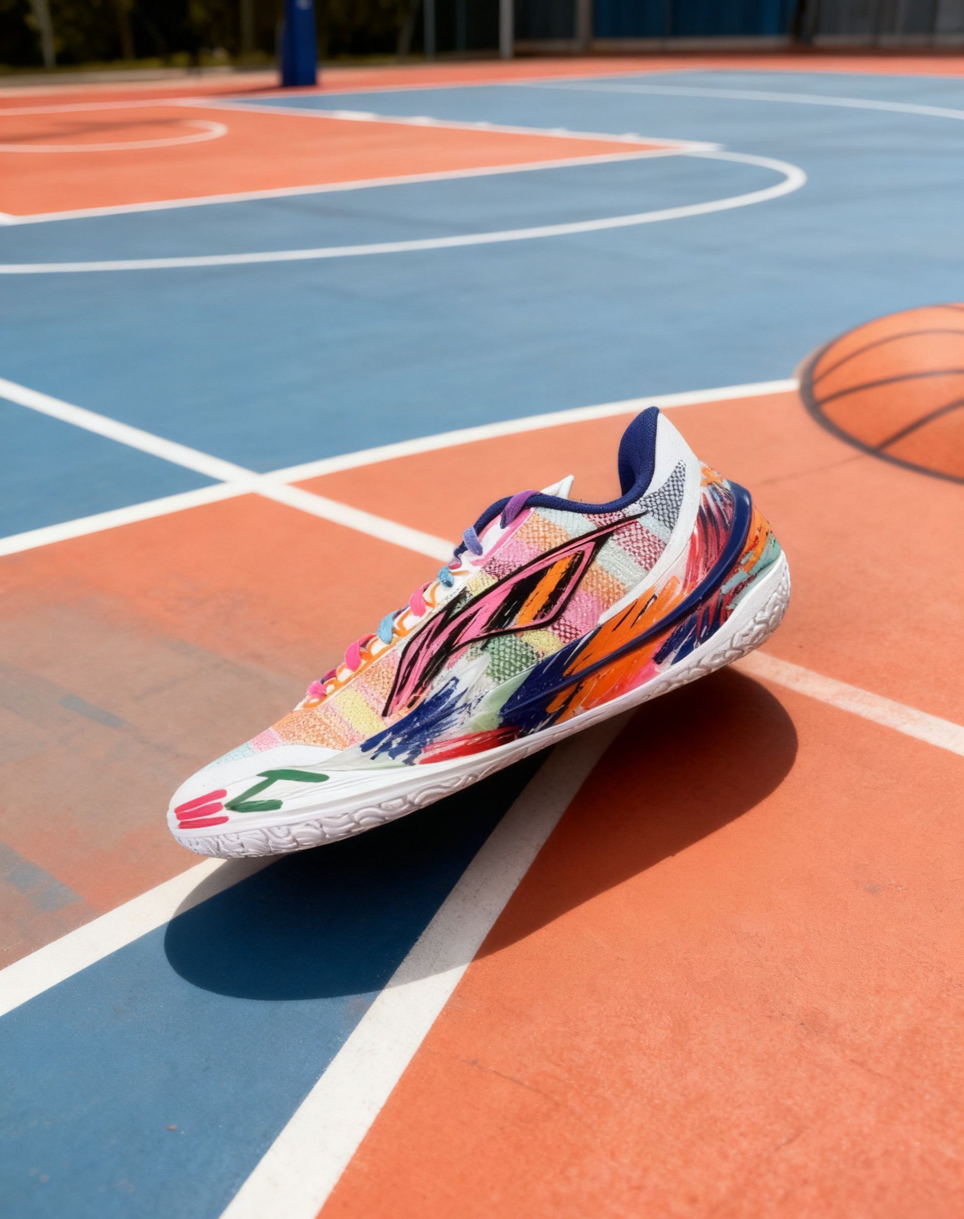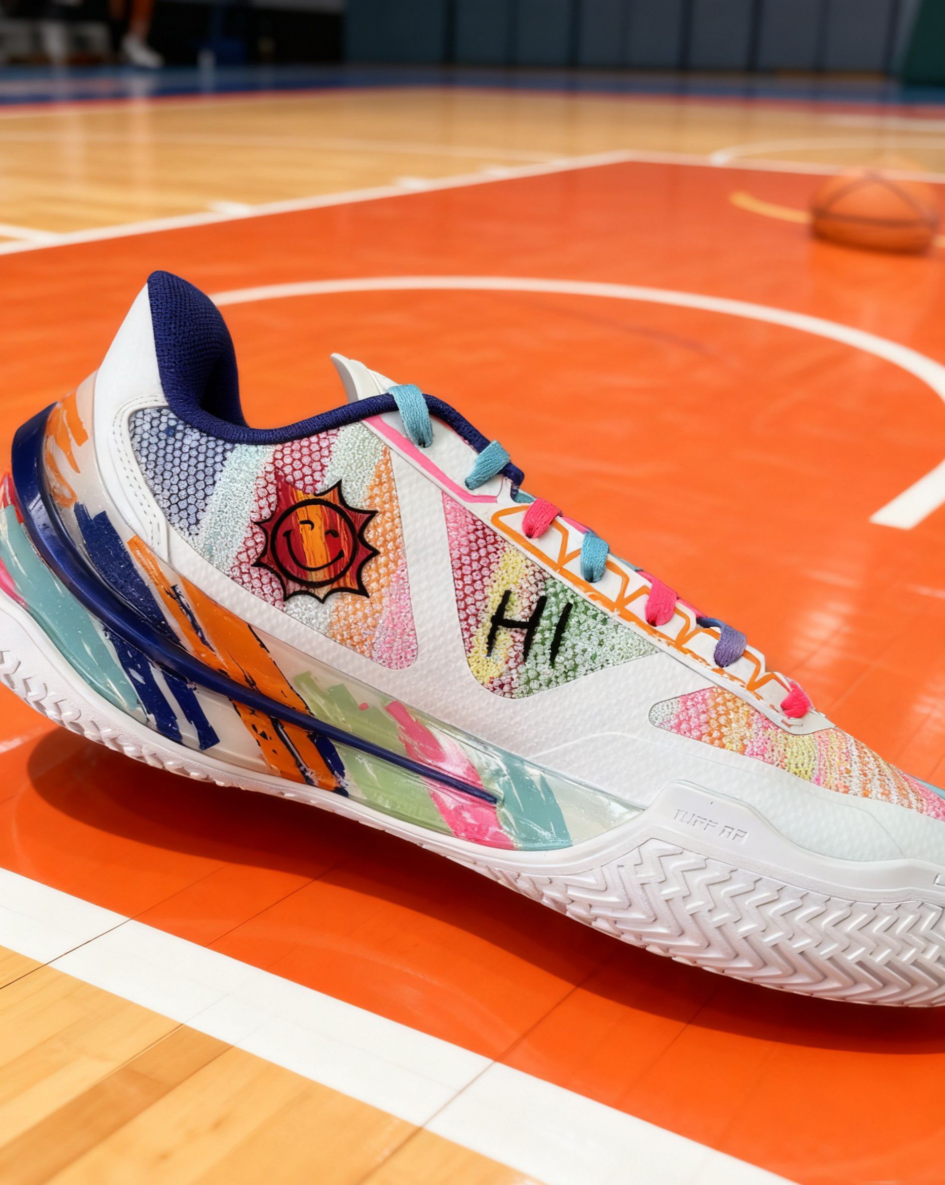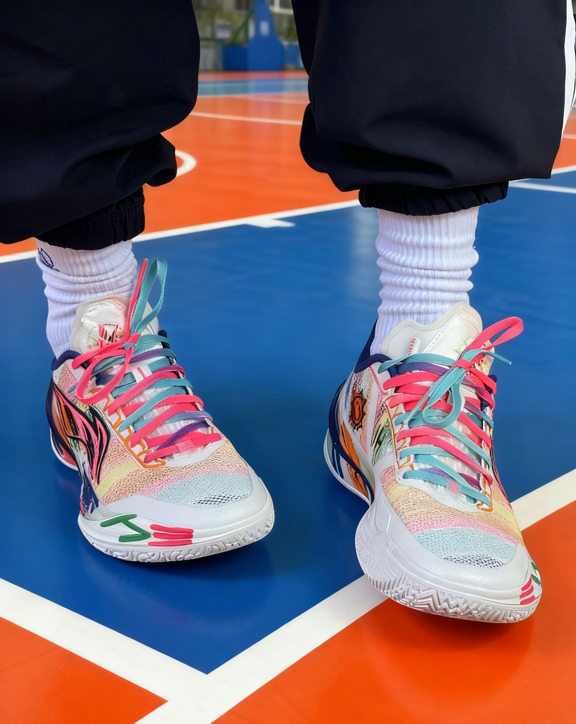 这双「内向艺术家」配色是利刃5V2的“颜值天花板款”——彩虹泼墨涂鸦+撞色鞋带,把“调色盘穿在脚上”,出街回头率拉满,球场自带焦点属性。 全掌䨻科技+8字型Pebax抗扭片,前掌韧弹启动快,后掌缓震适配90kg内体重,落地不震腿。 80kg内突破型后卫/锋线、追求“颜值+实战”的学生党,外场高频使用者。