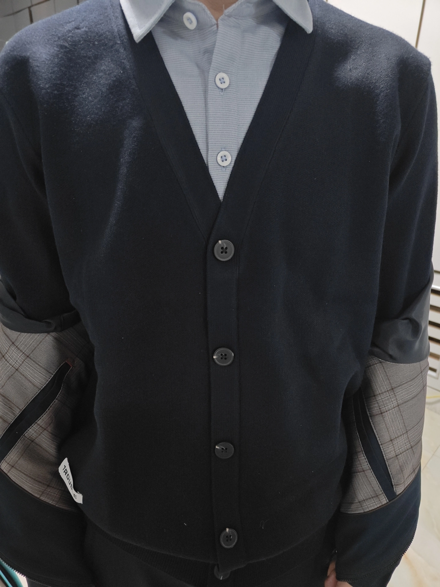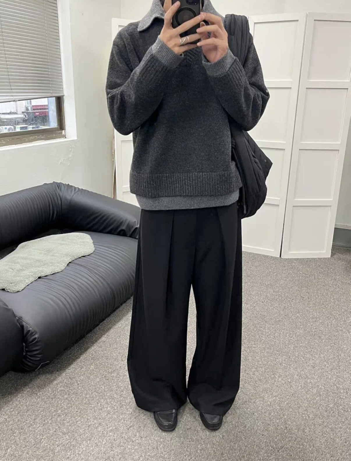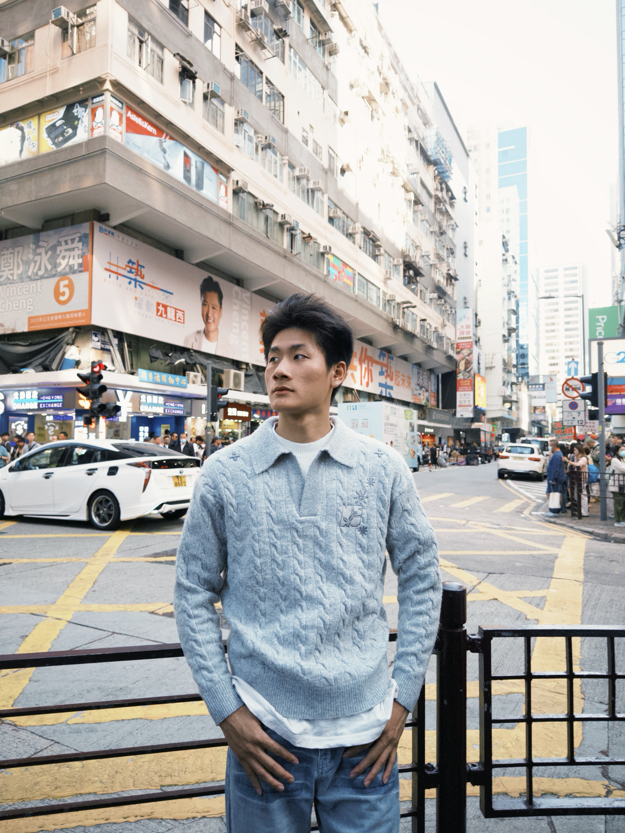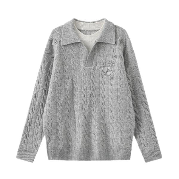 “香港街巷的松弛感,这件假两件针织衫直接焊在身上👇 • 设计细节:浅灰雪花纹理+翻领假两件,不用真叠穿就有层次,钉珠刺绣藏着精致感,往街景里一站和霓虹招牌超搭 • 穿着体验:宽松慵懒版型裹着舒服,现在这温度穿不闷汗,抬手、走动都不卡身 • 搭配思路:配浅蓝阔腿牛子裤,适配街头松弛感,简单搭就有复古调 你们觉得这件针织衫搭配深色裤子会不会更有氛围感?来评论区聊聊~”