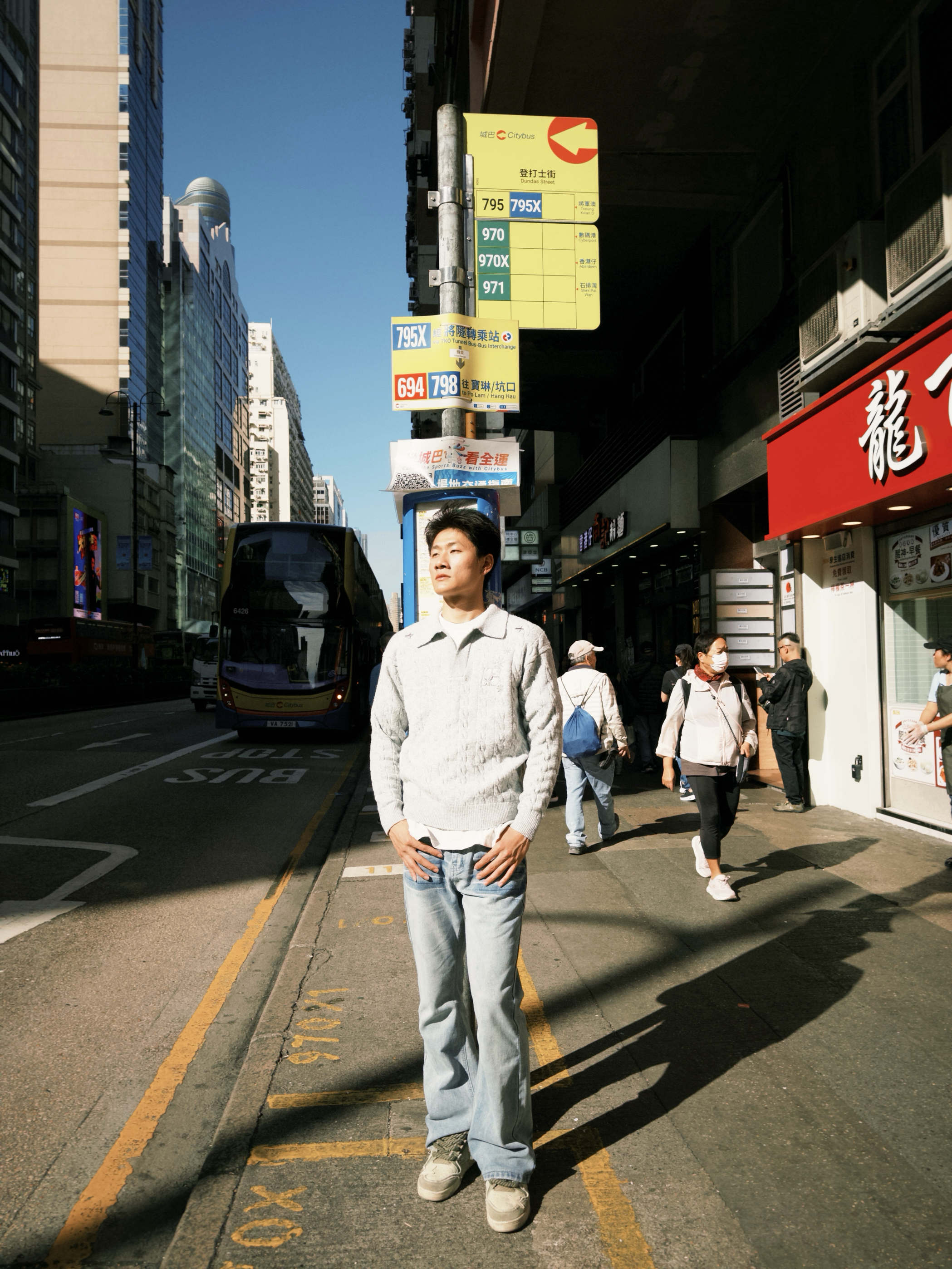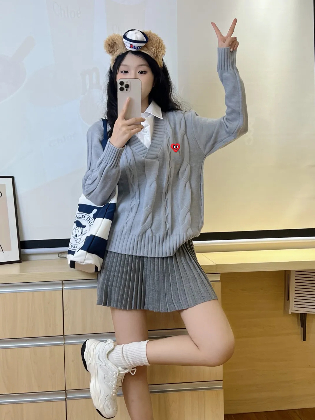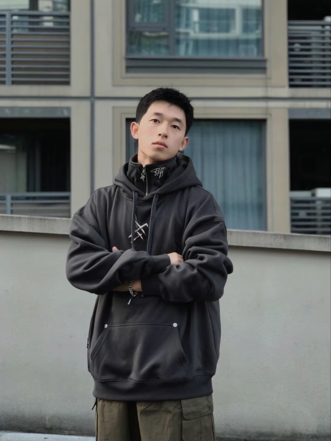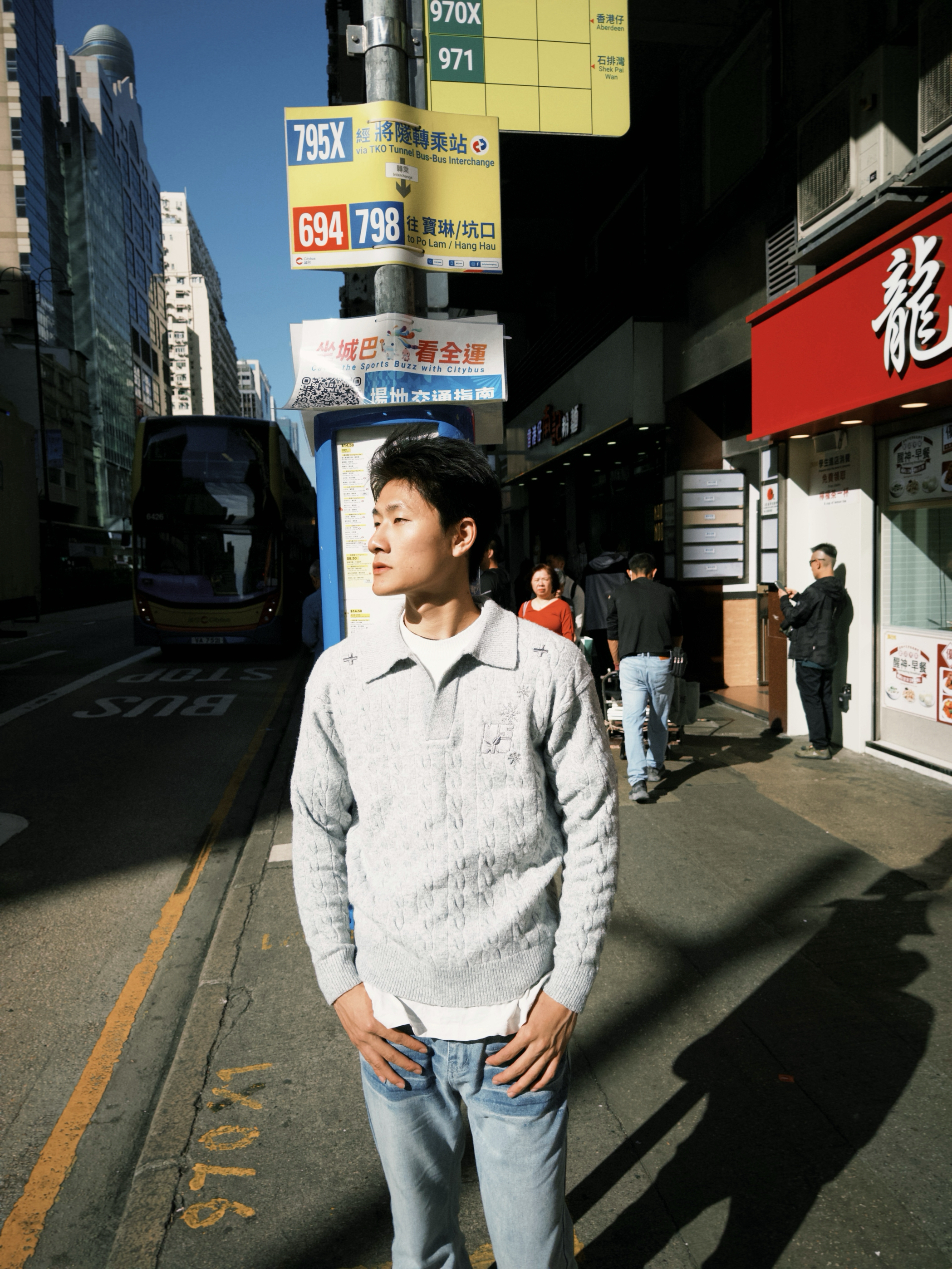 “香港街巷的松弛感,这件假两件针织衫直接焊在身上👇 • 设计细节:浅灰雪花纹理+翻领假两件,不用真叠穿就有层次,钉珠刺绣藏着精致感,往街景里一站和霓虹招牌超搭 • 穿着体验:宽松慵懒版型裹着舒服,现在这温度穿不闷汗,抬手、走动都不卡身 • 搭配思路:配浅蓝阔腿牛子裤,适配街头松弛感,简单搭就有复古调 你们觉得这件针织衫搭配深色裤子会不会更有氛围感?来评论区聊聊~”