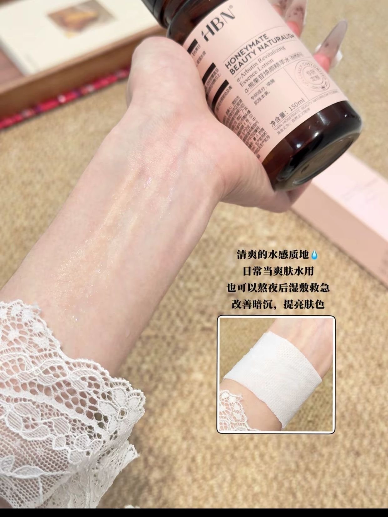天天熬夜赶工,结果脸蛋是又黄又暗 痘印还特别明显 素颜出门都没自信😭 还好用了HBN发光水,皮肤才稳住 水感精华质地,上脸拍拍就吸收 我每周还会湿敷个2次,每次七八分钟 补水去黄效果很棒 坚持用了一阵 皮肤自带透亮感,摸着也软糯