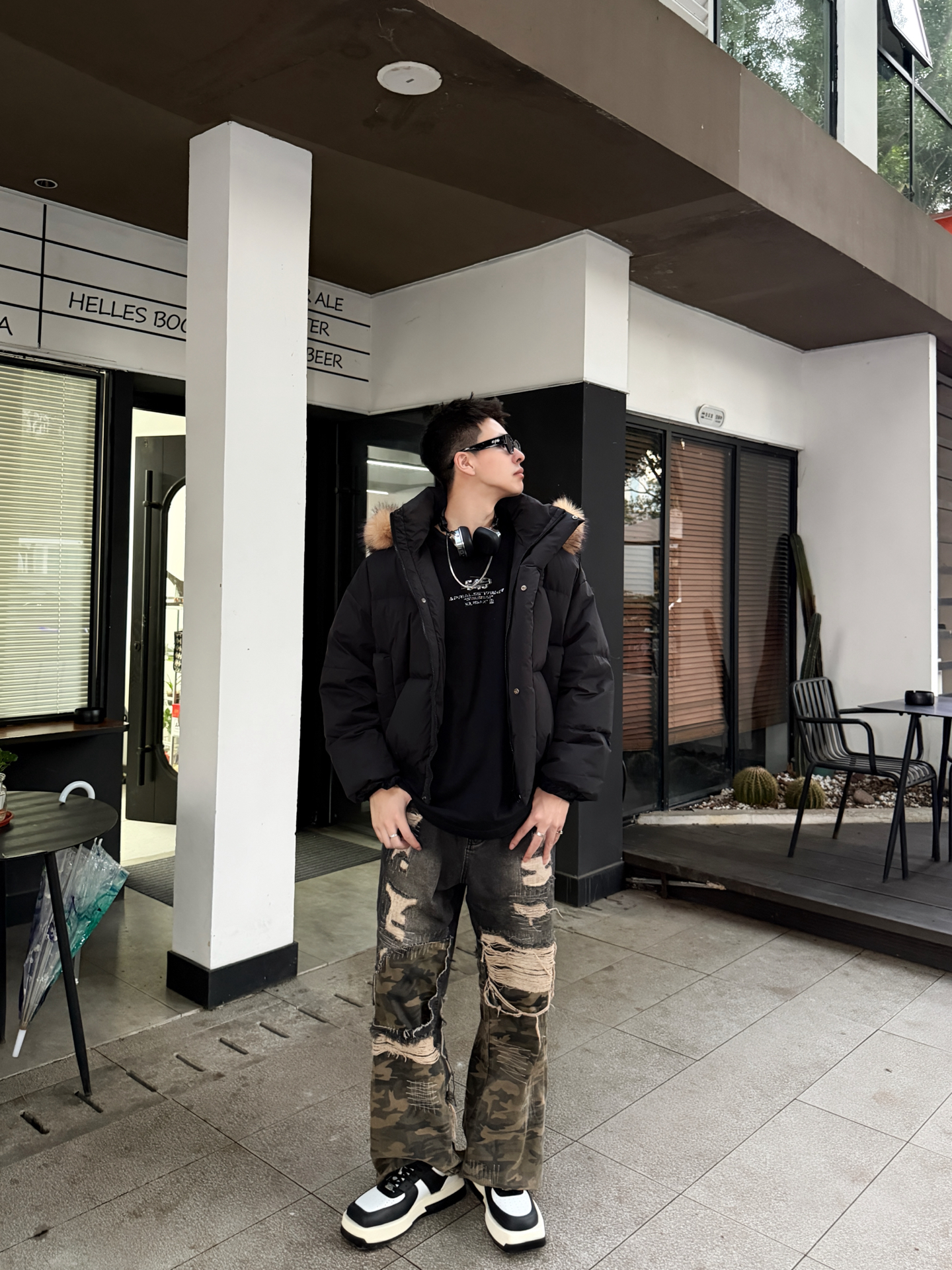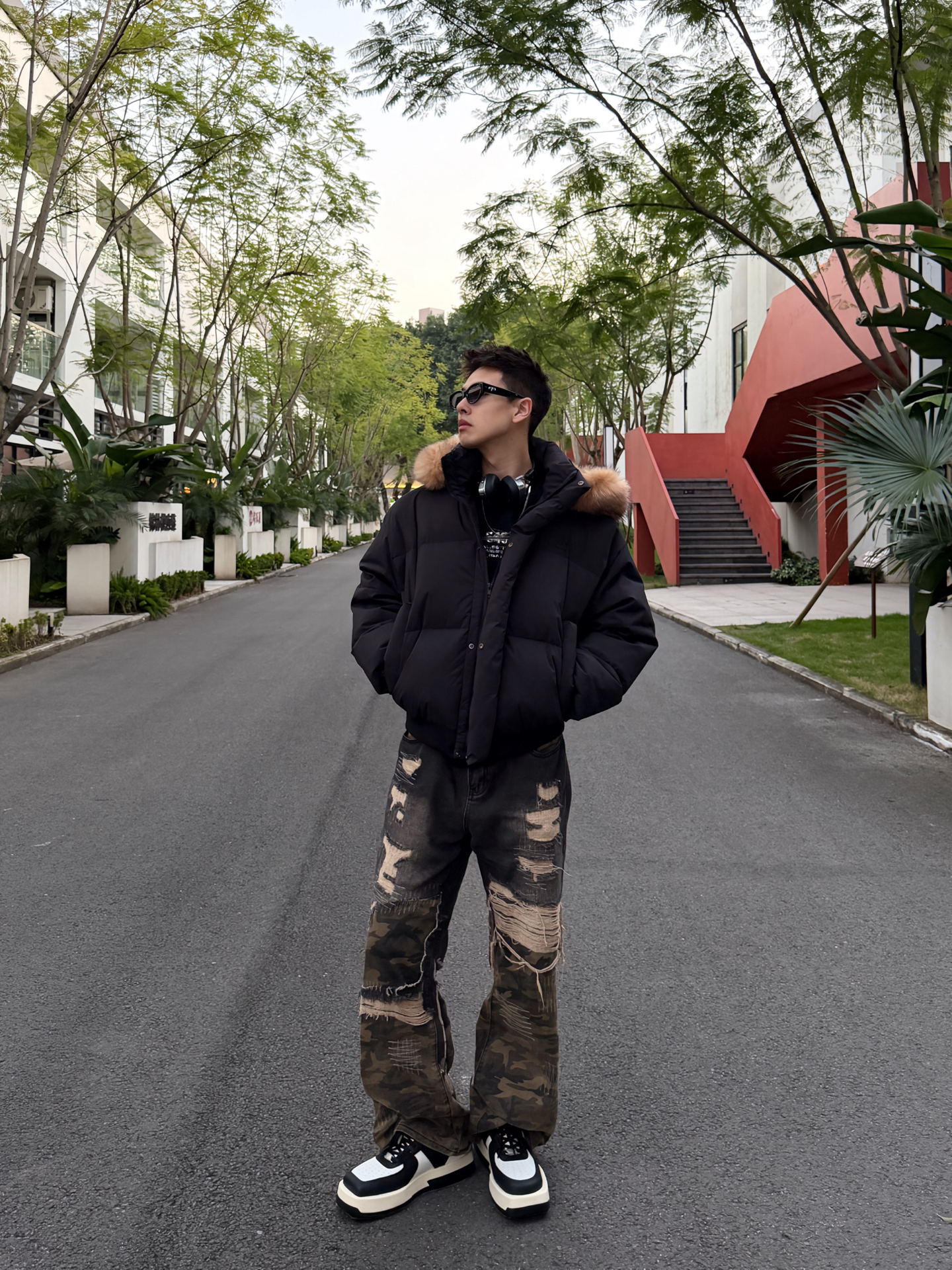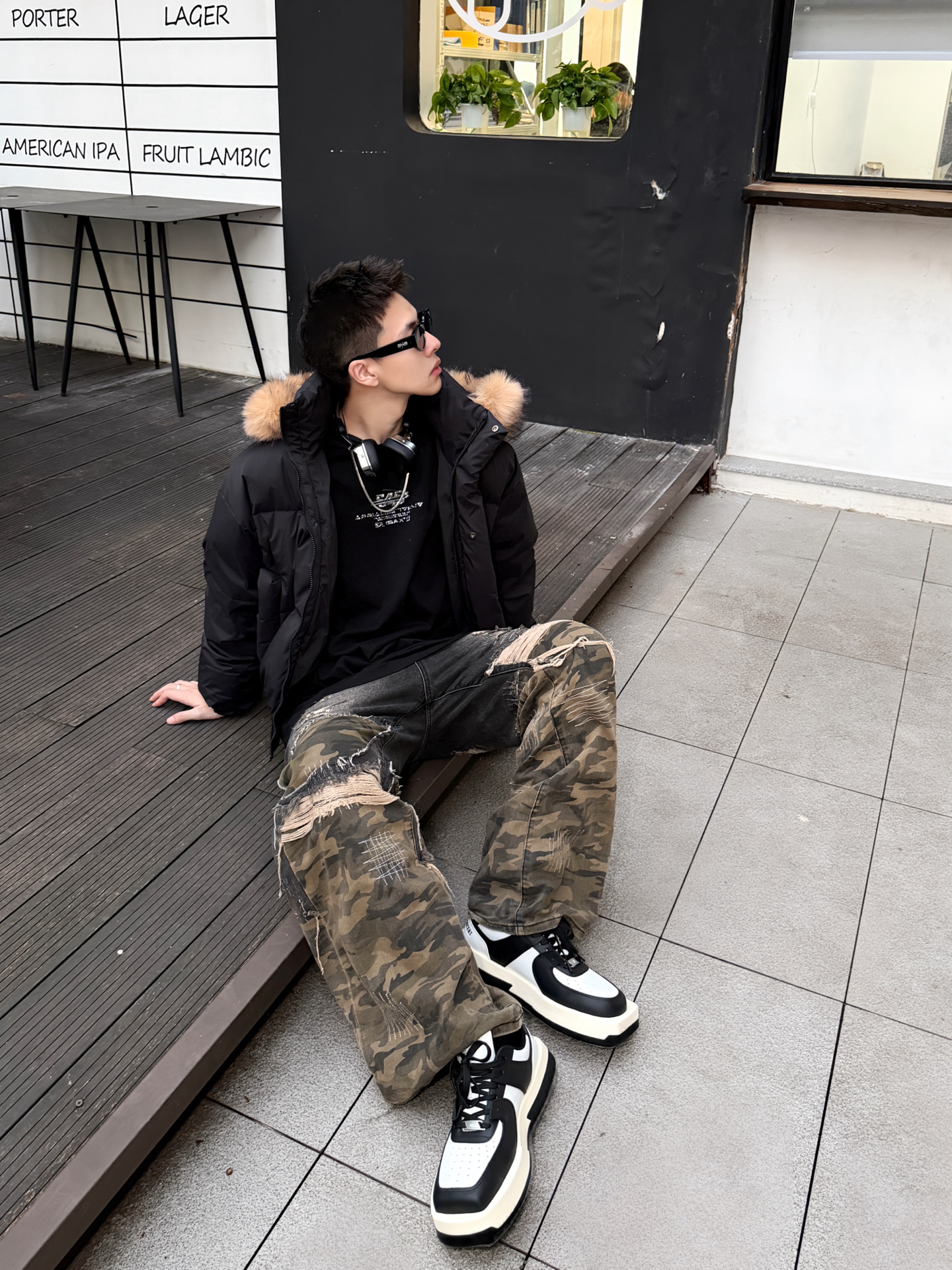 黑羽绒服+迷彩裤,这“美式街头感”直接炸场了 谁能拒绝 #A chock 这件黑羽绒服的反差感啊—— 90白鸭绒超级保暖,毛领一戴直接把街头痞帅感拉满;搭一条做旧迷彩裤,破洞细节戳中复古潮点,踩双 #CHOCO CONCERT 黑白厚底鞋,往城市街角一站,随性又自带“生人勿近”的酷感。 秋冬想穿得暖还能炸街,这波直接把公式焊死! #一起穿ACHOCK #过冬保命服 #穿ACHOCK过冬天...