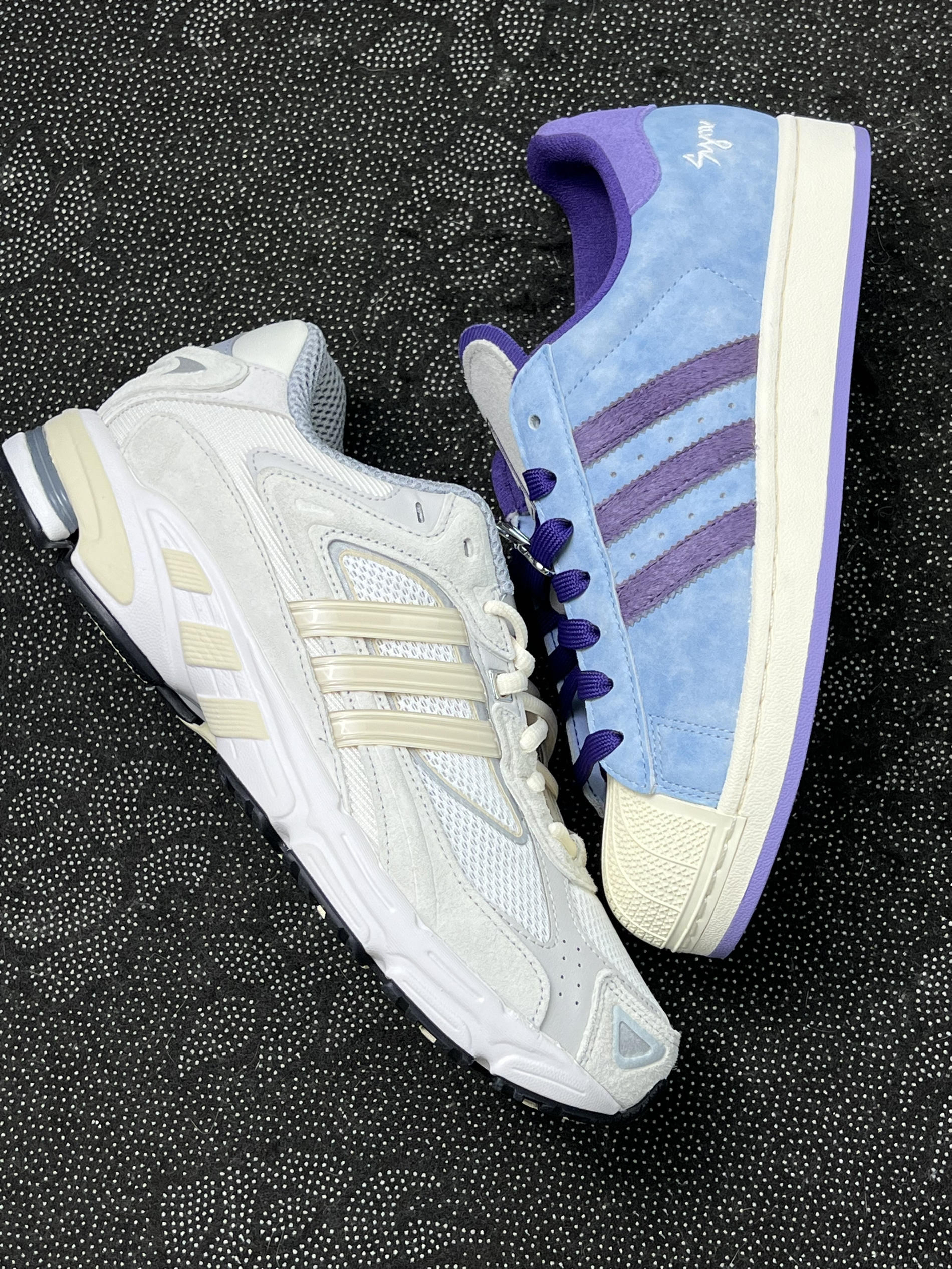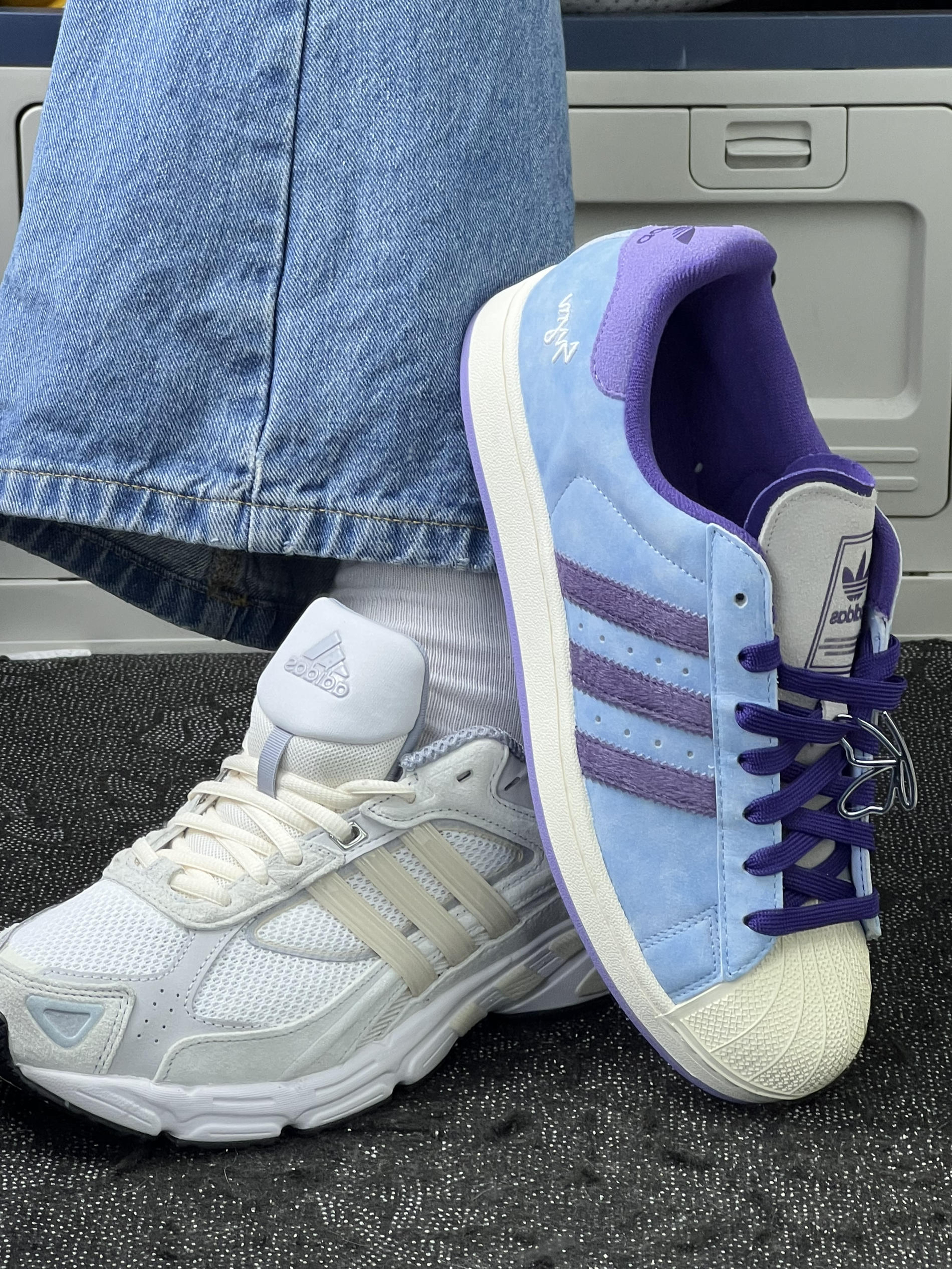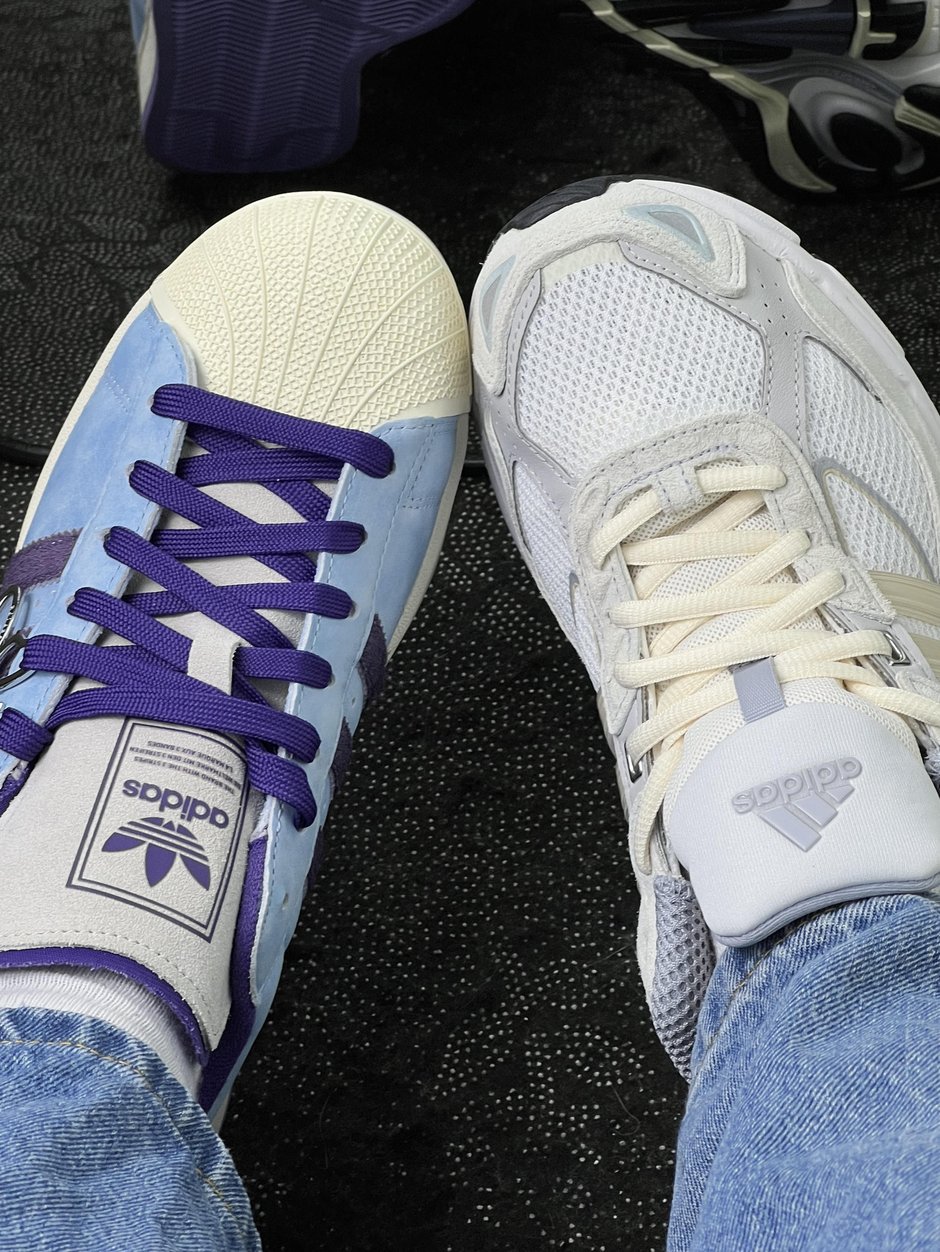 左边这双蓝紫Superstar,实物颜色比图片还清淡,是那种灰调的浅蓝,配紫色条纹和米白贝壳头,春夏穿确实清爽✨ 但绒面革和帆布拼接的鞋头,打理起来有点麻烦,在黑色波点地毯上拍照很好看,日常穿就得远离雨天和灰尘😅 贝壳头设计经典,可前掌弯折处还是有点硬,需要几天磨合。 右边这双灰白跑鞋,是真正的“隐形劳模”。网眼材质透气性好,鞋身也轻,通勤穿一天没什么存在感。但它没什么“记忆点”,设计太简...