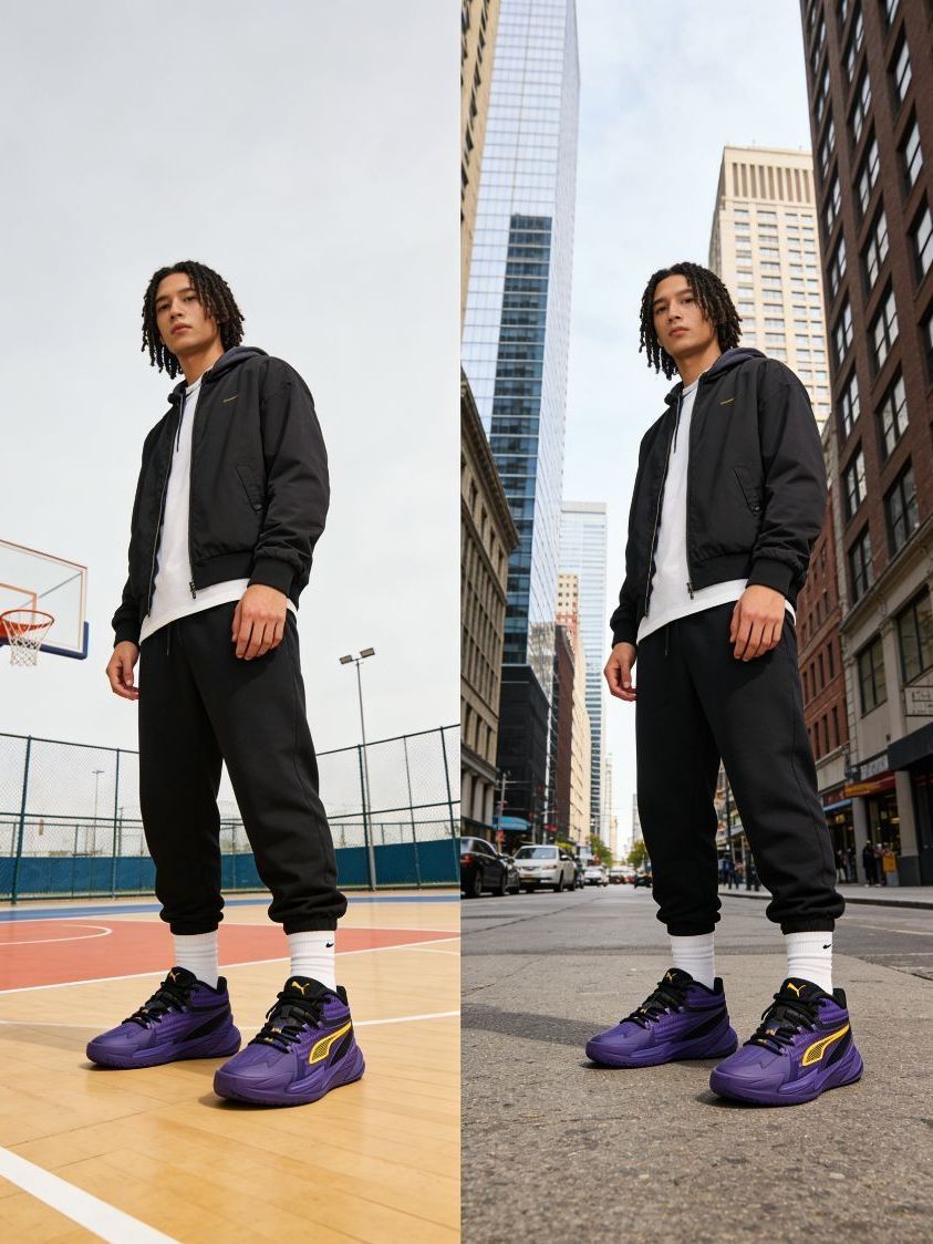 * **搭配牛仔工装裤**:解锁篮球鞋的日常穿搭可能性,硬朗有型。