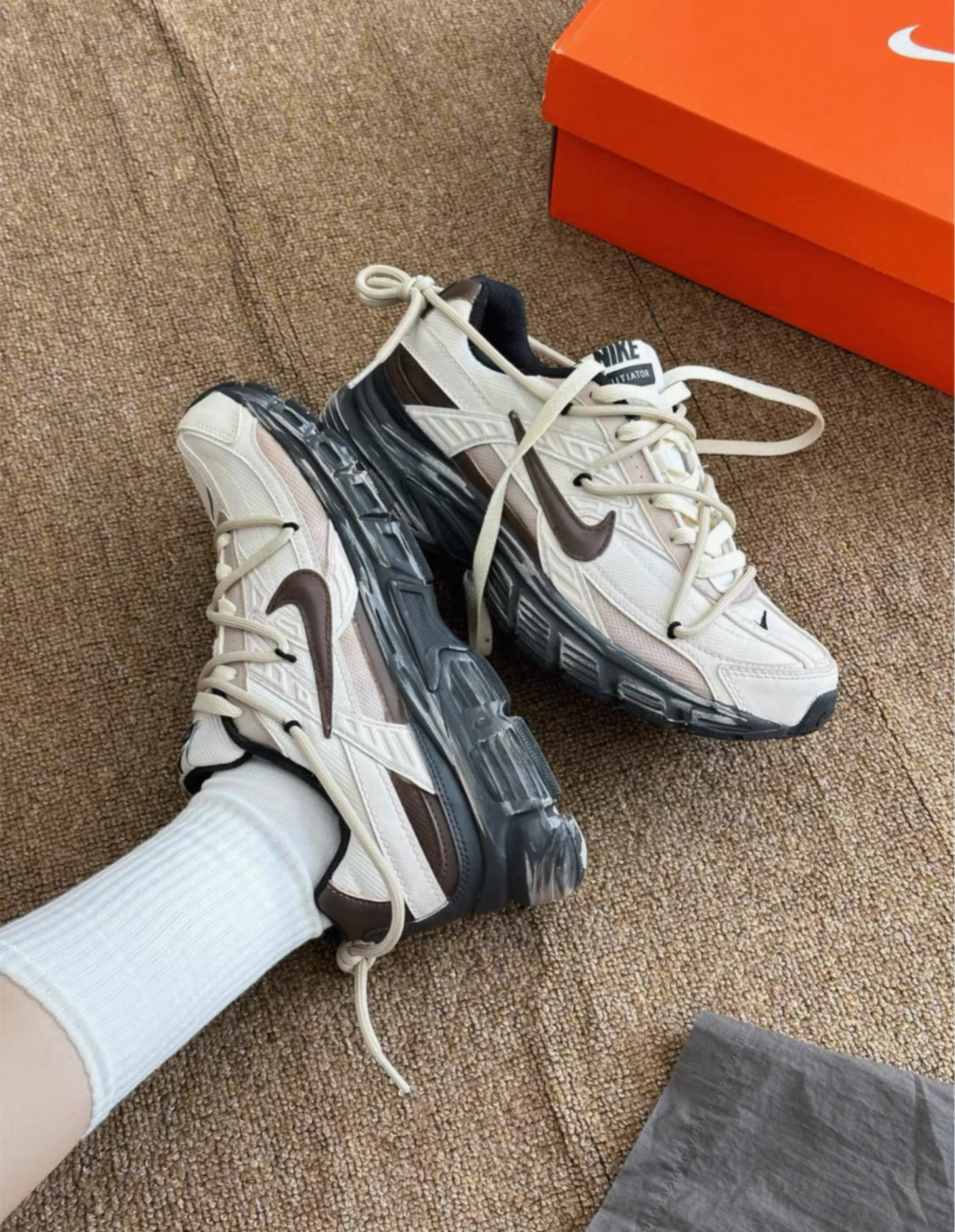 软弹中底踩上去像裹了层云朵,长时间走路也不会累脚,运动通勤都能无缝衔接~ 奶白+棕灰的配色自带高级感,拼接设计又藏着街头潮味,鞋带一松一紧的随性穿搭,随便配袜子或裤装都很出片。既舒服得像踩进软枕,又潮得能直接当穿搭亮点~