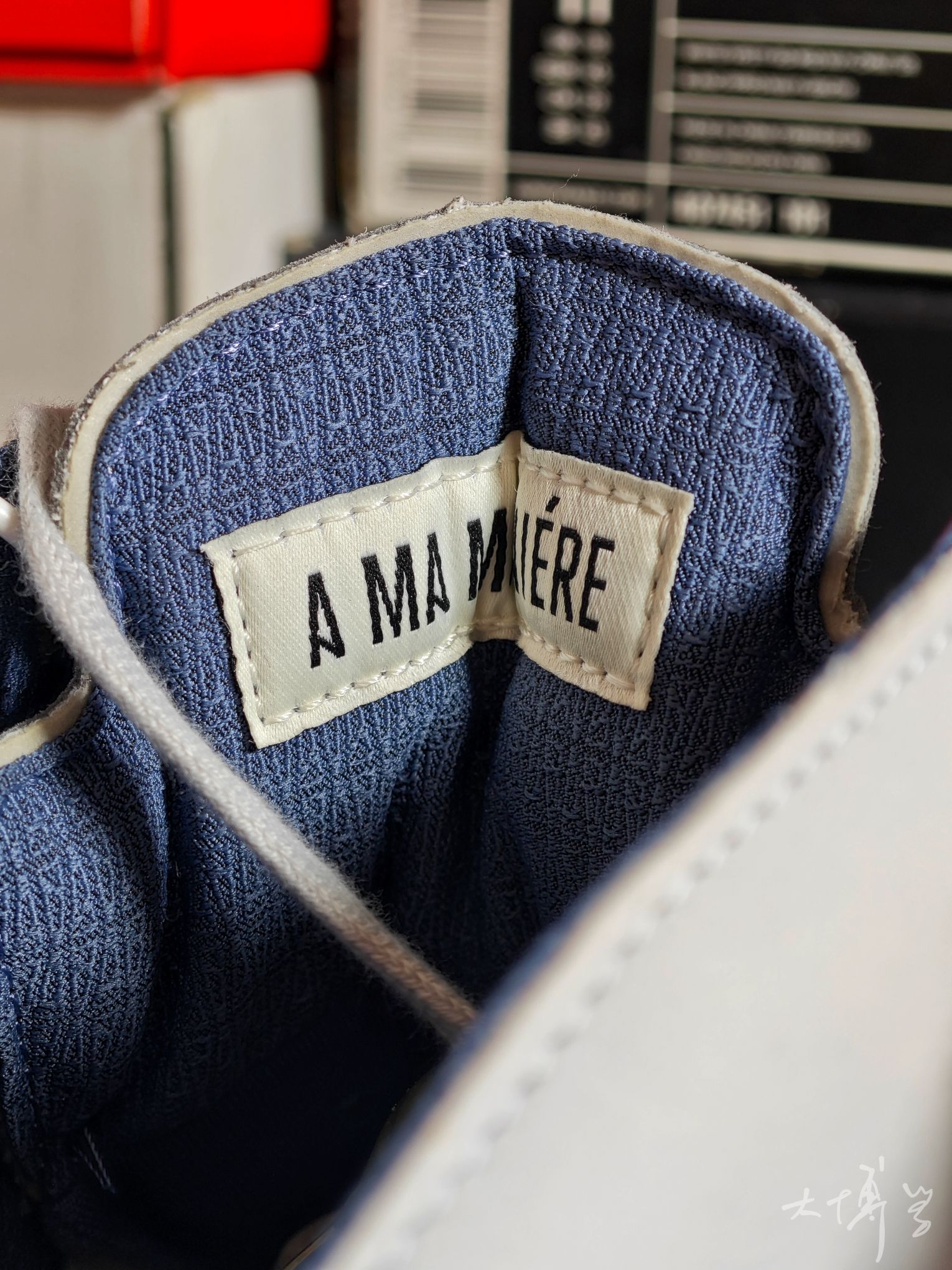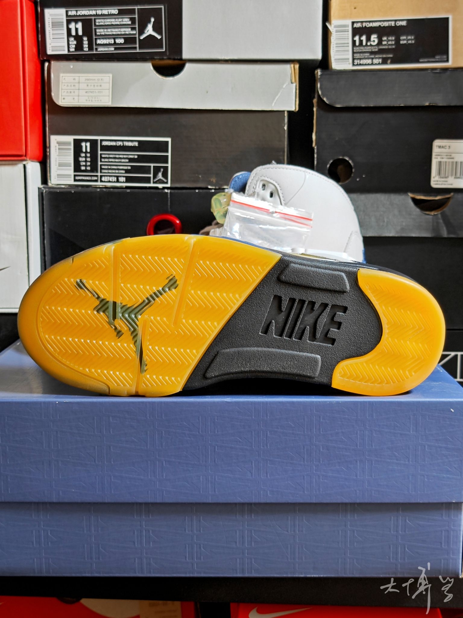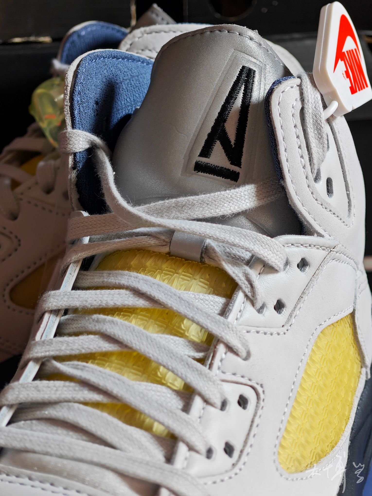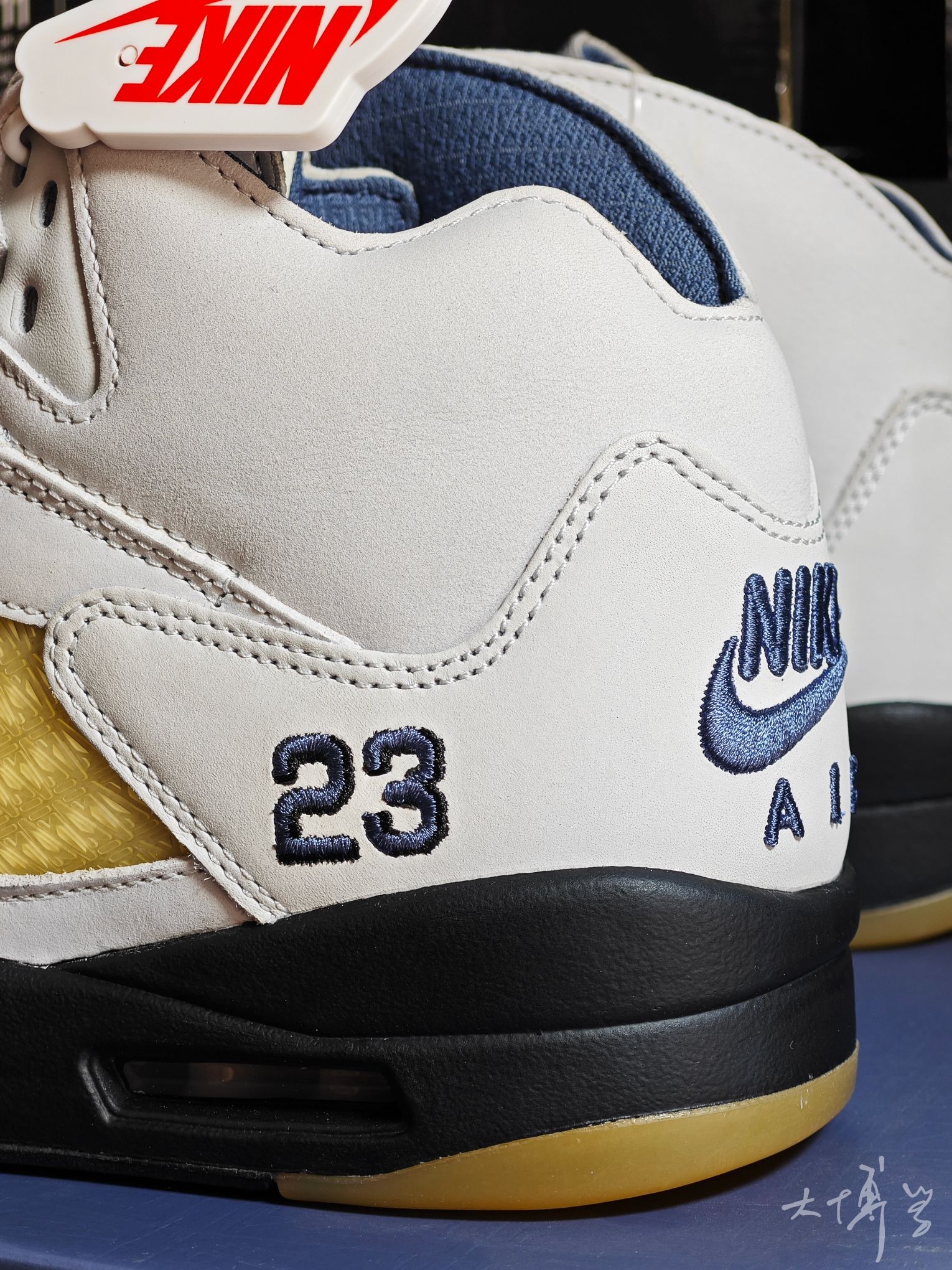 一双A Ma Maniére联名AJ5 以“光子尘”浅灰为主调 搭配扩散蓝、淡象牙黄点缀 整体色调柔和高级,自带复古做旧感 透气网眼带有amm的暗纹Logo 后跟有立体Nike Air标识 内衬是定制暗纹布料,这个设计我很喜欢 中底保留AJ5标志性的“鲨鱼齿”设计 整体颜值很高
