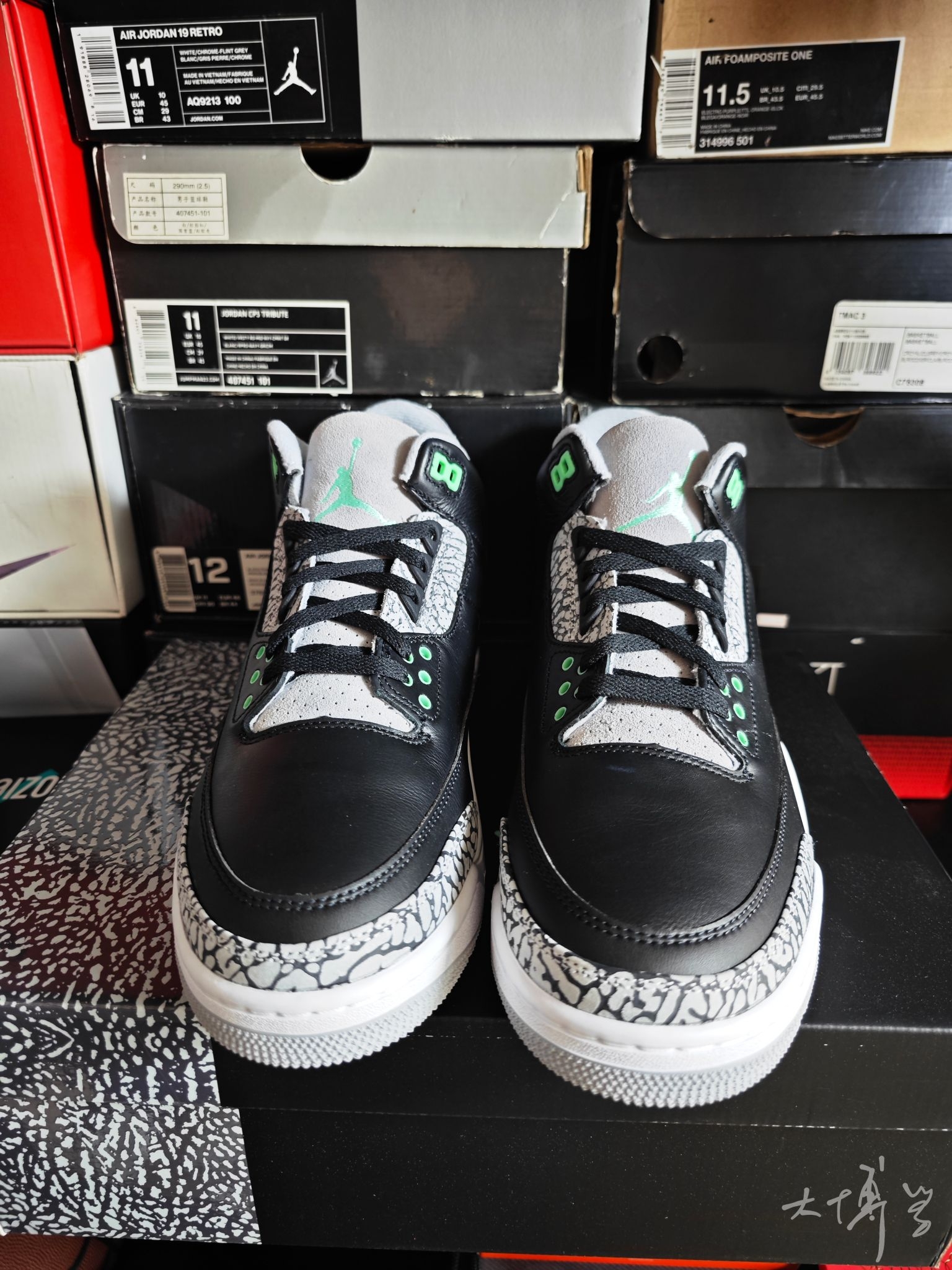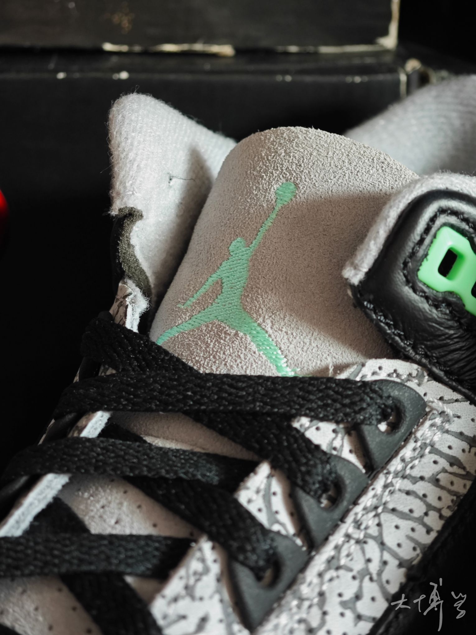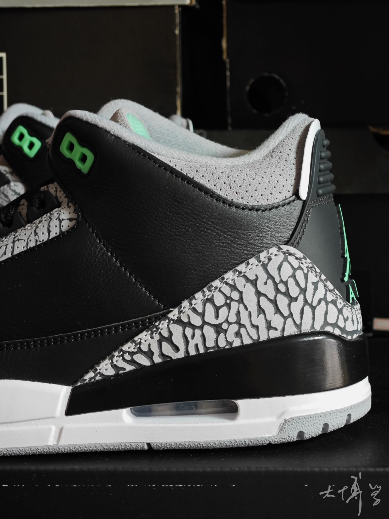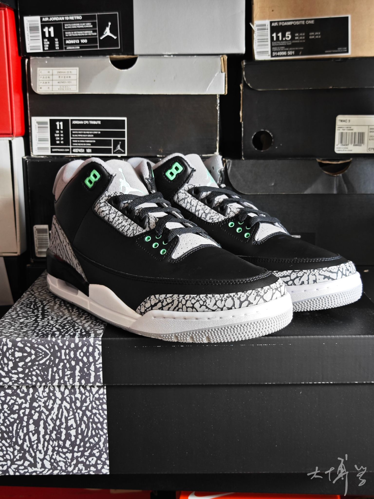 一双AJ 3 Retro "Green Glow" 经典+潮流撞色 黑色荔枝纹皮革为基底 搭配标志性爆裂纹(大象纹) 既保留AJ3的复古质感 又通过薄荷绿增加了潮流感 鞋面触感细腻且耐用 内衬是我一直不太喜欢的毛糙面料 好在价格合理