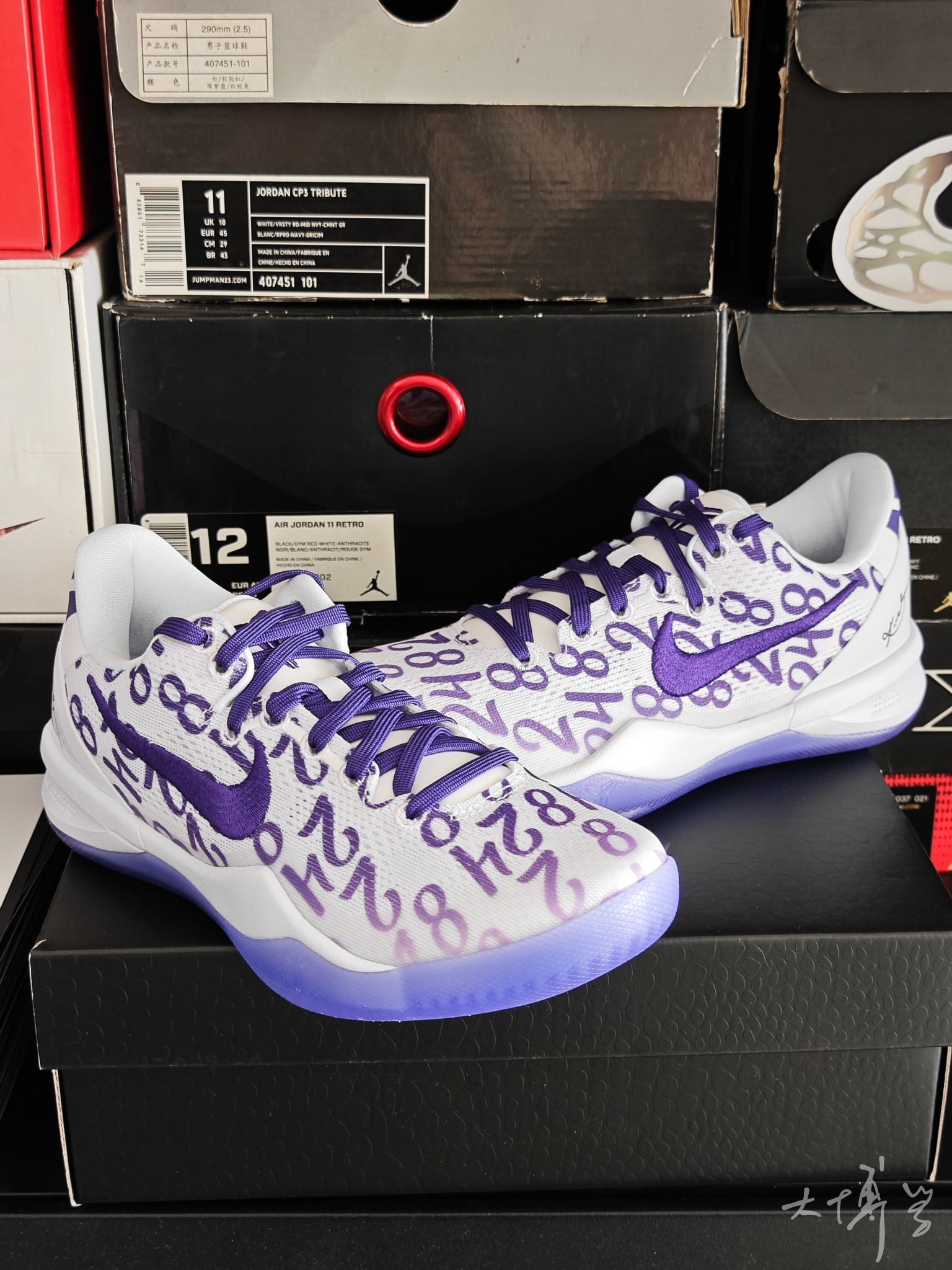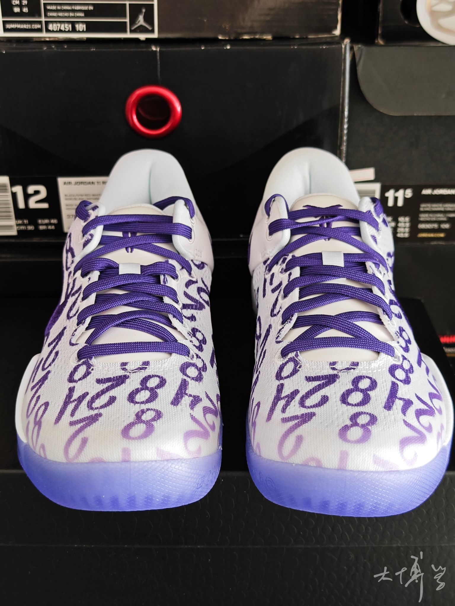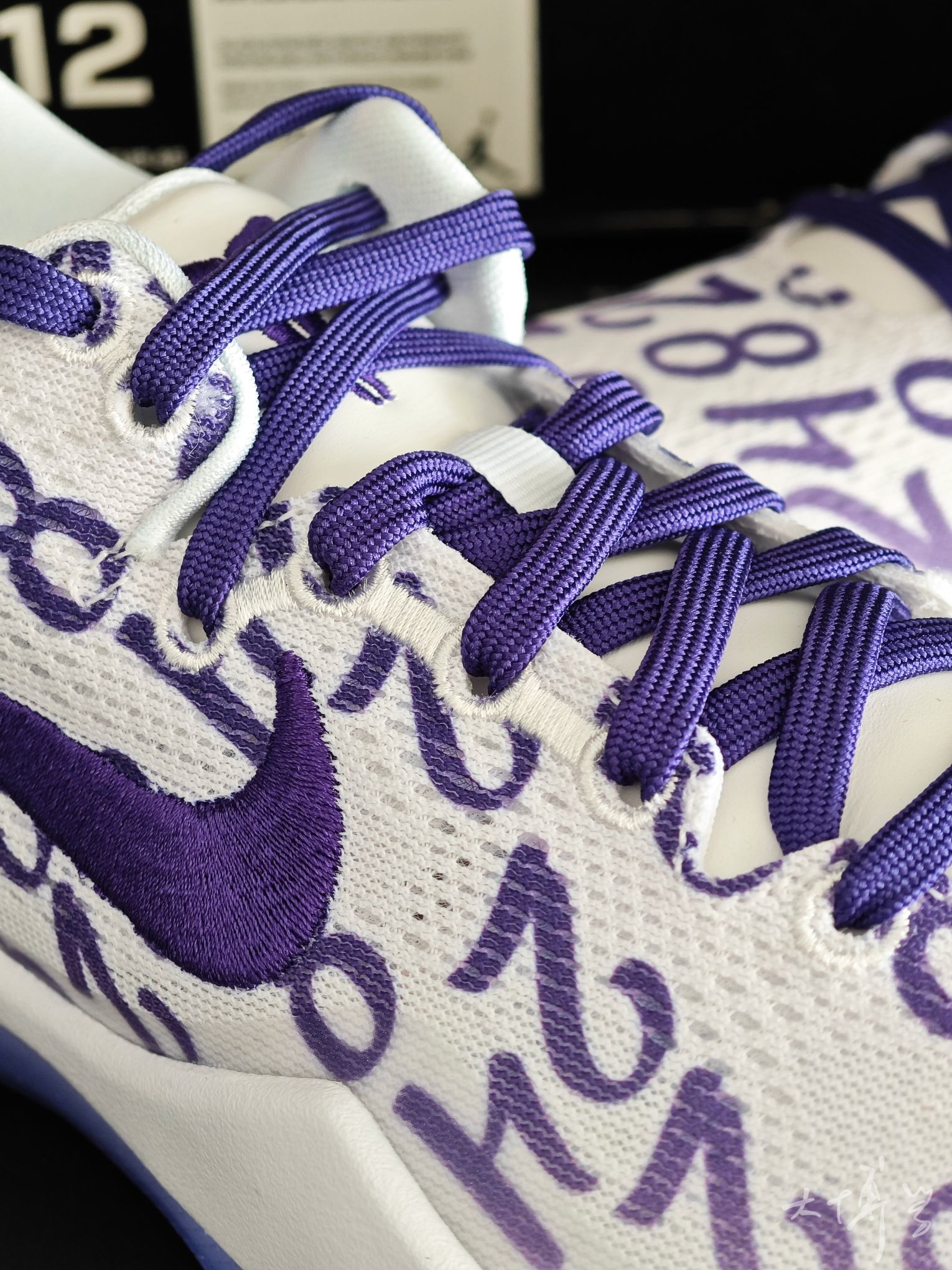 一双复刻的科比8代 鞋面以科比的湖人球衣号码(8号、24号)+女儿Gigi的2号为满印图案 搭配白紫配色,致敬科比父女的篮球传承 鞋面是透气工程网布 中底升级为React泡棉(比元年Lunarlon更耐用) 足弓处有抗扭片增强稳定性 外底是半透明紫水晶底 整体颜值够用,而且具有纪念意义